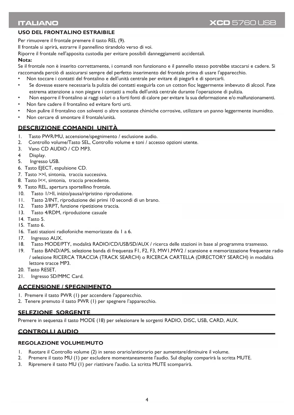NOTA: L'auto radio XCD 5760USB, potrebbe non supportare alcuni apparecchi esterni con presa USB, quello e dovuto all'incompatibilità dei processori.