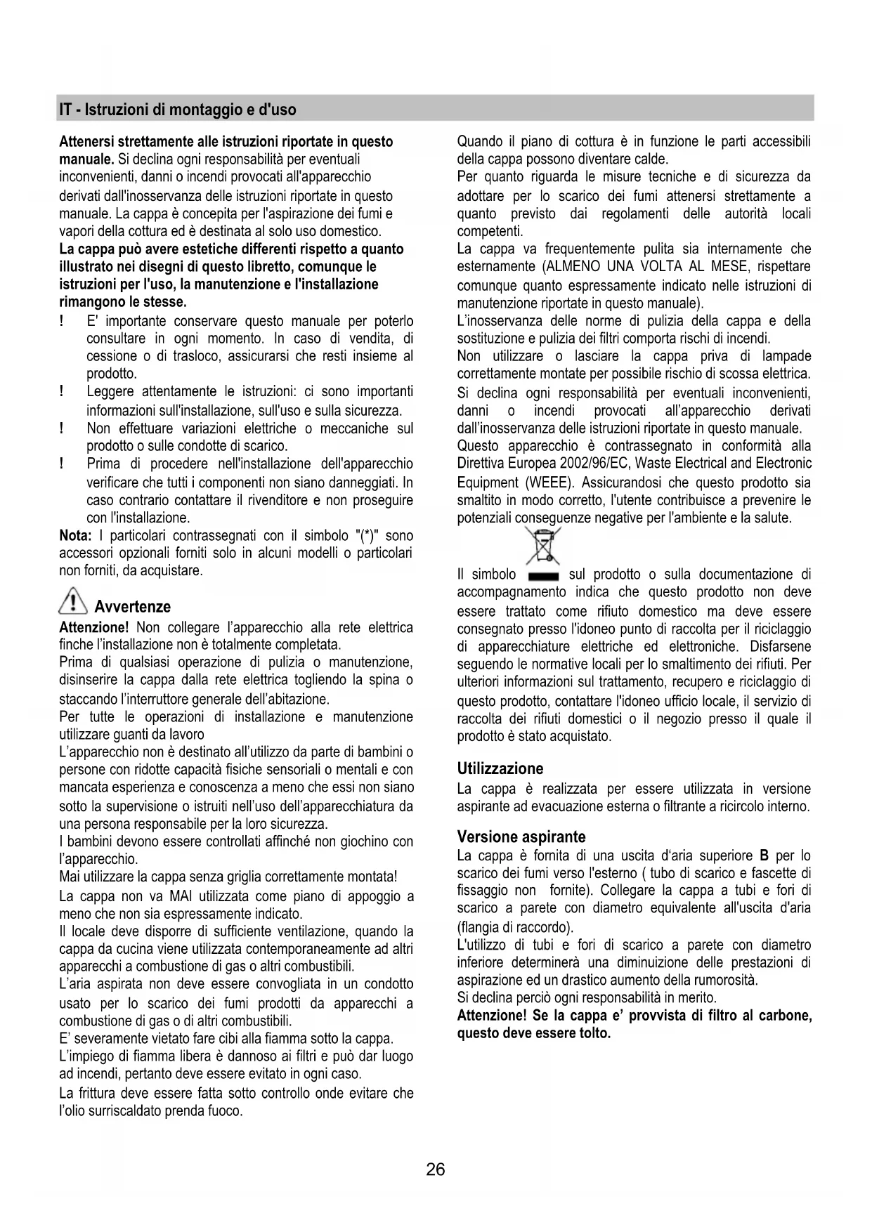 Dans l’éventualité où l’éclairage ne devait pas fonctionner, vérifier si les lampes ont été introduites correctement dans leur logement, avant de contacter le service après-vente.26 IT - Istruzioni di montaggio e d'uso Attenersi strettamente alle istruzioni riportate in questo manuale. Si declina ogni responsabilità per eventuali inconvenienti, danni o incendi provocati all'apparecchio derivati dall'inosservanza delle istruzioni riportate in questo manuale. La cappa è concepita per l'aspirazione dei fumi e vapori della cottura ed è destinata al solo uso domestico. La cappa può avere estetiche differenti rispetto a quanto illustrato nei disegni di questo libretto, comunque le istruzioni per l'uso, la manutenzione e l'installazione rimangono le stesse. ! E' importante conservare questo manuale per poterlo consultare in ogni momento. In caso di vendita, di cessione o di trasloco, assicurarsi che resti insieme al prodotto. ! Leggere attentamente le istruzioni: ci sono importanti informazioni sull'installazione, sull'uso e sulla sicurezza. ! Non effettuare variazioni elettriche o meccaniche sul prodotto o sulle condotte di scarico. ! Prima di procedere nell'installazione dell'apparecchio verificare che tutti i componenti non siano danneggiati. In caso contrario contattare il rivenditore e non proseguire con l'installazione. Nota: I particolari contrassegnati con il simbolo "(*)" sono accessori opzionali forniti solo in alcuni modelli o particolari non forniti, da acquistare. Avvertenze Attenzione! Non collegare l’apparecchio alla rete elettrica finche l’installazione non è totalmente completata. Prima di qualsiasi operazione di pulizia o manutenzione, disinserire la cappa dalla rete elettrica togliendo la spina o staccando l’interruttore generale dell’abitazione. Per tutte le operazioni di installazione e manutenzione utilizzare guanti da lavoro L’apparecchio non è destinato all’utilizzo da parte di bambini o persone con ridotte capacità fisiche sensoriali o mentali e con mancata esperienza e conoscenza a meno che essi non siano sotto la supervisione o istruiti nell’uso dell’apparecchiatura da una persona responsabile per la loro sicurezza. I bambini devono essere controllati affinché non giochino con l’apparecchio. Mai utilizzare la cappa senza griglia correttamente montata! La cappa non va MAI utilizzata come piano di appoggio a meno che non sia espressamente indicato. Il locale deve disporre di sufficiente ventilazione, quando la cappa da cucina viene utilizzata contemporaneamente ad altri apparecchi a combustione di gas o altri combustibili. L’aria aspirata non deve essere convogliata in un condotto usato per lo scarico dei fumi prodotti da apparecchi a combustione di gas o di altri combustibili. E’ severamente vietato fare cibi alla fiamma sotto la cappa. L’impiego di fiamma libera è dannoso ai filtri e può dar luogo ad incendi, pertanto deve essere evitato in ogni caso. La frittura deve essere fatta sotto controllo onde evitare che l’olio surriscaldato prenda fuoco. Quando il piano di cottura è in funzione le parti accessibili della cappa possono diventare calde. Per quanto riguarda le misure tecniche e di sicurezza da adottare per lo scarico dei fumi attenersi strettamente a quanto previsto dai regolamenti delle autorità locali competenti. La cappa va frequentemente pulita sia internamente che esternamente (ALMENO UNA VOLTA AL MESE, rispettare comunque quanto espressamente indicato nelle istruzioni di manutenzione riportate in questo manuale). L’inosservanza delle norme di pulizia della cappa e della sostituzione e pulizia dei filtri comporta rischi di incendi. Non utilizzare o lasciare la cappa priva di lampade correttamente montate per possibile rischio di scossa elettrica. Si declina ogni responsabilità per eventuali inconvenienti, danni o incendi provocati all’apparecchio derivati dall’inosservanza delle istruzioni riportate in questo manuale. Questo apparecchio è contrassegnato in conformità alla Direttiva Europea 2002/96/EC, Waste Electrical and Electronic Equipment (WEEE). Assicurandosi che questo prodotto sia smaltito in modo corretto, l'utente contribuisce a prevenire le potenziali conseguenze negative per l'ambiente e la salute. Il simbolo sul prodotto o sulla documentazione di accompagnamento indica che questo prodotto non deve essere trattato come rifiuto domestico ma deve essere consegnato presso l'idoneo punto di raccolta per il riciclaggio di apparecchiature elettriche ed elettroniche. Disfarsene seguendo le normative locali per lo smaltimento dei rifiuti. Per ulteriori informazioni sul trattamento, recupero e riciclaggio di questo prodotto, contattare l'idoneo ufficio locale, il servizio di raccolta dei rifiuti domestici o il negozio presso il quale il prodotto è stato acquistato. Utilizzazione La cappa è realizzata per essere utilizzata in versione aspirante ad evacuazione esterna o filtrante a ricircolo interno. Versione aspirante La cappa è fornita di una uscita d‘aria superiore B per lo scarico dei fumi verso l'esterno ( tubo di scarico e fascette di fissaggio non fornite). Collegare la cappa a tubi e fori di scarico a parete con diametro equivalente all'uscita d'aria (flangia di raccordo). L'utilizzo di tubi e fori di scarico a parete con diametro inferiore determinerà una diminuizione delle prestazioni di aspirazione ed un drastico aumento della rumorosità. Si declina perciò ogni responsabilità in merito. Attenzione! Se la cappa e’ provvista di filtro al carbone, questo deve essere tolto.27 Versione filtrante Nel caso non sia possibile scaricare i fumi e vapori della cottura verso l‘esterno, si può utilizzare la cappa in versione filtrante montando un filtro ai carboni attivi e il deflettore F sul supporto (staffa) G, i fumi e vapori vengono depurati attraverso la sgrigliatura superiore H tramite un tubo di scarico collegato all‘uscita d‘aria superiore B e l‘anello di connessione montat