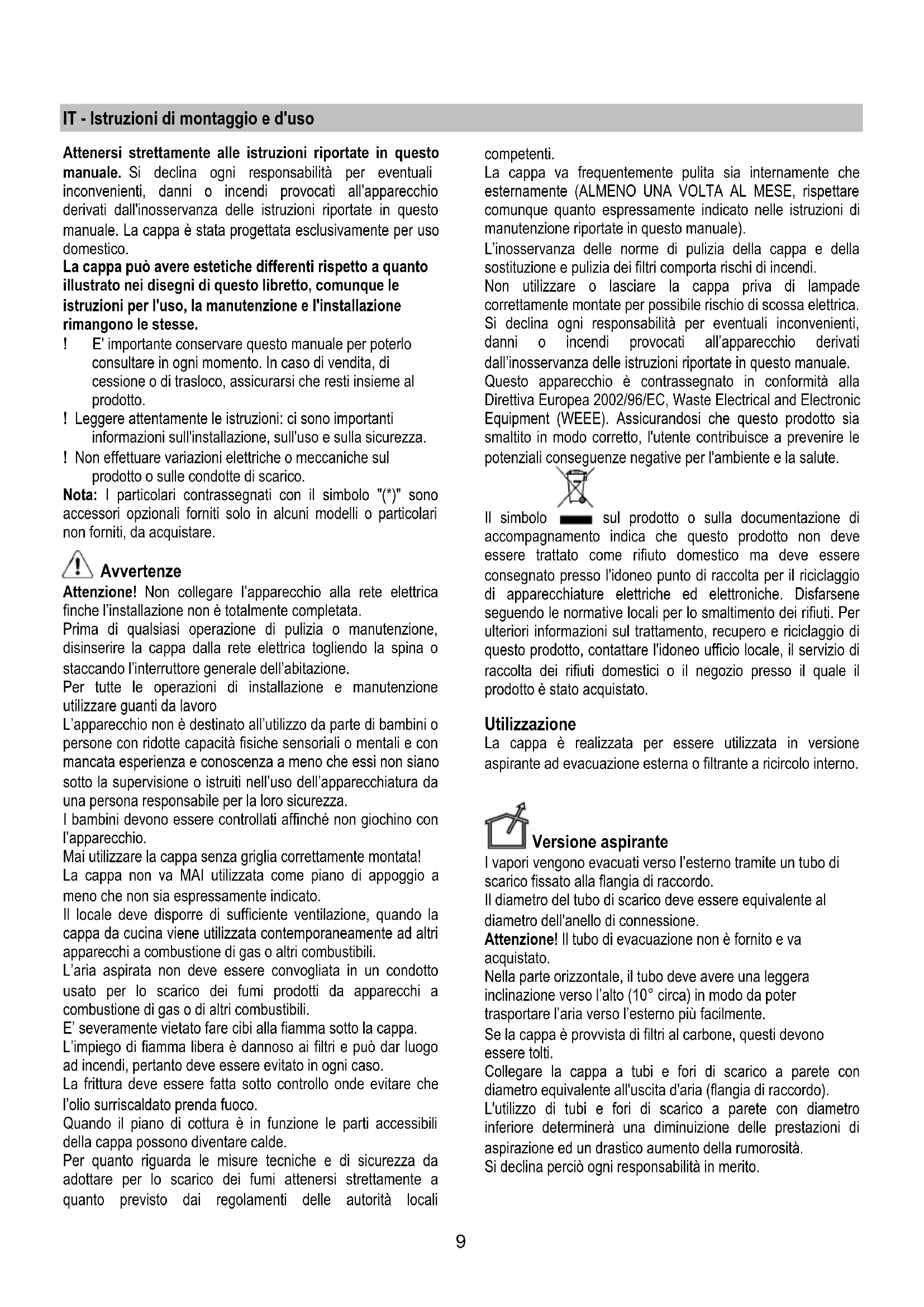 HU Felszerelési és használati utasítás SK Návod k montáži a užití SR Uputstva za montažu i upotrebu SL Navodila za montažo in uporabo UK Інструкція з монтажу і експлуатації LT montavimo ir naudojimosi instrukcija LV ierīkošanas un izmantošanas instrukcija ET Paigaldus- ja kasutusjuhend AR لﺎﻤﻌﺘﺳﻻاو ﺐﻴآﺮﺘﻟا قﺮﻃ9 IT - Istruzioni di montaggio e d'uso Attenersi strettamente alle istruzioni riportate in questo manuale. Si declina ogni responsabilità per eventuali inconvenienti, danni o incendi provocati all'apparecchio derivati dall'inosservanza delle istruzioni riportate in questo manuale. La cappa è stata progettata esclusivamente per uso domestico. La cappa può avere estetiche differenti rispetto a quanto illustrato nei disegni di questo libretto, comunque le istruzioni per l'uso, la manutenzione e l'installazione rimangono le stesse. ! E' importante conservare questo manuale per poterlo consultare in ogni momento. In caso di vendita, di cessione o di trasloco, assicurarsi che resti insieme al prodotto. ! Leggere attentamente le istruzioni: ci sono importanti informazioni sull'installazione, sull'uso e sulla sicurezza. ! Non effettuare variazioni elettriche o meccaniche sul prodotto o sulle condotte di scarico. Nota: I particolari contrassegnati con il simbolo "(*)" sono accessori opzionali forniti solo in alcuni modelli o particolari non forniti, da acquistare. Avvertenze Attenzione! Non collegare l’apparecchio alla rete elettrica finche l’installazione non è totalmente completata. Prima di qualsiasi operazione di pulizia o manutenzione, disinserire la cappa dalla rete elettrica togliendo la spina o staccando l’interruttore generale dell’abitazione. Per tutte le operazioni di installazione e manutenzione utilizzare guanti da lavoro L’apparecchio non è destinato all’utilizzo da parte di bambini o persone con ridotte capacità fisiche sensoriali o mentali e con mancata esperienza e conoscenza a meno che essi non siano sotto la supervisione o istruiti nell’uso dell’apparecchiatura da una persona responsabile per la loro sicurezza. I bambini devono essere controllati affinché non giochino con l’apparecchio. Mai utilizzare la cappa senza griglia correttamente montata! La cappa non va MAI utilizzata come piano di appoggio a meno che non sia espressamente indicato. Il locale deve disporre di sufficiente ventilazione, quando la cappa da cucina viene utilizzata contemporaneamente ad altri apparecchi a combustione di gas o altri combustibili. L’aria aspirata non deve essere convogliata in un condotto usato per lo scarico dei fumi prodotti da apparecchi a combustione di gas o di altri combustibili. E’ severamente vietato fare cibi alla fiamma sotto la cappa. L’impiego di fiamma libera è dannoso ai filtri e può dar luogo ad incendi, pertanto deve essere evitato in ogni caso. La frittura deve essere fatta sotto controllo onde evitare che l’olio surriscaldato prenda fuoco. Quando il piano di cottura è in funzione le parti accessibili della cappa possono diventare calde. Per quanto riguarda le misure tecniche e di sicurezza da adottare per lo scarico dei fumi attenersi strettamente a quanto previsto dai regolamenti delle autorità locali competenti. La cappa va frequentemente pulita sia internamente che esternamente (ALMENO UNA VOLTA AL MESE, rispettare comunque quanto espressamente indicato nelle istruzioni di manutenzione riportate in questo manuale). L’inosservanza delle norme di pulizia della cappa e della sostituzione e pulizia dei filtri comporta rischi di incendi. Non utilizzare o lasciare la cappa priva di lampade correttamente montate per possibile rischio di scossa elettrica. Si declina ogni responsabilità per eventuali inconvenienti, danni o incendi provocati all’apparecchio derivati dall’inosservanza delle istruzioni riportate in questo manuale. Questo apparecchio è contrassegnato in conformità alla Direttiva Europea 2002/96/EC, Waste Electrical and Electronic Equipment (WEEE). Assicurandosi che questo prodotto sia smaltito in modo corretto, l'utente contribuisce a prevenire le potenziali conseguenze negative per l'ambiente e la salute. Il simbolo sul prodotto o sulla documentazione di accompagnamento indica che questo prodotto non deve essere trattato come rifiuto domestico ma deve essere consegnato presso l'idoneo punto di raccolta per il riciclaggio di apparecchiature elettriche ed elettroniche. Disfarsene seguendo le normative locali per lo smaltimento dei rifiuti. Per ulteriori informazioni sul trattamento, recupero e riciclaggio di questo prodotto, contattare l'idoneo ufficio locale, il servizio di raccolta dei rifiuti domestici o il negozio presso il quale il prodotto è stato acquistato. Utilizzazione La cappa è realizzata per essere utilizzata in versione aspirante ad evacuazione esterna o filtrante a ricircolo interno. Versione aspirante I vapori vengono evacuati verso l’esterno tramite un tubo di scarico fissato alla flangia di raccordo. Il diametro del tubo di scarico deve essere equivalente al diametro dell'anello di connessione. Attenzione! Il tubo di evacuazione non è fornito e va acquistato. Nella parte orizzontale, il tubo deve avere una leggera inclinazione verso l’alto (10° circa) in modo da poter trasportare l’aria verso l’esterno più facilmente. Se la cappa è provvista di filtri al carbone, questi devono essere tolti. Collegare la cappa a tubi e fori di scarico a parete con diametro equivalente all'uscita d'aria (flangia di raccordo). L'utilizzo di tubi e fori di scarico a parete con diametro inferiore determinerà una diminuizione delle prestazioni di aspirazione ed un drastico aumento della rumorosità. Si declina perciò ogni responsabilità in merito.10 ! Usare un condotto lungo il minimo indispensabile. ! Usare un condotto con minor numero di curve possibile (angolo massimo della curva: 90°). ! Evitare cambiamenti drastici di sezion