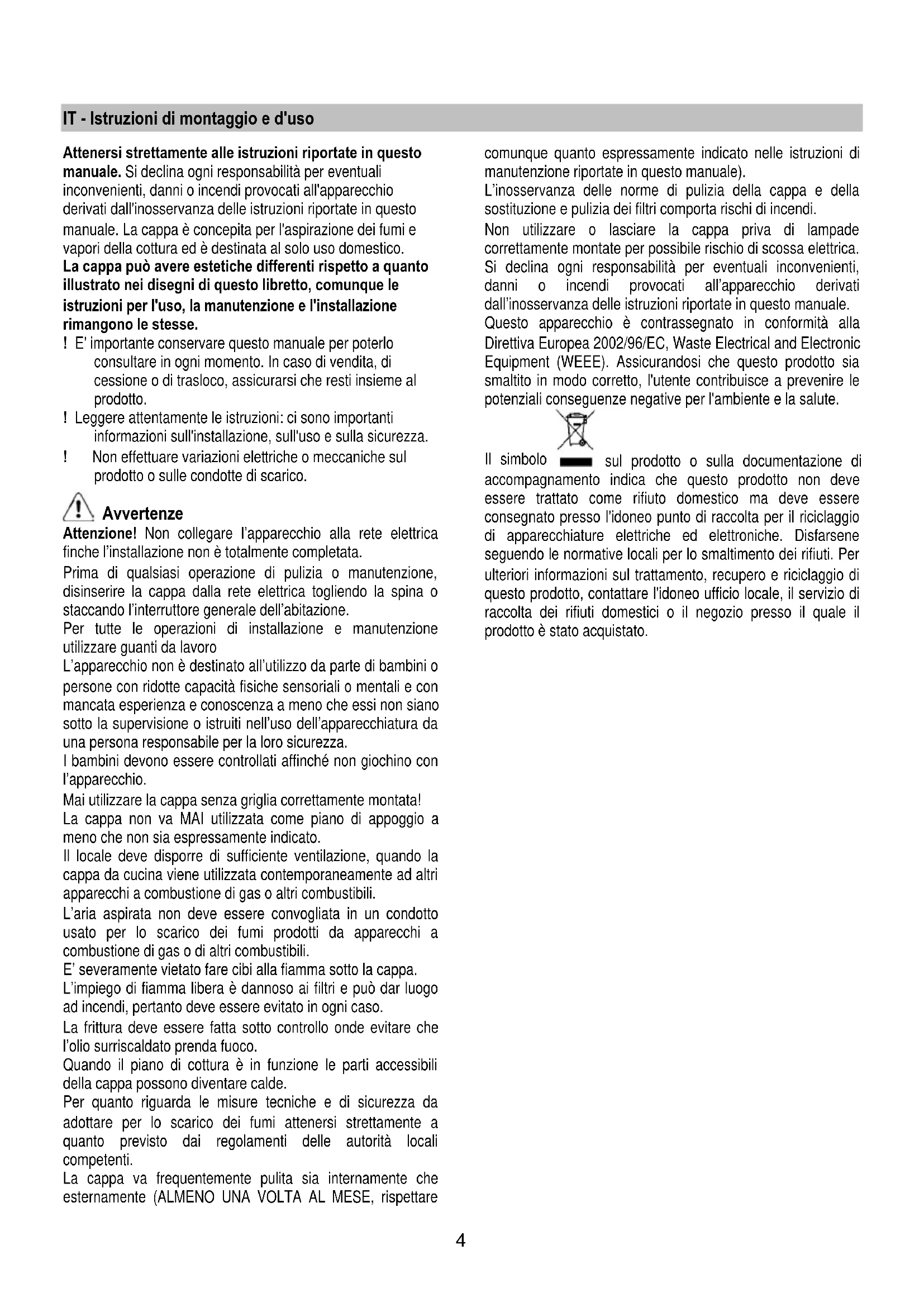 HU Felszerelési és használati utasítás SK Návod k montáži a užití SR Uputstva za montažu i upotrebu SL Navodila za montažo in uporabo UK Інструкція з монтажу і експлуатації LT montavimo ir naudojimosi instrukcija LV ierīkošanas un izmantošanas instrukcija ET Paigaldus- ja kasutusjuhend AR لﺎﻤﻌﺘﺳﻻاو ﺐﻴآﺮﺘﻟا قﺮﻃ4 IT - Istruzioni di montaggio e d'uso Attenersi strettamente alle istruzioni riportate in questo manuale. Si declina ogni responsabilità per eventuali inconvenienti, danni o incendi provocati all'apparecchio derivati dall'inosservanza delle istruzioni riportate in questo manuale. La cappa è concepita per l'aspirazione dei fumi e vapori della cottura ed è destinata al solo uso domestico. La cappa può avere estetiche differenti rispetto a quanto illustrato nei disegni di questo libretto, comunque le istruzioni per l'uso, la manutenzione e l'installazione rimangono le stesse. ! E' importante conservare questo manuale per poterlo consultare in ogni momento. In caso di vendita, di cessione o di trasloco, assicurarsi che resti insieme al prodotto. ! Leggere attentamente le istruzioni: ci sono importanti informazioni sull'installazione, sull'uso e sulla sicurezza. ! Non effettuare variazioni elettriche o meccaniche sul prodotto o sulle condotte di scarico. Avvertenze Attenzione! Non collegare l’apparecchio alla rete elettrica finche l’installazione non è totalmente completata. Prima di qualsiasi operazione di pulizia o manutenzione, disinserire la cappa dalla rete elettrica togliendo la spina o staccando l’interruttore generale dell’abitazione. Per tutte le operazioni di installazione e manutenzione utilizzare guanti da lavoro L’apparecchio non è destinato all’utilizzo da parte di bambini o persone con ridotte capacità fisiche sensoriali o mentali e con mancata esperienza e conoscenza a meno che essi non siano sotto la supervisione o istruiti nell’uso dell’apparecchiatura da una persona responsabile per la loro sicurezza. I bambini devono essere controllati affinché non giochino con l’apparecchio. Mai utilizzare la cappa senza griglia correttamente montata! La cappa non va MAI utilizzata come piano di appoggio a meno che non sia espressamente indicato. Il locale deve disporre di sufficiente ventilazione, quando la cappa da cucina viene utilizzata contemporaneamente ad altri apparecchi a combustione di gas o altri combustibili. L’aria aspirata non deve essere convogliata in un condotto usato per lo scarico dei fumi prodotti da apparecchi a combustione di gas o di altri combustibili. E’ severamente vietato fare cibi alla fiamma sotto la cappa. L’impiego di fiamma libera è dannoso ai filtri e può dar luogo ad incendi, pertanto deve essere evitato in ogni caso. La frittura deve essere fatta sotto controllo onde evitare che l’olio surriscaldato prenda fuoco. Quando il piano di cottura è in funzione le parti accessibili della cappa possono diventare calde. Per quanto riguarda le misure tecniche e di sicurezza da adottare per lo scarico dei fumi attenersi strettamente a quanto previsto dai regolamenti delle autorità locali competenti. La cappa va frequentemente pulita sia internamente che esternamente (ALMENO UNA VOLTA AL MESE, rispettare comunque quanto espressamente indicato nelle istruzioni di manutenzione riportate in questo manuale). L’inosservanza delle norme di pulizia della cappa e della sostituzione e pulizia dei filtri comporta rischi di incendi. Non utilizzare o lasciare la cappa priva di lampade correttamente montate per possibile rischio di scossa elettrica. Si declina ogni responsabilità per eventuali inconvenienti, danni o incendi provocati all’apparecchio derivati dall’inosservanza delle istruzioni riportate in questo manuale. Questo apparecchio è contrassegnato in conformità alla Direttiva Europea 2002/96/EC, Waste Electrical and Electronic Equipment (WEEE). Assicurandosi che questo prodotto sia smaltito in modo corretto, l'utente contribuisce a prevenire le potenziali conseguenze negative per l'ambiente e la salute. Il simbolo sul prodotto o sulla documentazione di accompagnamento indica che questo prodotto non deve essere trattato come rifiuto domestico ma deve essere consegnato presso l'idoneo punto di raccolta per il riciclaggio di apparecchiature elettriche ed elettroniche. Disfarsene seguendo le normative locali per lo smaltimento dei rifiuti. Per ulteriori informazioni sul trattamento, recupero e riciclaggio di questo prodotto, contattare l'idoneo ufficio locale, il servizio di raccolta dei rifiuti domestici o il negozio presso il quale il prodotto è stato acquistato.5 Utilizzazione La cappa è realizzata per essere utilizzata in versione aspirante ad evacuazione esterna o filtrante a ricircolo interno. Versione aspirante I vapori vengono evacuati verso l’esterno tramite un tubo di scarico fissato alla flangia di raccordo. Il diametro del tubo di scarico deve essere equivalente al diametro dell'anello di connessione. Attenzione! Il tubo di evacuazione non è fornito e va acquistato. Nella parte orizzontale, il tubo deve avere una leggera inclinazione verso l’alto (10° circa) in modo da poter trasportare l’aria verso l’esterno più facilmente. Se la cappa è provvista di filtri al carbone, questi devono essere tolti. Collegare la cappa a tubi e fori di scarico a parete con diametro equivalente all'uscita d'aria (flangia di raccordo). L'utilizzo di tubi e fori di scarico a parete con diametro inferiore determinerà una diminuizione delle prestazioni di aspirazione ed un drastico aumento della rumorosità. Si declina perciò ogni responsabilità in merito. ! Usare un condotto lungo il minimo indispensabile. ! Usare un condotto con minor numero di curve possibile (angolo massimo della curva: 90°). ! Evitare cambiamenti drastici di sezione del condotto. ! Usare un condotto con l’interno piu’ liscio possibile. ! Il materiale del condotto de
