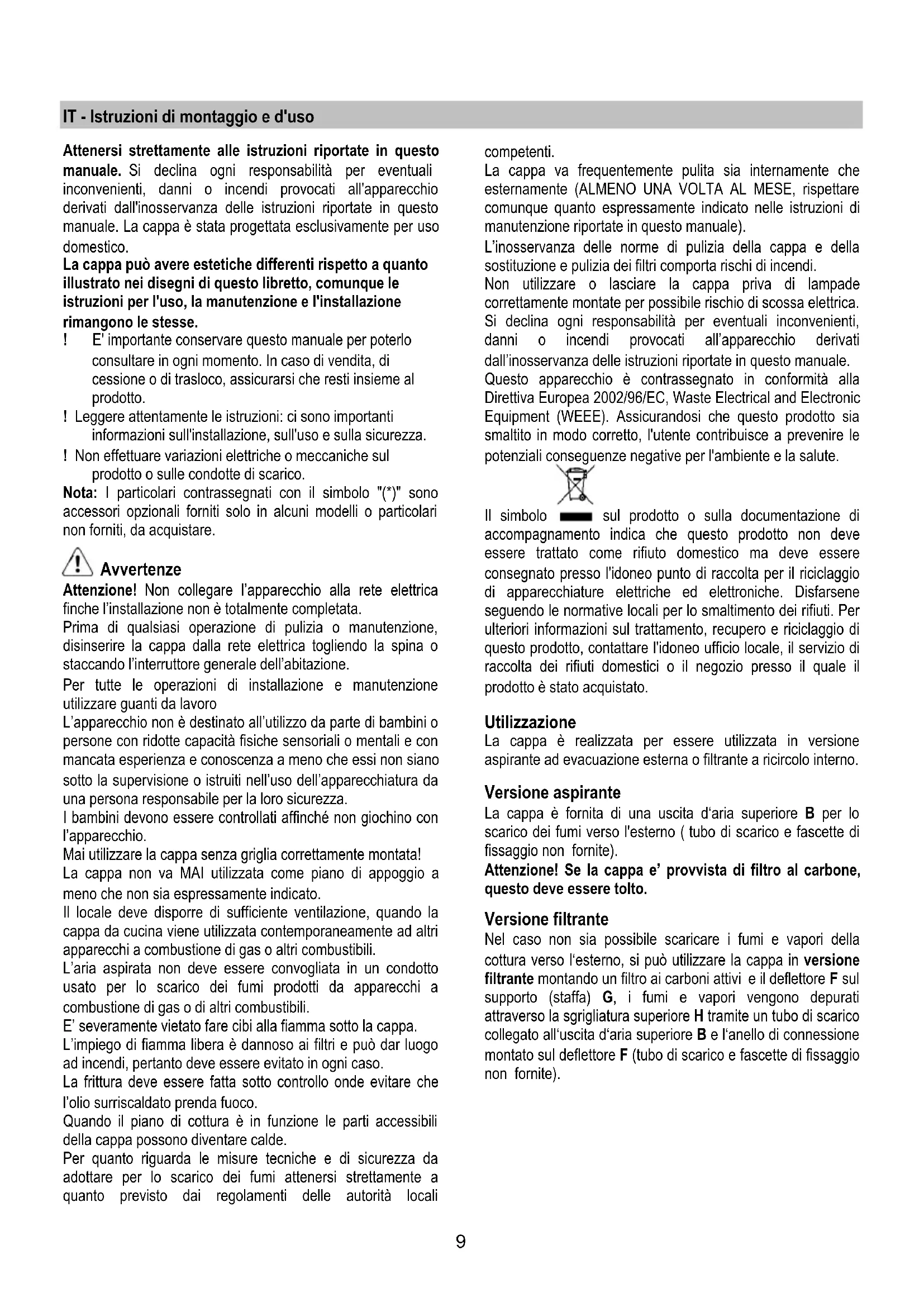 HU Felszerelési és használati utasítás SK Návod k montáži a užití SR Uputstva za montažu i upotrebu SL Navodila za montažo in uporabo UK Інструкція з монтажу і експлуатації LV ierīkošanas un izmantošanas instrukcija LT montavimo ir naudojimosi instrukcija ET Paigaldus- ja kasutusjuhend AR لﺎﻤﻌﺘﺳﻻاو ﺐﻴآﺮﺘﻟا قﺮﻃ89 IT - Istruzioni di montaggio e d'uso Attenersi strettamente alle istruzioni riportate in questo manuale. Si declina ogni responsabilità per eventuali inconvenienti, danni o incendi provocati all'apparecchio derivati dall'inosservanza delle istruzioni riportate in questo manuale. La cappa è stata progettata esclusivamente per uso domestico. La cappa può avere estetiche differenti rispetto a quanto illustrato nei disegni di questo libretto, comunque le istruzioni per l'uso, la manutenzione e l'installazione rimangono le stesse. ! E' importante conservare questo manuale per poterlo consultare in ogni momento. In caso di vendita, di cessione o di trasloco, assicurarsi che resti insieme al prodotto. ! Leggere attentamente le istruzioni: ci sono importanti informazioni sull'installazione, sull'uso e sulla sicurezza. ! Non effettuare variazioni elettriche o meccaniche sul prodotto o sulle condotte di scarico. Nota: I particolari contrassegnati con il simbolo "(*)" sono accessori opzionali forniti solo in alcuni modelli o particolari non forniti, da acquistare. Avvertenze Attenzione! Non collegare l’apparecchio alla rete elettrica finche l’installazione non è totalmente completata. Prima di qualsiasi operazione di pulizia o manutenzione, disinserire la cappa dalla rete elettrica togliendo la spina o staccando l’interruttore generale dell’abitazione. Per tutte le operazioni di installazione e manutenzione utilizzare guanti da lavoro L’apparecchio non è destinato all’utilizzo da parte di bambini o persone con ridotte capacità fisiche sensoriali o mentali e con mancata esperienza e conoscenza a meno che essi non siano sotto la supervisione o istruiti nell’uso dell’apparecchiatura da una persona responsabile per la loro sicurezza. I bambini devono essere controllati affinché non giochino con l’apparecchio. Mai utilizzare la cappa senza griglia correttamente montata! La cappa non va MAI utilizzata come piano di appoggio a meno che non sia espressamente indicato. Il locale deve disporre di sufficiente ventilazione, quando la cappa da cucina viene utilizzata contemporaneamente ad altri apparecchi a combustione di gas o altri combustibili. L’aria aspirata non deve essere convogliata in un condotto usato per lo scarico dei fumi prodotti da apparecchi a combustione di gas o di altri combustibili. E’ severamente vietato fare cibi alla fiamma sotto la cappa. L’impiego di fiamma libera è dannoso ai filtri e può dar luogo ad incendi, pertanto deve essere evitato in ogni caso. La frittura deve essere fatta sotto controllo onde evitare che l’olio surriscaldato prenda fuoco. Quando il piano di cottura è in funzione le parti accessibili della cappa possono diventare calde. Per quanto riguarda le misure tecniche e di sicurezza da adottare per lo scarico dei fumi attenersi strettamente a quanto previsto dai regolamenti delle autorità locali competenti. La cappa va frequentemente pulita sia internamente che esternamente (ALMENO UNA VOLTA AL MESE, rispettare comunque quanto espressamente indicato nelle istruzioni di manutenzione riportate in questo manuale). L’inosservanza delle norme di pulizia della cappa e della sostituzione e pulizia dei filtri comporta rischi di incendi. Non utilizzare o lasciare la cappa priva di lampade correttamente montate per possibile rischio di scossa elettrica. Si declina ogni responsabilità per eventuali inconvenienti, danni o incendi provocati all’apparecchio derivati dall’inosservanza delle istruzioni riportate in questo manuale. Questo apparecchio è contrassegnato in conformità alla Direttiva Europea 2002/96/EC, Waste Electrical and Electronic Equipment (WEEE). Assicurandosi che questo prodotto sia smaltito in modo corretto, l'utente contribuisce a prevenire le potenziali conseguenze negative per l'ambiente e la salute. Il simbolo sul prodotto o sulla documentazione di accompagnamento indica che questo prodotto non deve essere trattato come rifiuto domestico ma deve essere consegnato presso l'idoneo punto di raccolta per il riciclaggio di apparecchiature elettriche ed elettroniche. Disfarsene seguendo le normative locali per lo smaltimento dei rifiuti. Per ulteriori informazioni sul trattamento, recupero e riciclaggio di questo prodotto, contattare l'idoneo ufficio locale, il servizio di raccolta dei rifiuti domestici o il negozio presso il quale il prodotto è stato acquistato. Utilizzazione La cappa è realizzata per essere utilizzata in versione aspirante ad evacuazione esterna o filtrante a ricircolo interno. Versione aspirante La cappa è fornita di una uscita d‘aria superiore B per lo scarico dei fumi verso l'esterno ( tubo di scarico e fascette di fissaggio non fornite). Attenzione! Se la cappa e’ provvista di filtro al carbone, questo deve essere tolto. Versione filtrante Nel caso non sia possibile scaricare i fumi e vapori della cottura verso l‘esterno, si può utilizzare la cappa in versione filtrante montando un filtro ai carboni attivi e il deflettore F sul supporto (staffa) G, i fumi e vapori vengono depurati attraverso la sgrigliatura superiore H tramite un tubo di scarico collegato all‘uscita d‘aria superiore B e l‘anello di connessione montato sul deflettore F (tubo di scarico e fascette di fissaggio non fornite).10 Attenzione! Se la cappa non è provvista di filtro al carbone, questo deve essere ordinato e montato prima dell’uso. I modelli senza motore di aspirazione funzionano solo in versione aspirante e debbono essere collegati ad una unità periferica di aspirazione (non fornita). Le istruzioni di collegamento sono forn