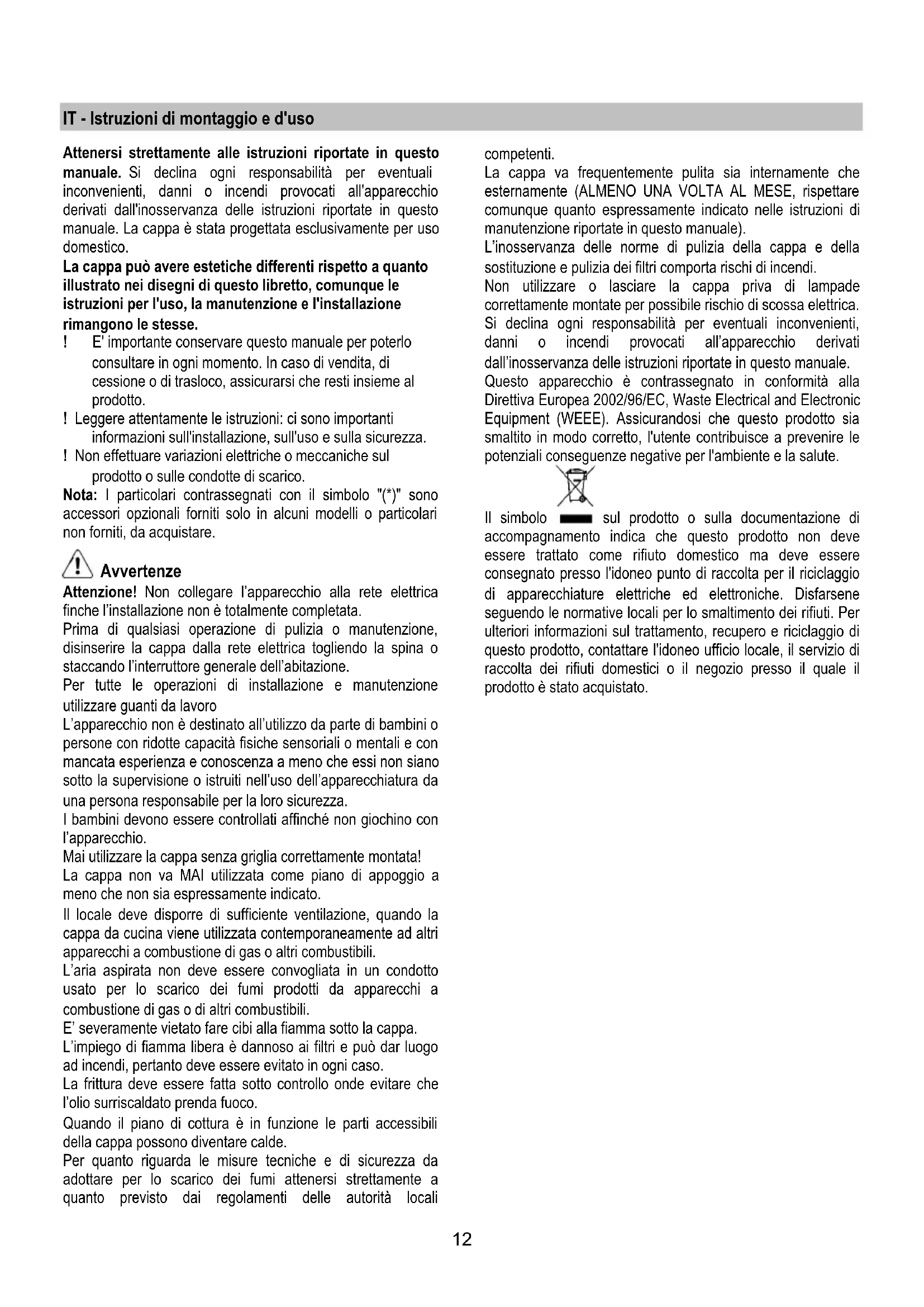 Attenersi strettamente alle istruzioni riportate in quello manuale. Si declina ogni responsabilità per eventuali inconvenienti, danni o incendi provocati all'appareccchio derivati dall'inosservanza delle istruzioni riportate in quello manuale. La cappa è stata progettata esclusivamente per uso domestico.