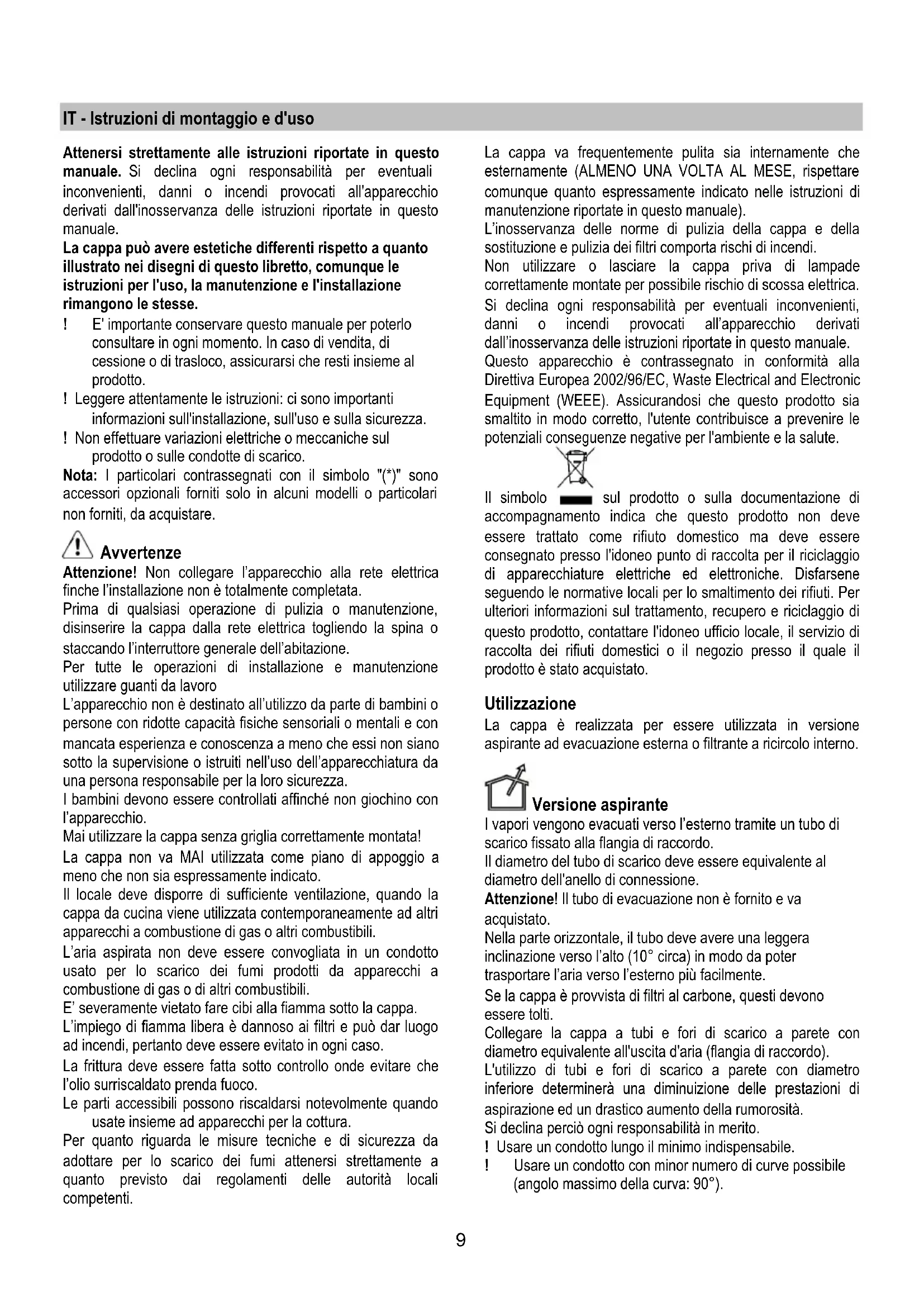 IT Istruzioni di montaggio e d'uso DE Montage- und Gebrauchsanweisung EN Instruction on mounting and use FR Prescriptions de montage et mode d’emploi NL Montagevoorschriften en gebruiksaanwijzingen ES Montaje y modo de empleo PT Instruções para montagem e utilização RU Инструкции по монтажу и эксплуатации9 IT - Istruzioni di montaggio e d'uso Attenersi strettamente alle istruzioni riportate in questo manuale. Si declina ogni responsabilità per eventuali inconvenienti, danni o incendi provocati all'apparecchio derivati dall'inosservanza delle istruzioni riportate in questo manuale. La cappa può avere estetiche differenti rispetto a quanto illustrato nei disegni di questo libretto, comunque le istruzioni per l'uso, la manutenzione e l'installazione rimangono le stesse. ! E' importante conservare questo manuale per poterlo consultare in ogni momento. In caso di vendita, di cessione o di trasloco, assicurarsi che resti insieme al prodotto. ! Leggere attentamente le istruzioni: ci sono importanti informazioni sull'installazione, sull'uso e sulla sicurezza. ! Non effettuare variazioni elettriche o meccaniche sul prodotto o sulle condotte di scarico. Nota: I particolari contrassegnati con il simbolo "(*)" sono accessori opzionali forniti solo in alcuni modelli o particolari non forniti, da acquistare. Avvertenze Attenzione! Non collegare l’apparecchio alla rete elettrica finche l’installazione non è totalmente completata. Prima di qualsiasi operazione di pulizia o manutenzione, disinserire la cappa dalla rete elettrica togliendo la spina o staccando l’interruttore generale dell’abitazione. Per tutte le operazioni di installazione e manutenzione utilizzare guanti da lavoro L’apparecchio non è destinato all’utilizzo da parte di bambini o persone con ridotte capacità fisiche sensoriali o mentali e con mancata esperienza e conoscenza a meno che essi non siano sotto la supervisione o istruiti nell’uso dell’apparecchiatura da una persona responsabile per la loro sicurezza. I bambini devono essere controllati affinché non giochino con l’apparecchio. Mai utilizzare la cappa senza griglia correttamente montata! La cappa non va MAI utilizzata come piano di appoggio a meno che non sia espressamente indicato. Il locale deve disporre di sufficiente ventilazione, quando la cappa da cucina viene utilizzata contemporaneamente ad altri apparecchi a combustione di gas o altri combustibili. L’aria aspirata non deve essere convogliata in un condotto usato per lo scarico dei fumi prodotti da apparecchi a combustione di gas o di altri combustibili. E’ severamente vietato fare cibi alla fiamma sotto la cappa. L’impiego di fiamma libera è dannoso ai filtri e può dar luogo ad incendi, pertanto deve essere evitato in ogni caso. La frittura deve essere fatta sotto controllo onde evitare che l’olio surriscaldato prenda fuoco. Le parti accessibili possono riscaldarsi notevolmente quando usate insieme ad apparecchi per la cottura. Per quanto riguarda le misure tecniche e di sicurezza da adottare per lo scarico dei fumi attenersi strettamente a quanto previsto dai regolamenti delle autorità locali competenti. La cappa va frequentemente pulita sia internamente che esternamente (ALMENO UNA VOLTA AL MESE, rispettare comunque quanto espressamente indicato nelle istruzioni di manutenzione riportate in questo manuale). L’inosservanza delle norme di pulizia della cappa e della sostituzione e pulizia dei filtri comporta rischi di incendi. Non utilizzare o lasciare la cappa priva di lampade correttamente montate per possibile rischio di scossa elettrica. Si declina ogni responsabilità per eventuali inconvenienti, danni o incendi provocati all’apparecchio derivati dall’inosservanza delle istruzioni riportate in questo manuale. Questo apparecchio è contrassegnato in conformità alla Direttiva Europea 2002/96/EC, Waste Electrical and Electronic Equipment (WEEE). Assicurandosi che questo prodotto sia smaltito in modo corretto, l'utente contribuisce a prevenire le potenziali conseguenze negative per l'ambiente e la salute. Il simbolo sul prodotto o sulla documentazione di accompagnamento indica che questo prodotto non deve essere trattato come rifiuto domestico ma deve essere consegnato presso l'idoneo punto di raccolta per il riciclaggio di apparecchiature elettriche ed elettroniche. Disfarsene seguendo le normative locali per lo smaltimento dei rifiuti. Per ulteriori informazioni sul trattamento, recupero e riciclaggio di questo prodotto, contattare l'idoneo ufficio locale, il servizio di raccolta dei rifiuti domestici o il negozio presso il quale il prodotto è stato acquistato. Utilizzazione La cappa è realizzata per essere utilizzata in versione aspirante ad evacuazione esterna o filtrante a ricircolo interno. Versione aspirante I vapori vengono evacuati verso l’esterno tramite un tubo di scarico fissato alla flangia di raccordo. Il diametro del tubo di scarico deve essere equivalente al diametro dell'anello di connessione. Attenzione! Il tubo di evacuazione non è fornito e va acquistato. Nella parte orizzontale, il tubo deve avere una leggera inclinazione verso l’alto (10° circa) in modo da poter trasportare l’aria verso l’esterno più facilmente. Se la cappa è provvista di filtri al carbone, questi devono essere tolti. Collegare la cappa a tubi e fori di scarico a parete con diametro equivalente all'uscita d'aria (flangia di raccordo). L'utilizzo di tubi e fori di scarico a parete con diametro inferiore determinerà una diminuizione delle prestazioni di aspirazione ed un drastico aumento della rumorosità. Si declina perciò ogni responsabilità in merito. ! Usare un condotto lungo il minimo indispensabile. ! Usare un condotto con minor numero di curve possibile (angolo massimo della curva: 90°).10 ! Evitare cambiamenti drastici di sezione del condotto. ! Usare un condotto con l’interno piu’ liscio possibile. ! Il materiale del condott