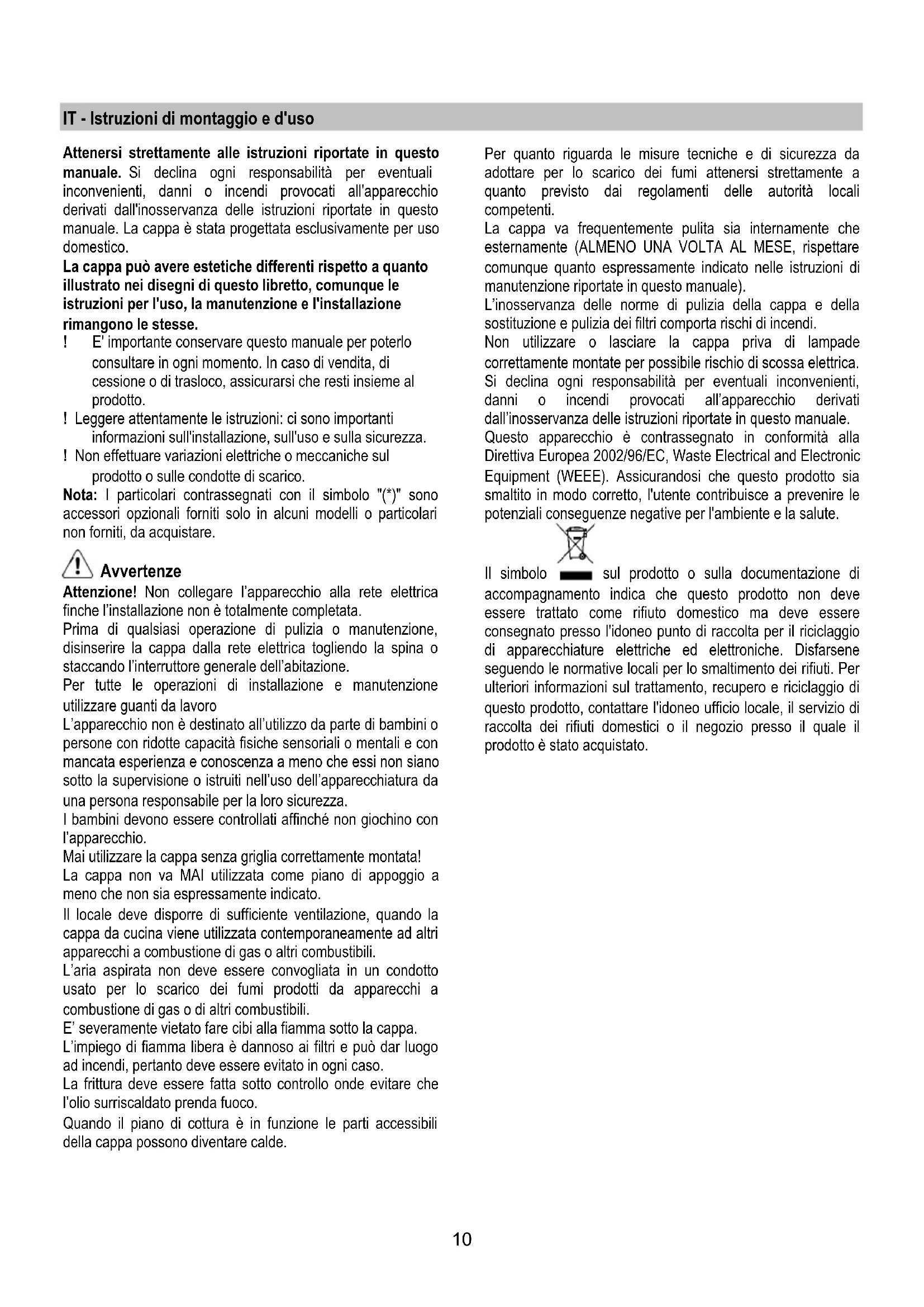 HU Felszerelési és használati utasítás SK Návod k montáži a užití SR Uputstva za montažu i upotrebu SL Navodila za montažo in uporabo UK Інструкція з монтажу і експлуатації LT montavimo ir naudojimosi instrukcija LV ierīkošanas un izmantošanas instrukcija ET Paigaldus- ja kasutusjuhend AR طرق التركيب والاستعمال10 IT - Istruzioni di montaggio e d'uso Attenersi strettamente alle istruzioni riportate in questo manuale. Si declina ogni responsabilità per eventuali inconvenienti, danni o incendi provocati all'apparecchio derivati dall'inosservanza delle istruzioni riportate in questo manuale. La cappa è stata progettata esclusivamente per uso domestico. La cappa può avere estetiche differenti rispetto a quanto illustrato nei disegni di questo libretto, comunque le istruzioni per l'uso, la manutenzione e l'installazione rimangono le stesse. ! E' importante conservare questo manuale per poterlo consultare in ogni momento. In caso di vendita, di cessione o di trasloco, assicurarsi che resti insieme al prodotto. ! Leggere attentamente le istruzioni: ci sono importanti informazioni sull'installazione, sull'uso e sulla sicurezza. ! Non effettuare variazioni elettriche o meccaniche sul prodotto o sulle condotte di scarico. Nota: I particolari contrassegnati con il simbolo "(*)" sono accessori opzionali forniti solo in alcuni modelli o particolari non forniti, da acquistare. Avvertenze Attenzione! Non collegare l’apparecchio alla rete elettrica finche l’installazione non è totalmente completata. Prima di qualsiasi operazione di pulizia o manutenzione, disinserire la cappa dalla rete elettrica togliendo la spina o staccando l’interruttore generale dell’abitazione. Per tutte le operazioni di installazione e manutenzione utilizzare guanti da lavoro L’apparecchio non è destinato all’utilizzo da parte di bambini o persone con ridotte capacità fisiche sensoriali o mentali e con mancata esperienza e conoscenza a meno che essi non siano sotto la supervisione o istruiti nell’uso dell’apparecchiatura da una persona responsabile per la loro sicurezza. I bambini devono essere controllati affinché non giochino con l’apparecchio. Mai utilizzare la cappa senza griglia correttamente montata! La cappa non va MAI utilizzata come piano di appoggio a meno che non sia espressamente indicato. Il locale deve disporre di sufficiente ventilazione, quando la cappa da cucina viene utilizzata contemporaneamente ad altri apparecchi a combustione di gas o altri combustibili. L’aria aspirata non deve essere convogliata in un condotto usato per lo scarico dei fumi prodotti da apparecchi a combustione di gas o di altri combustibili. E’ severamente vietato fare cibi alla fiamma sotto la cappa. L’impiego di fiamma libera è dannoso ai filtri e può dar luogo ad incendi, pertanto deve essere evitato in ogni caso. La frittura deve essere fatta sotto controllo onde evitare che l’olio surriscaldato prenda fuoco. Quando il piano di cottura è in funzione le parti accessibili della cappa possono diventare calde. Per quanto riguarda le misure tecniche e di sicurezza da adottare per lo scarico dei fumi attenersi strettamente a quanto previsto dai regolamenti delle autorità locali competenti. La cappa va frequentemente pulita sia internamente che esternamente (ALMENO UNA VOLTA AL MESE, rispettare comunque quanto espressamente indicato nelle istruzioni di manutenzione riportate in questo manuale). L’inosservanza delle norme di pulizia della cappa e della sostituzione e pulizia dei filtri comporta rischi di incendi. Non utilizzare o lasciare la cappa priva di lampade correttamente montate per possibile rischio di scossa elettrica. Si declina ogni responsabilità per eventuali inconvenienti, danni o incendi provocati all’apparecchio derivati dall’inosservanza delle istruzioni riportate in questo manuale. Questo apparecchio è contrassegnato in conformità alla Direttiva Europea 2002/96/EC, Waste Electrical and Electronic Equipment (WEEE). Assicurandosi che questo prodotto sia smaltito in modo corretto, l'utente contribuisce a prevenire le potenziali conseguenze negative per l'ambiente e la salute. Il simbolo sul prodotto o sulla documentazione di accompagnamento indica che questo prodotto non deve essere trattato come rifiuto domestico ma deve essere consegnato presso l'idoneo punto di raccolta per il riciclaggio di apparecchiature elettriche ed elettroniche. Disfarsene seguendo le normative locali per lo smaltimento dei rifiuti. Per ulteriori informazioni sul trattamento, recupero e riciclaggio di questo prodotto, contattare l'idoneo ufficio locale, il servizio di raccolta dei rifiuti domestici o il negozio presso il quale il prodotto è stato acquistato.11 Utilizzazione La cappa è realizzata per essere utilizzata in versione aspirante ad evacuazione esterna o filtrante a ricircolo interno. Versione aspirante I vapori vengono evacuati verso l’esterno tramite un tubo di scarico fissato alla flangia di raccordo. Il diametro del tubo di scarico deve essere equivalente al diametro dell'anello di connessione. Attenzione! Il tubo di evacuazione non è fornito e va acquistato. Nella parte orizzontale, il tubo deve avere una leggera inclinazione verso l’alto (10° circa) in modo da poter trasportare l’aria verso l’esterno più facilmente. Se la cappa è provvista di filtri al carbone, questi devono essere tolti. Collegare la cappa a tubi e fori di scarico a parete con diametro equivalente all'uscita d'aria (flangia di raccordo). L'utilizzo di tubi e fori di scarico a parete con diametro inferiore determinerà una diminuizione delle prestazioni di aspirazione ed un drastico aumento della rumorosità. Si declina perciò ogni responsabilità in merito. ! Usare un condotto lungo il minimo indispensabile. ! Usare un condotto con minor numero di curve possibile (angolo massimo della curva: 90°). ! Evitare cambiamenti drastici di sezione del cond