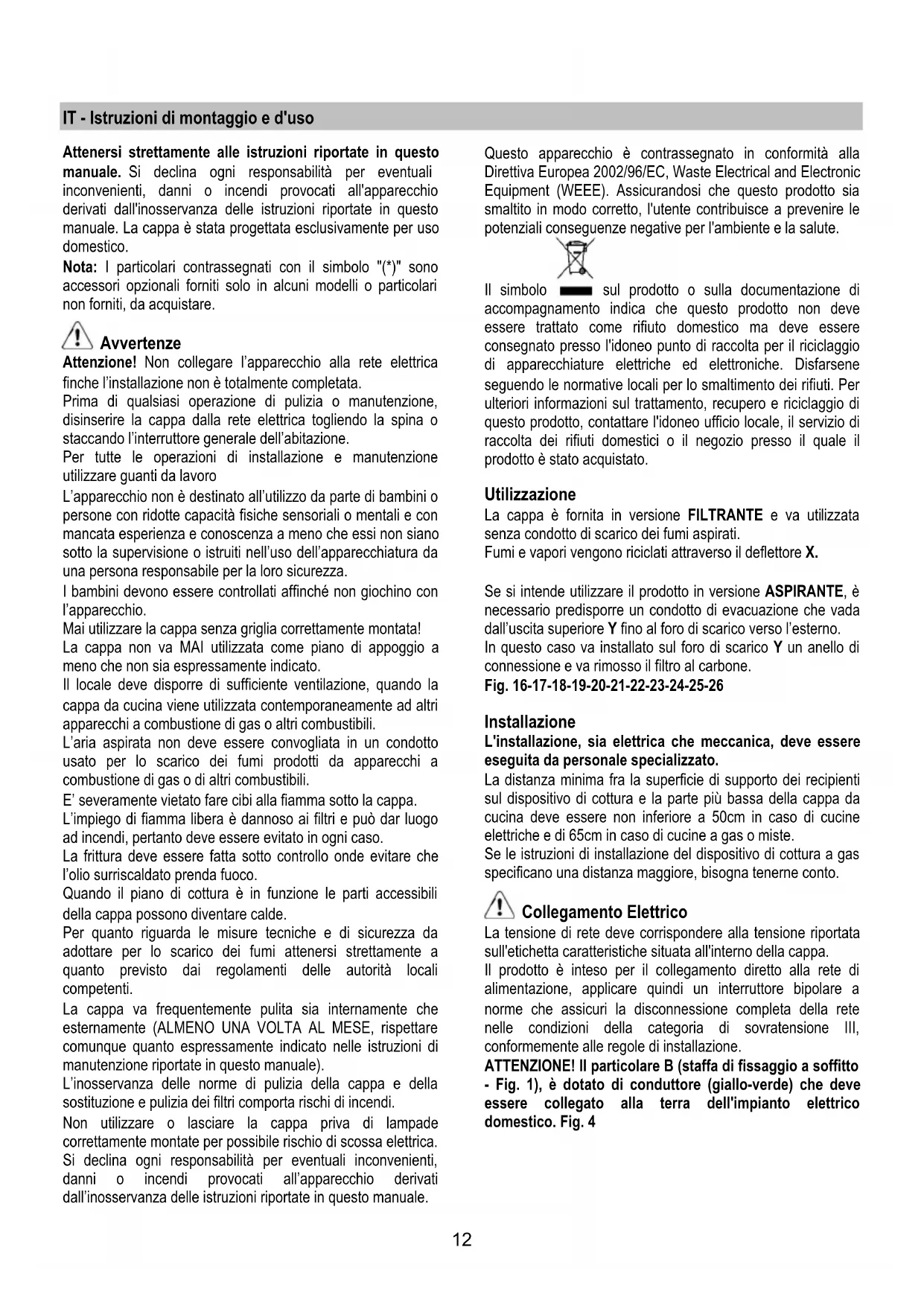 HU Felszerelési és használati utasítás SK Návod k montáži a užití SR Uputstva za montažu i upotrebu SL Navodila za montažo in uporabo UK Інструкція з монтажу і експлуатації LT montavimo ir naudojimosi instrukcija LV ierīkošanas un izmantošanas instrukcija ET Paigaldus- ja kasutusjuhend AR طرق التركيب والاستعمال12 IT - Istruzioni di montaggio e d'uso Attenersi strettamente alle istruzioni riportate in questo manuale. Si declina ogni responsabilità per eventuali inconvenienti, danni o incendi provocati all'apparecchio derivati dall'inosservanza delle istruzioni riportate in questo manuale. La cappa è stata progettata esclusivamente per uso domestico. Nota: I particolari contrassegnati con il simbolo "(*)" sono accessori opzionali forniti solo in alcuni modelli o particolari non forniti, da acquistare. Avvertenze Attenzione! Non collegare l’apparecchio alla rete elettrica finche l’installazione non è totalmente completata. Prima di qualsiasi operazione di pulizia o manutenzione, disinserire la cappa dalla rete elettrica togliendo la spina o staccando l’interruttore generale dell’abitazione. Per tutte le operazioni di installazione e manutenzione utilizzare guanti da lavoro L’apparecchio non è destinato all’utilizzo da parte di bambini o persone con ridotte capacità fisiche sensoriali o mentali e con mancata esperienza e conoscenza a meno che essi non siano sotto la supervisione o istruiti nell’uso dell’apparecchiatura da una persona responsabile per la loro sicurezza. I bambini devono essere controllati affinché non giochino con l’apparecchio. Mai utilizzare la cappa senza griglia correttamente montata! La cappa non va MAI utilizzata come piano di appoggio a meno che non sia espressamente indicato. Il locale deve disporre di sufficiente ventilazione, quando la cappa da cucina viene utilizzata contemporaneamente ad altri apparecchi a combustione di gas o altri combustibili. L’aria aspirata non deve essere convogliata in un condotto usato per lo scarico dei fumi prodotti da apparecchi a combustione di gas o di altri combustibili. E’ severamente vietato fare cibi alla fiamma sotto la cappa. L’impiego di fiamma libera è dannoso ai filtri e può dar luogo ad incendi, pertanto deve essere evitato in ogni caso. La frittura deve essere fatta sotto controllo onde evitare che l’olio surriscaldato prenda fuoco. Quando il piano di cottura è in funzione le parti accessibili della cappa possono diventare calde. Per quanto riguarda le misure tecniche e di sicurezza da adottare per lo scarico dei fumi attenersi strettamente a quanto previsto dai regolamenti delle autorità locali competenti. La cappa va frequentemente pulita sia internamente che esternamente (ALMENO UNA VOLTA AL MESE, rispettare comunque quanto espressamente indicato nelle istruzioni di manutenzione riportate in questo manuale). L’inosservanza delle norme di pulizia della cappa e della sostituzione e pulizia dei filtri comporta rischi di incendi. Non utilizzare o lasciare la cappa priva di lampade correttamente montate per possibile rischio di scossa elettrica. Si declina ogni responsabilità per eventuali inconvenienti, danni o incendi provocati all’apparecchio derivati dall’inosservanza delle istruzioni riportate in questo manuale. Questo apparecchio è contrassegnato in conformità alla Direttiva Europea 2002/96/EC, Waste Electrical and Electronic Equipment (WEEE). Assicurandosi che questo prodotto sia smaltito in modo corretto, l'utente contribuisce a prevenire le potenziali conseguenze negative per l'ambiente e la salute. Il simbolo sul prodotto o sulla documentazione di accompagnamento indica che questo prodotto non deve essere trattato come rifiuto domestico ma deve essere consegnato presso l'idoneo punto di raccolta per il riciclaggio di apparecchiature elettriche ed elettroniche. Disfarsene seguendo le normative locali per lo smaltimento dei rifiuti. Per ulteriori informazioni sul trattamento, recupero e riciclaggio di questo prodotto, contattare l'idoneo ufficio locale, il servizio di raccolta dei rifiuti domestici o il negozio presso il quale il prodotto è stato acquistato. Utilizzazione La cappa è fornita in versione FILTRANTE e va utilizzata senza condotto di scarico dei fumi aspirati. Fumi e vapori vengono riciclati attraverso il deflettore X. Se si intende utilizzare il prodotto in versione ASPIRANTE, è necessario predisporre un condotto di evacuazione che vada dall’uscita superiore Y fino al foro di scarico verso l’esterno. In questo caso va installato sul foro di scarico Y un anello di connessione e va rimosso il filtro al carbone. Fig. 16-17-18-19-20-21-22-23-24-25-26 Installazione L'installazione, sia elettrica che meccanica, deve essere eseguita da personale specializzato. La distanza minima fra la superficie di supporto dei recipienti sul dispositivo di cottura e la parte più bassa della cappa da cucina deve essere non inferiore a 50cm in caso di cucine elettriche e di 65cm in caso di cucine a gas o miste. Se le istruzioni di installazione del dispositivo di cottura a gas specificano una distanza maggiore, bisogna tenerne conto. Collegamento Elettrico La tensione di rete deve corrispondere alla tensione riportata sull'etichetta caratteristiche situata all'interno della cappa. Il prodotto è inteso per il collegamento diretto alla rete di alimentazione, applicare quindi un interruttore bipolare a norme che assicuri la disconnessione completa della rete nelle condizioni della categoria di sovratensione III, conformemente alle regole di installazione. ATTENZIONE! Il particolare B (staffa di fissaggio a soffitto - Fig. 1), è dotato di conduttore (giallo-verde) che deve essere collegato alla terra dell'impianto elettrico domestico. Fig. 413 ATTENZIONE! Fare particolare attenzione al posizionamento del cavo in eccesso, l'inosservanza di questa indicazione potrebbe provocare gravi danni all'apparecchio e/o lo sho