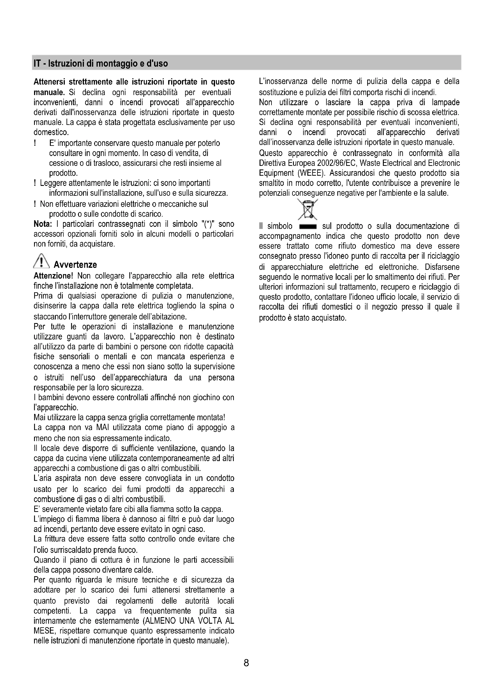 HU Felszerelési és használati utasítás SK Návod k montáži a užití SR Uputstva za montažu i upotrebu SL Navodila za montažo in uporabo AR طرق التركيب والاستعمال8 IT - Istruzioni di montaggio e d'uso Attenersi strettamente alle istruzioni riportate in questo manuale. Si declina ogni responsabilità per eventuali inconvenienti, danni o incendi provocati all'apparecchio derivati dall'inosservanza delle istruzioni riportate in questo manuale. La cappa è stata progettata esclusivamente per uso domestico. ! E' importante conservare questo manuale per poterlo consultare in ogni momento. In caso di vendita, di cessione o di trasloco, assicurarsi che resti insieme al prodotto. ! Leggere attentamente le istruzioni: ci sono importanti informazioni sull'installazione, sull'uso e sulla sicurezza. ! Non effettuare variazioni elettriche o meccaniche sul prodotto o sulle condotte di scarico. Nota: I particolari contrassegnati con il simbolo "(*)" sono accessori opzionali forniti solo in alcuni modelli o particolari non forniti, da acquistare. Avvertenze Attenzione! Non collegare l’apparecchio alla rete elettrica finche l’installazione non è totalmente completata. Prima di qualsiasi operazione di pulizia o manutenzione, disinserire la cappa dalla rete elettrica togliendo la spina o staccando l’interruttore generale dell’abitazione. Per tutte le operazioni di installazione e manutenzione utilizzare guanti da lavoro. L’apparecchio non è destinato all’utilizzo da parte di bambini o persone con ridotte capacità fisiche sensoriali o mentali e con mancata esperienza e conoscenza a meno che essi non siano sotto la supervisione o istruiti nell’uso dell’apparecchiatura da una persona responsabile per la loro sicurezza. I bambini devono essere controllati affinché non giochino con l’apparecchio. Mai utilizzare la cappa senza griglia correttamente montata! La cappa non va MAI utilizzata come piano di appoggio a meno che non sia espressamente indicato. Il locale deve disporre di sufficiente ventilazione, quando la cappa da cucina viene utilizzata contemporaneamente ad altri apparecchi a combustione di gas o altri combustibili. L’aria aspirata non deve essere convogliata in un condotto usato per lo scarico dei fumi prodotti da apparecchi a combustione di gas o di altri combustibili. E’ severamente vietato fare cibi alla fiamma sotto la cappa. L’impiego di fiamma libera è dannoso ai filtri e può dar luogo ad incendi, pertanto deve essere evitato in ogni caso. La frittura deve essere fatta sotto controllo onde evitare che l’olio surriscaldato prenda fuoco. Quando il piano di cottura è in funzione le parti accessibili della cappa possono diventare calde. Per quanto riguarda le misure tecniche e di sicurezza da adottare per lo scarico dei fumi attenersi strettamente a quanto previsto dai regolamenti delle autorità locali competenti. La cappa va frequentemente pulita sia internamente che esternamente (ALMENO UNA VOLTA AL MESE, rispettare comunque quanto espressamente indicato nelle istruzioni di manutenzione riportate in questo manuale). L’inosservanza delle norme di pulizia della cappa e della sostituzione e pulizia dei filtri comporta rischi di incendi. Non utilizzare o lasciare la cappa priva di lampade correttamente montate per possibile rischio di scossa elettrica. Si declina ogni responsabilità per eventuali inconvenienti, danni o incendi provocati all’apparecchio derivati dall’inosservanza delle istruzioni riportate in questo manuale. Questo apparecchio è contrassegnato in conformità alla Direttiva Europea 2002/96/EC, Waste Electrical and Electronic Equipment (WEEE). Assicurandosi che questo prodotto sia smaltito in modo corretto, l'utente contribuisce a prevenire le potenziali conseguenze negative per l'ambiente e la salute. Il simbolo sul prodotto o sulla documentazione di accompagnamento indica che questo prodotto non deve essere trattato come rifiuto domestico ma deve essere consegnato presso l'idoneo punto di raccolta per il riciclaggio di apparecchiature elettriche ed elettroniche. Disfarsene seguendo le normative locali per lo smaltimento dei rifiuti. Per ulteriori informazioni sul trattamento, recupero e riciclaggio di questo prodotto, contattare l'idoneo ufficio locale, il servizio di raccolta dei rifiuti domestici o il negozio presso il quale il prodotto è stato acquistato.9 Utilizzazione La cappa è realizzata per essere utilizzata in versione aspirante ad evacuazione esterna o filtrante a ricircolo interno. Versione aspirante I vapori vengono evacuati verso l’esterno tramite un tubo di scarico fissato alla flangia di raccordo. Il diametro del tubo di scarico deve essere equivalente al diametro dell'anello di connessione. Attenzione! Il tubo di evacuazione non è fornito e va acquistato. Nella parte orizzontale, il tubo deve avere una leggera inclinazione verso l’alto (10° circa) in modo da poter trasportare l’aria verso l’esterno più facilmente. Se la cappa è provvista di filtri al carbone, questi devono essere tolti. Collegare la cappa a tubi e fori di scarico a parete con diametro equivalente all'uscita d'aria (flangia di raccordo). L'utilizzo di tubi e fori di scarico a parete con diametro inferiore determinerà una diminuizione delle prestazioni di aspirazione ed un drastico aumento della rumorosità. Si declina perciò ogni responsabilità in merito. ! Usare un condotto lungo il minimo indispensabile. ! Usare un condotto con minor numero di curve possibile (angolo massimo della curva: 90°). ! Evitare cambiamenti drastici di sezione del condotto. ! Usare un condotto con l’interno piu’ liscio possibile. ! Il materiale del condotto deve essere approvato normativamente. Versione filtrante L’aria aspirata verrà sgrassata e deodorata prima di essere riconvogliata nella stanza. Per utilizzare la cappa in questa versione è necessario installare un sistema di filtraggio aggiuntivo a base di carboni attivi. Instal