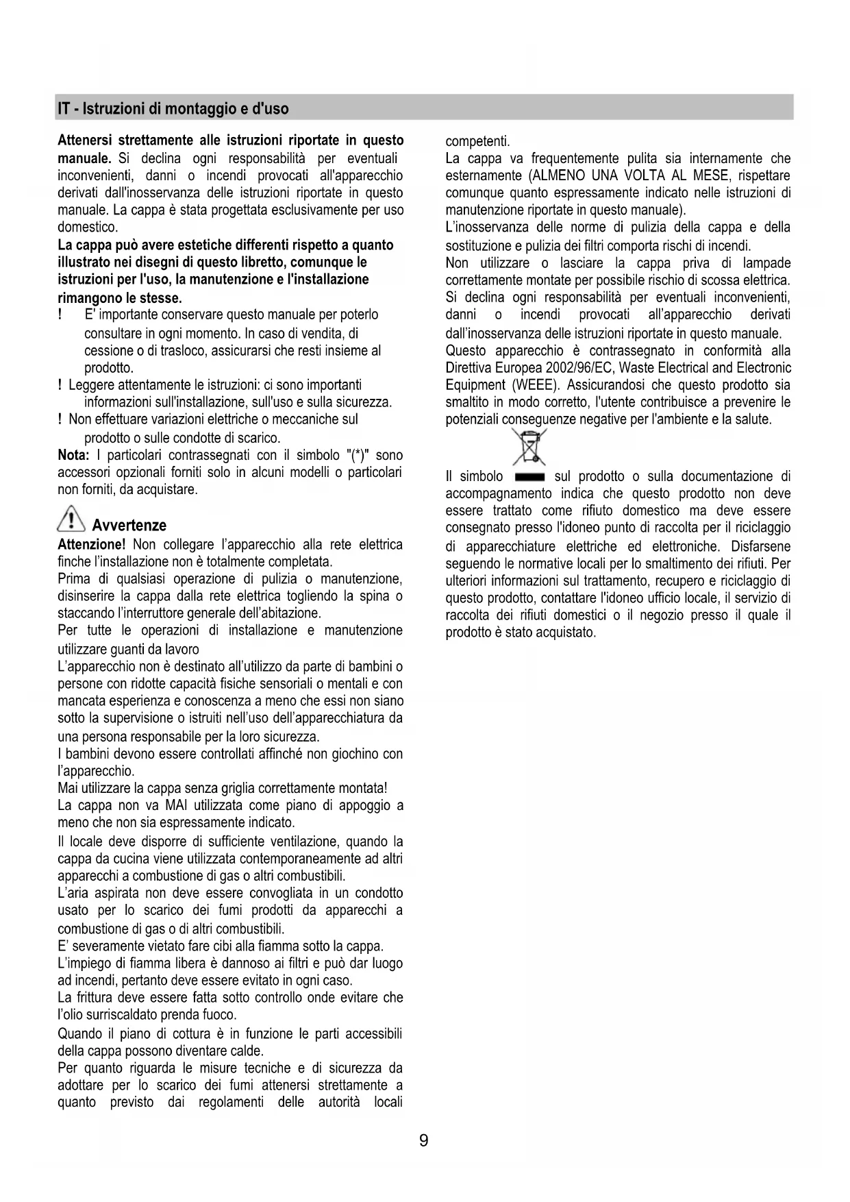 HU Felszerelési és használati utasítás SK Návod k montáži a užití SR Uputstva za montažu i upotrebu SL Navodila za montažo in uporabo UK Інструкція з монтажу і експлуатації LT montavimo ir naudojimosi instrukcija LV ierīkošanas un izmantošanas instrukcija ET Paigaldus- ja kasutusjuhend AR طرق التركيب والاستعمال9 IT - Istruzioni di montaggio e d'uso Attenersi strettamente alle istruzioni riportate in questo manuale. Si declina ogni responsabilità per eventuali inconvenienti, danni o incendi provocati all'apparecchio derivati dall'inosservanza delle istruzioni riportate in questo manuale. La cappa è stata progettata esclusivamente per uso domestico. La cappa può avere estetiche differenti rispetto a quanto illustrato nei disegni di questo libretto, comunque le istruzioni per l'uso, la manutenzione e l'installazione rimangono le stesse. ! E' importante conservare questo manuale per poterlo consultare in ogni momento. In caso di vendita, di cessione o di trasloco, assicurarsi che resti insieme al prodotto. ! Leggere attentamente le istruzioni: ci sono importanti informazioni sull'installazione, sull'uso e sulla sicurezza. ! Non effettuare variazioni elettriche o meccaniche sul prodotto o sulle condotte di scarico. Nota: I particolari contrassegnati con il simbolo "(*)" sono accessori opzionali forniti solo in alcuni modelli o particolari non forniti, da acquistare. Avvertenze Attenzione! Non collegare l’apparecchio alla rete elettrica finche l’installazione non è totalmente completata. Prima di qualsiasi operazione di pulizia o manutenzione, disinserire la cappa dalla rete elettrica togliendo la spina o staccando l’interruttore generale dell’abitazione. Per tutte le operazioni di installazione e manutenzione utilizzare guanti da lavoro L’apparecchio non è destinato all’utilizzo da parte di bambini o persone con ridotte capacità fisiche sensoriali o mentali e con mancata esperienza e conoscenza a meno che essi non siano sotto la supervisione o istruiti nell’uso dell’apparecchiatura da una persona responsabile per la loro sicurezza. I bambini devono essere controllati affinché non giochino con l’apparecchio. Mai utilizzare la cappa senza griglia correttamente montata! La cappa non va MAI utilizzata come piano di appoggio a meno che non sia espressamente indicato. Il locale deve disporre di sufficiente ventilazione, quando la cappa da cucina viene utilizzata contemporaneamente ad altri apparecchi a combustione di gas o altri combustibili. L’aria aspirata non deve essere convogliata in un condotto usato per lo scarico dei fumi prodotti da apparecchi a combustione di gas o di altri combustibili. E’ severamente vietato fare cibi alla fiamma sotto la cappa. L’impiego di fiamma libera è dannoso ai filtri e può dar luogo ad incendi, pertanto deve essere evitato in ogni caso. La frittura deve essere fatta sotto controllo onde evitare che l’olio surriscaldato prenda fuoco. Quando il piano di cottura è in funzione le parti accessibili della cappa possono diventare calde. Per quanto riguarda le misure tecniche e di sicurezza da adottare per lo scarico dei fumi attenersi strettamente a quanto previsto dai regolamenti delle autorità locali competenti. La cappa va frequentemente pulita sia internamente che esternamente (ALMENO UNA VOLTA AL MESE, rispettare comunque quanto espressamente indicato nelle istruzioni di manutenzione riportate in questo manuale). L’inosservanza delle norme di pulizia della cappa e della sostituzione e pulizia dei filtri comporta rischi di incendi. Non utilizzare o lasciare la cappa priva di lampade correttamente montate per possibile rischio di scossa elettrica. Si declina ogni responsabilità per eventuali inconvenienti, danni o incendi provocati all’apparecchio derivati dall’inosservanza delle istruzioni riportate in questo manuale. Questo apparecchio è contrassegnato in conformità alla Direttiva Europea 2002/96/EC, Waste Electrical and Electronic Equipment (WEEE). Assicurandosi che questo prodotto sia smaltito in modo corretto, l'utente contribuisce a prevenire le potenziali conseguenze negative per l'ambiente e la salute. Il simbolo sul prodotto o sulla documentazione di accompagnamento indica che questo prodotto non deve essere trattato come rifiuto domestico ma deve essere consegnato presso l'idoneo punto di raccolta per il riciclaggio di apparecchiature elettriche ed elettroniche. Disfarsene seguendo le normative locali per lo smaltimento dei rifiuti. Per ulteriori informazioni sul trattamento, recupero e riciclaggio di questo prodotto, contattare l'idoneo ufficio locale, il servizio di raccolta dei rifiuti domestici o il negozio presso il quale il prodotto è stato acquistato.10 Utilizzazione La cappa è realizzata per essere utilizzata in versione aspirante ad evacuazione esterna o filtrante a ricircolo interno. Versione aspirante I vapori vengono evacuati verso l’esterno tramite un tubo di scarico fissato alla flangia di raccordo. Il diametro del tubo di scarico deve essere equivalente al diametro dell'anello di connessione. Attenzione! Il tubo di evacuazione non è fornito e va acquistato. Nella parte orizzontale, il tubo deve avere una leggera inclinazione verso l’alto (10° circa) in modo da poter trasportare l’aria verso l’esterno più facilmente. Se la cappa è provvista di filtri al carbone, questi devono essere tolti. Collegare la cappa a tubi e fori di scarico a parete con diametro equivalente all'uscita d'aria (flangia di raccordo). L'utilizzo di tubi e fori di scarico a parete con diametro inferiore determinerà una diminuizione delle prestazioni di aspirazione ed un drastico aumento della rumorosità. Si declina perciò ogni responsabilità in merito. ! Usare un condotto lungo il minimo indispensabile. ! Usare un condotto con minor numero di curve possibile (angolo massimo della curva: 90°). ! Evitare cambiamenti drastici di sezione del condo