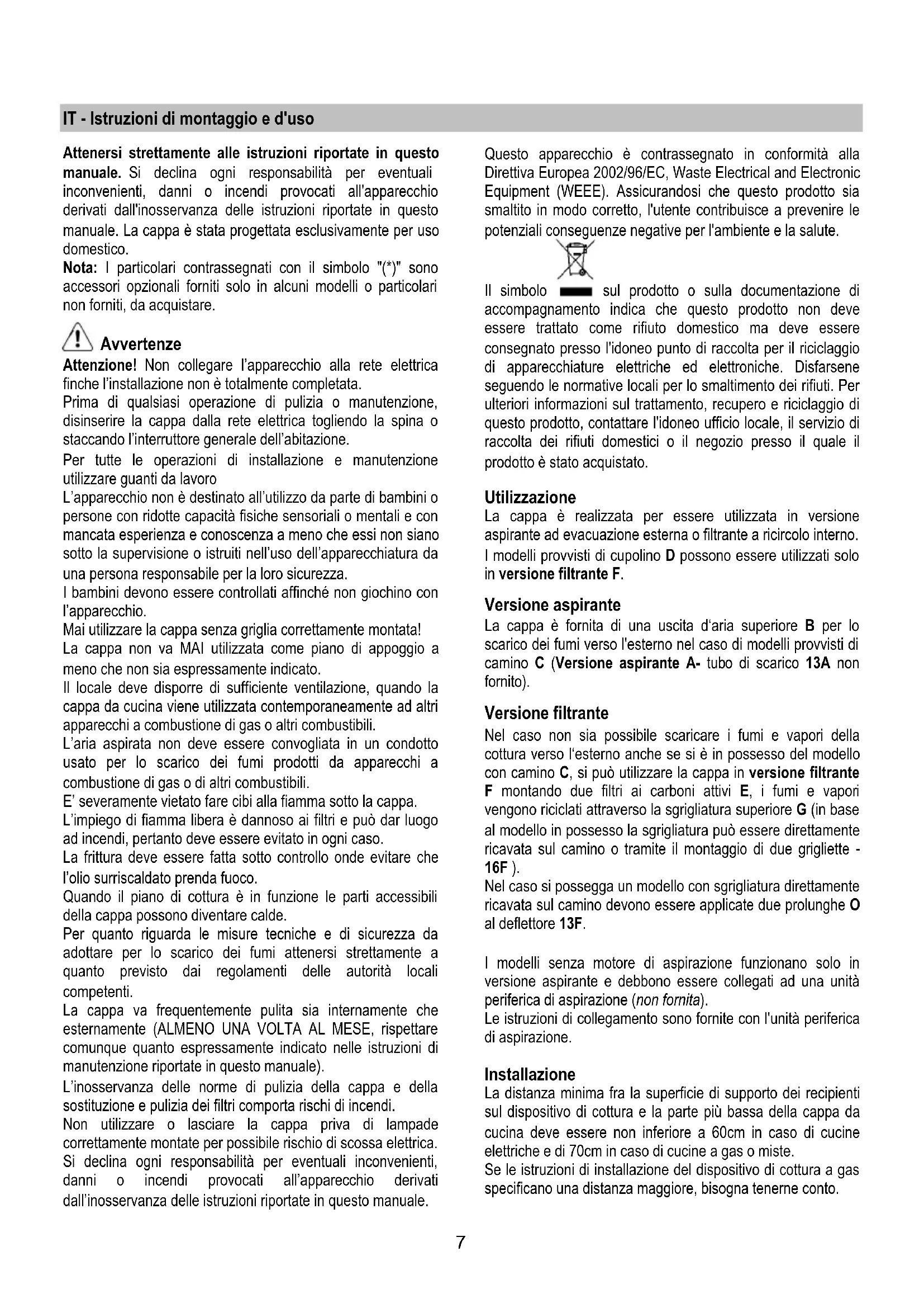 HU Felszerelési és használati utasítás SK Návod k montáži a užití SR Uputstva za montažu i upotrebu SL Navodila za montažo in uporabo UK Інструкція з монтажу і експлуатації LT montavimo ir naudojimosi instrukcija LV ierīkošanas un izmantošanas instrukcija ET Paigaldus- ja kasutusjuhend AR لﺎﻤﻌﺘﺳﻻاو ﺐﻴآﺮﺘﻟا قﺮﻃ7 IT - Istruzioni di montaggio e d'uso Attenersi strettamente alle istruzioni riportate in questo manuale. Si declina ogni responsabilità per eventuali inconvenienti, danni o incendi provocati all'apparecchio derivati dall'inosservanza delle istruzioni riportate in questo manuale. La cappa è stata progettata esclusivamente per uso domestico. Nota: I particolari contrassegnati con il simbolo "(*)" sono accessori opzionali forniti solo in alcuni modelli o particolari non forniti, da acquistare. Avvertenze Attenzione! Non collegare l’apparecchio alla rete elettrica finche l’installazione non è totalmente completata. Prima di qualsiasi operazione di pulizia o manutenzione, disinserire la cappa dalla rete elettrica togliendo la spina o staccando l’interruttore generale dell’abitazione. Per tutte le operazioni di installazione e manutenzione utilizzare guanti da lavoro L’apparecchio non è destinato all’utilizzo da parte di bambini o persone con ridotte capacità fisiche sensoriali o mentali e con mancata esperienza e conoscenza a meno che essi non siano sotto la supervisione o istruiti nell’uso dell’apparecchiatura da una persona responsabile per la loro sicurezza. I bambini devono essere controllati affinché non giochino con l’apparecchio. Mai utilizzare la cappa senza griglia correttamente montata! La cappa non va MAI utilizzata come piano di appoggio a meno che non sia espressamente indicato. Il locale deve disporre di sufficiente ventilazione, quando la cappa da cucina viene utilizzata contemporaneamente ad altri apparecchi a combustione di gas o altri combustibili. L’aria aspirata non deve essere convogliata in un condotto usato per lo scarico dei fumi prodotti da apparecchi a combustione di gas o di altri combustibili. E’ severamente vietato fare cibi alla fiamma sotto la cappa. L’impiego di fiamma libera è dannoso ai filtri e può dar luogo ad incendi, pertanto deve essere evitato in ogni caso. La frittura deve essere fatta sotto controllo onde evitare che l’olio surriscaldato prenda fuoco. Quando il piano di cottura è in funzione le parti accessibili della cappa possono diventare calde. Per quanto riguarda le misure tecniche e di sicurezza da adottare per lo scarico dei fumi attenersi strettamente a quanto previsto dai regolamenti delle autorità locali competenti. La cappa va frequentemente pulita sia internamente che esternamente (ALMENO UNA VOLTA AL MESE, rispettare comunque quanto espressamente indicato nelle istruzioni di manutenzione riportate in questo manuale). L’inosservanza delle norme di pulizia della cappa e della sostituzione e pulizia dei filtri comporta rischi di incendi. Non utilizzare o lasciare la cappa priva di lampade correttamente montate per possibile rischio di scossa elettrica. Si declina ogni responsabilità per eventuali inconvenienti, danni o incendi provocati all’apparecchio derivati dall’inosservanza delle istruzioni riportate in questo manuale. Questo apparecchio è contrassegnato in conformità alla Direttiva Europea 2002/96/EC, Waste Electrical and Electronic Equipment (WEEE). Assicurandosi che questo prodotto sia smaltito in modo corretto, l'utente contribuisce a prevenire le potenziali conseguenze negative per l'ambiente e la salute. Il simbolo sul prodotto o sulla documentazione di accompagnamento indica che questo prodotto non deve essere trattato come rifiuto domestico ma deve essere consegnato presso l'idoneo punto di raccolta per il riciclaggio di apparecchiature elettriche ed elettroniche. Disfarsene seguendo le normative locali per lo smaltimento dei rifiuti. Per ulteriori informazioni sul trattamento, recupero e riciclaggio di questo prodotto, contattare l'idoneo ufficio locale, il servizio di raccolta dei rifiuti domestici o il negozio presso il quale il prodotto è stato acquistato. Utilizzazione La cappa è realizzata per essere utilizzata in versione aspirante ad evacuazione esterna o filtrante a ricircolo interno. I modelli provvisti di cupolino D possono essere utilizzati solo in versione filtrante F. Versione aspirante La cappa è fornita di una uscita d‘aria superiore B per lo scarico dei fumi verso l'esterno nel caso di modelli provvisti di camino C (Versione aspirante A- tubo di scarico 13A non fornito). Versione filtrante Nel caso non sia possibile scaricare i fumi e vapori della cottura verso l‘esterno anche se si è in possesso del modello con camino C, si può utilizzare la cappa in versione filtrante F montando due filtri ai carboni attivi E, i fumi e vapori vengono riciclati attraverso la sgrigliatura superiore G (in base al modello in possesso la sgrigliatura può essere direttamente ricavata sul camino o tramite il montaggio di due grigliette - 16F ). Nel caso si possegga un modello con sgrigliatura direttamente ricavata sul camino devono essere applicate due prolunghe O al deflettore 13F. I modelli senza motore di aspirazione funzionano solo in versione aspirante e debbono essere collegati ad una unità periferica di aspirazione (non fornita). Le istruzioni di collegamento sono fornite con l'unità periferica di aspirazione. Installazione La distanza minima fra la superficie di supporto dei recipienti sul dispositivo di cottura e la parte più bassa della cappa da cucina deve essere non inferiore a 60cm in caso di cucine elettriche e di 70cm in caso di cucine a gas o miste. Se le istruzioni di installazione del dispositivo di cottura a gas specificano una distanza maggiore, bisogna tenerne conto.8 Collegamento Elettrico La tensione di rete deve corrispondere alla tensione riportata sull’etichetta car