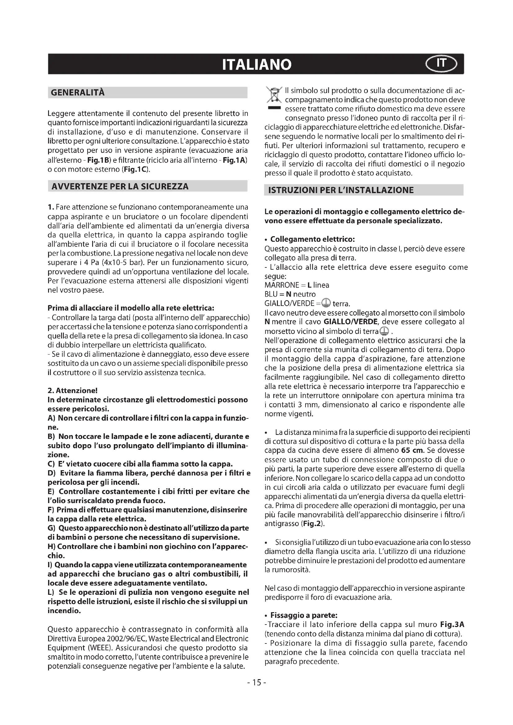 - Si raccomanda di mettere in funzione l’apparecchio prima di procedere alla cottura di un qualsiasi alimento. Si raccomanda di lasciar funzionare l’apparecchio per 15 minuti dopo aver terminato la cottura dei cibi, per un’evacuazione completa dell’aria viziata. Il buon funzionamento della cappa è condizionato da una corretta e costante manutenzione; una particolare attenzione deve essere data al ltro antigrasso e al ltro al carbone attivo.