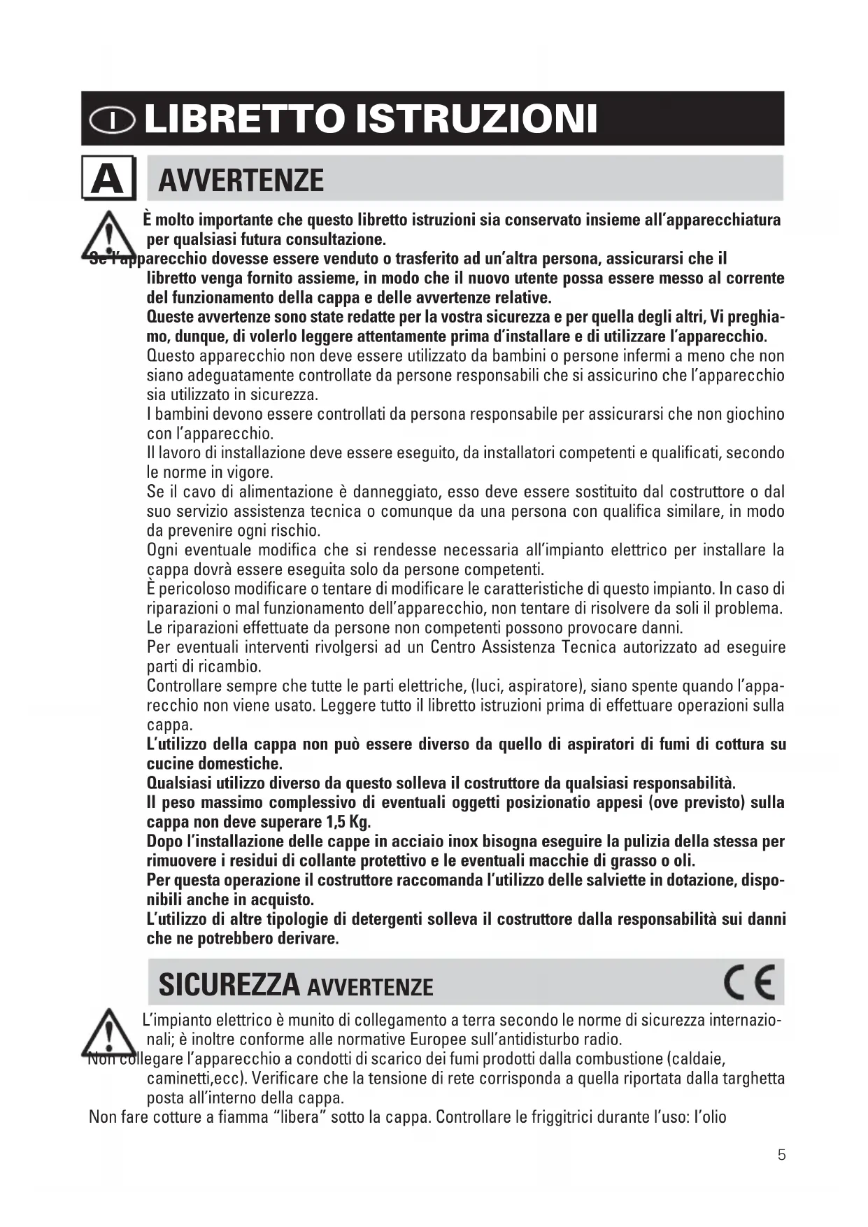 È molto importante che questo libretto istruzioni sia conservato insieme all’apparecchiatura per qualsiasi futura consultazione. Se l’apparecchio dovesse essere venduto o trasferito ad un’altra persona, assicurarsi che il libretto venga fornito assieme, in modo che il nuovo utente possa essere messo al corrente del funzionamento della cappa e delle avvertenze relative. Queste avvertenze sono state redatte per la vostra sicurezza e per quella degli altri, Vi preghia- mo, dunque, di volerlo leggere attentamente prima d’installare e di utilizzare l’apparecchio. Questo apparecchio non deve essere utilizzato da bambini o persone infermi a meno che non siano adeguatamente controllate da persone responsabili che si assicurino che l’apparecchio sia utilizzato in sicurezza. I bambini devono essere controllati da persona responsabile per assicurarsi che non giochino con l’apparecchio. Il lavoro di installazione deve essere eseguito, da installatori competenti e qualificati, secondo le norme in vigore. Se il cavo di alimentazione è danneggiato, esso deve essere sostituito dal costruttore o dal suo servizio assistenza tecnica o comunque da una persona con qualifica similare, in modo da prevenire ogni rischio. Ogni eventuale modifica che si rendesse necessaria all’impianto elettrico per installare la cappa dovrà essere eseguita solo da persone competenti. È pericoloso modificare o tentare di modificare le caratteristiche di questo impianto. In caso di riparazioni o mal funzionamento dell’apparecchio, non tentare di risolvere da soli il problema. Le riparazioni effettuate da persone non competenti possono provocare danni. Per eventuali interventi rivolgersi ad un Centro Assistenza Tecnica autorizzato ad eseguire parti di ricambio. Controllare sempre che tutte le parti elettriche, (luci, aspiratore), siano spente quando l’appa- recchio non viene usato. Leggere tutto il libretto istruzioni prima di effettuare operazioni sulla cappa. L’utilizzo della cappa non può essere diverso da quello di aspiratori di fumi di cottura su cucine domestiche. Qualsiasi utilizzo diverso da questo solleva il costruttore da qualsiasi responsabilità. Il peso massimo complessivo di eventuali oggetti posizionatio appesi (ove previsto) sulla cappa non deve superare 1,5 Kg. Dopo l’installazione delle cappe in acciaio inox bisogna eseguire la pulizia della stessa per rimuovere i residui di collante protettivo e le eventuali macchie di grasso o oli. Per questa operazione il costruttore raccomanda l’utilizzo delle salviette in dotazione, dispo- nibili anche in acquisto. L’utilizzo di altre tipologie di detergenti solleva il costruttore dalla responsabilità sui danni che ne potrebbero derivare. SICUREZZA AVVERTENZE L’impianto elettrico è munito di collegamento a terra secondo le norme di sicurezza internazio- nali; è inoltre conforme alle normative Europee sull’antidisturbo radio. Non collegare l’apparecchio a condotti di scarico dei fumi prodotti dalla combustione (caldaie, caminetti,ecc). Verificare che la tensione di rete corrisponda a quella riportata dalla targhetta posta all’interno della cappa. Non fare cotture a fiamma “libera” sotto la cappa. Controllare le friggitrici durante l’uso: I’olio