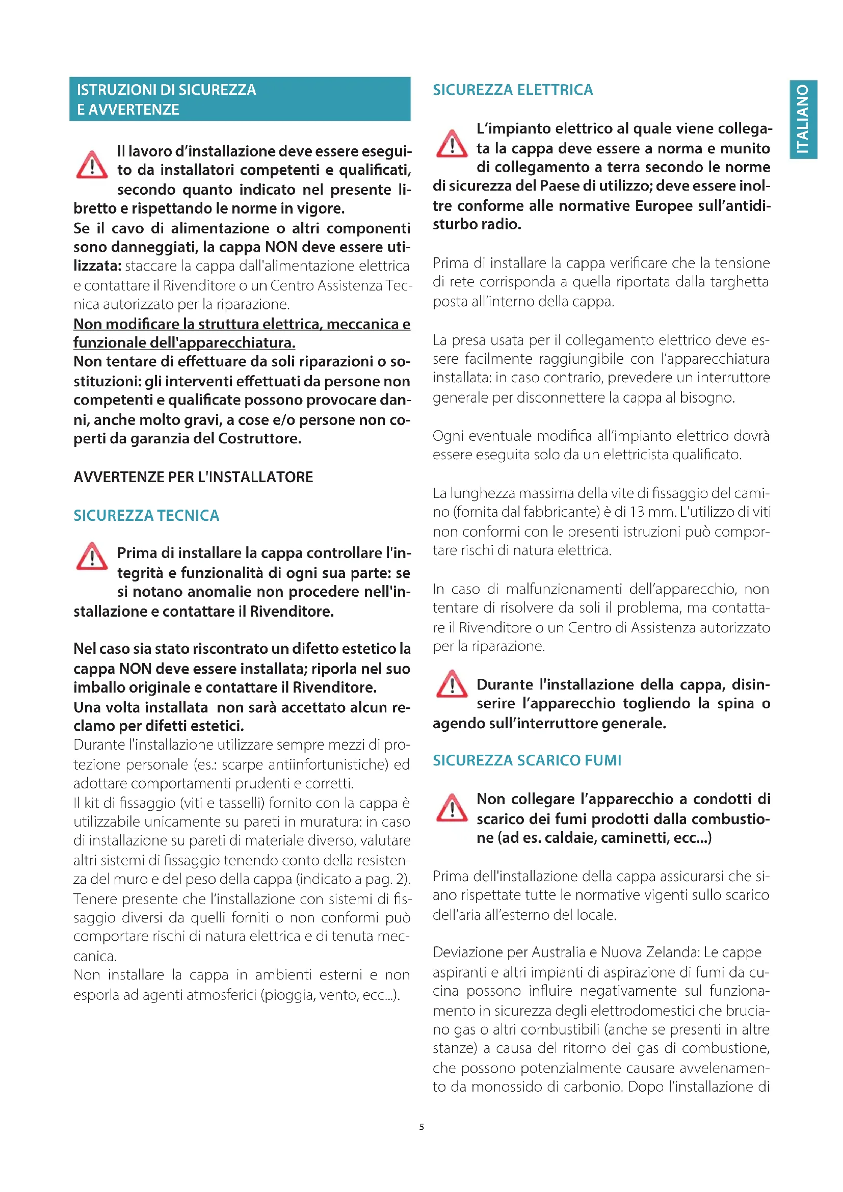 E AVVERTENZE Il lavoro d’installazione deve essere esegui- to da installatori competenti e qualicati, secondo quanto indicato nel presente li- bretto e rispettando le norme in vigore. Se il cavo di alimentazione o altri componenti sono danneggiati, la cappa NON deve essere uti- lizzata: staccare la cappa dall'alimentazione elettrica e contattare il Rivenditore o un Centro Assistenza Tec- nica autorizzato per la riparazione. Non modicare la struttura elettrica, meccanica e funzionale dell'apparecchiatura. Non tentare di eettuare da soli riparazioni o so- stituzioni: gli interventi eettuati da persone non competenti e qualicate possono provocare dan- ni, anche molto gravi, a cose e/o persone non co- perti da garanzia del Costruttore.