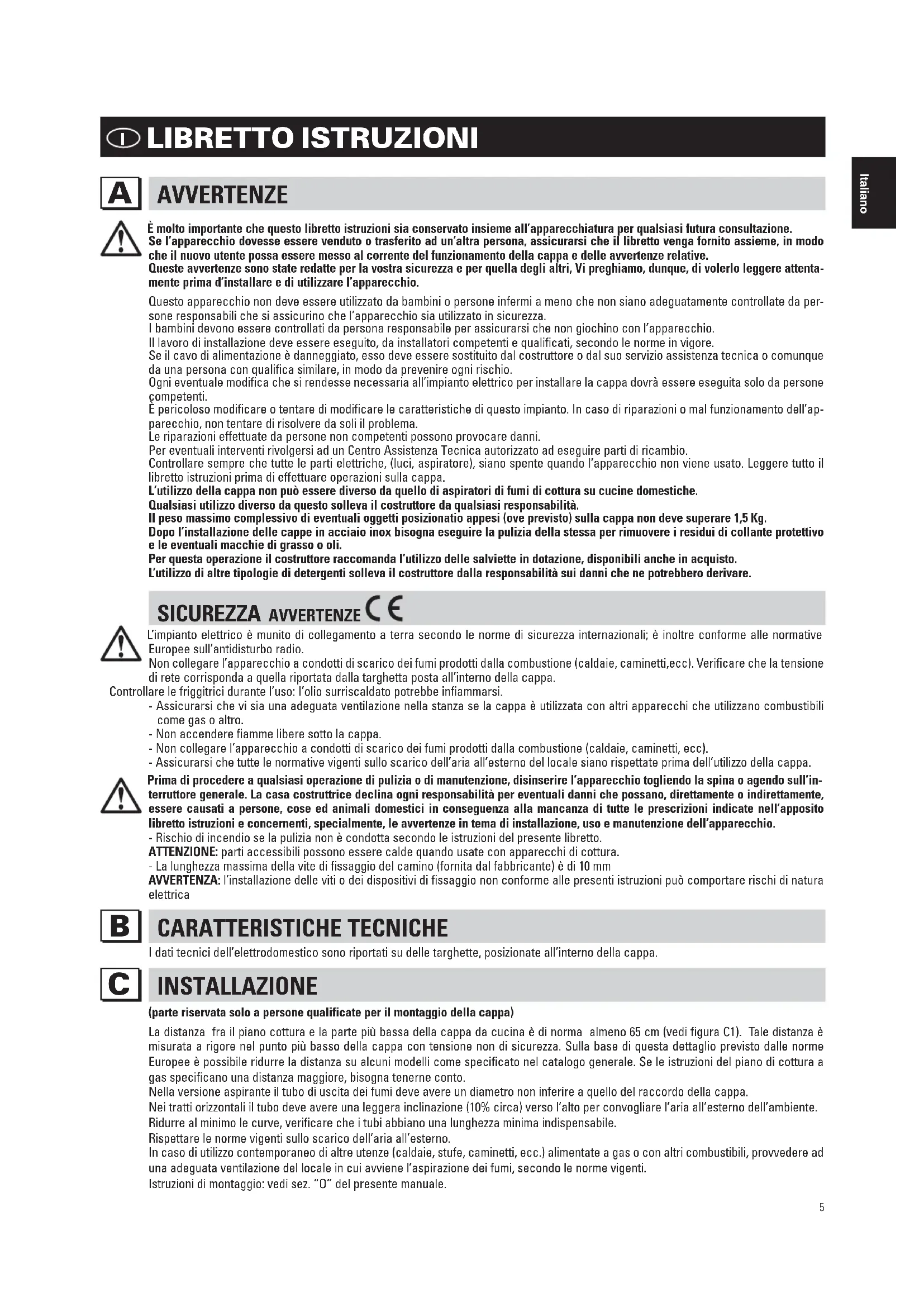 (parte riservata solo a persone qualificate per il montaggio della cappa) La distanza fra il piano cottura e la parte più bassa della cappa da cucina è di norma almeno 65 cm (vedi figura C1). Tale distanza è misurata a rigore nel punto più basso della cappa con tensione non di sicurezza. Sulla base di questa dettaglio previsto dalle norme Europee è possibile ridurre la distanza su alcuni modelli come specificato nel catalogo generale. Se le istruzioni del piano di cottura a gas specificano una distanza maggiore, bisogna tenerne conto. Nella versione aspirante il tubo di uscita dei fumi deve avere un diametro non inferire a quello del raccordo della cappa. Nei tratti orizzontali il tubo deve avere una leggera inclinazione (10% circa) verso l’alto per convogliare l’aria all’esterno dell’ambiente. Ridurre al minimo le curve, verificare che i tubi abbiano una lunghezza minima indispensabile. Rispettare le norme vigenti sullo scarico dell’aria all’esterno. In caso di utilizzo contemporaneo di altre utenze (caldaie, stufe, caminetti, ecc.) alimentate a gas o con altri combustibili, provvedere ad una adeguata ventilazione del locale in cui avviene l’aspirazione dei fumi, secondo le norme vigenti. Istruzioni di montaggio: vedi sez. “O” del presente manuale.Italiano6 ALLACCIAMENTO ELETTRICO