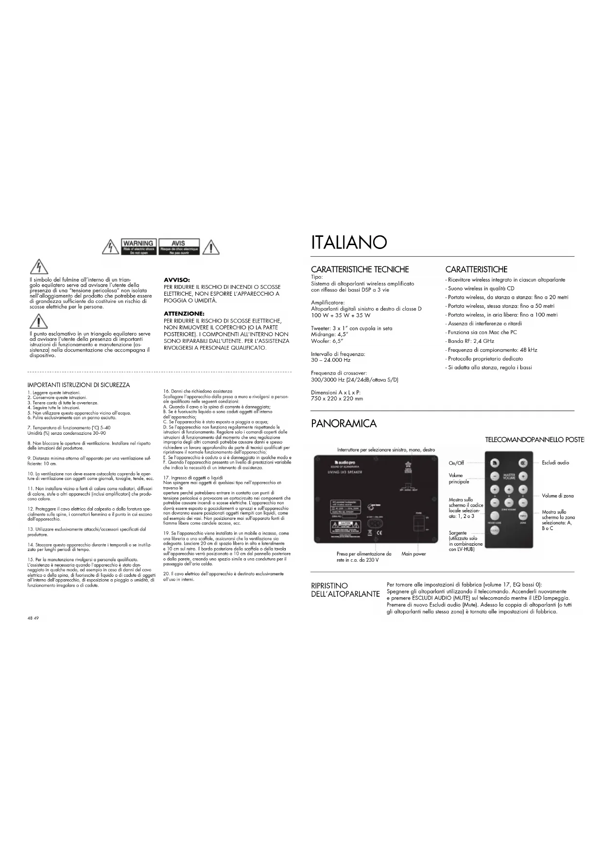 SIMULTÁNEAMENTE CON EL CÓDIGO DE CASA 1, 2 O 348 49 ITALIANO PANORAMICA On/OffEscludi audioMostra sullo schermo la zona selezionata: A, B o CMostra sullo schermo il codice locale selezion-ato: 1, 2 o 3Sorgente (utilizzato solo in combinazione con LV-HUB)Volume principaleVolume di zona TELECOMANDOPANNELLO POSTERIORE Presa per alimentazione da rete in c.a. da 230 VInterruttore per selezionare sinistro, mono, destroMain power CARATTERISTICHE TECNICHE Tipo:Sistema di altoparlanti wireless amplificato con riflesso dei bassi DSP a 3 vieAmplificatore: Altoparlanti digitali sinistro e destro di classe D 100 W + 35 W + 35 W Tweeter: 3 x 1” con cupola in setaMidrange: 4,5”Woofer: 6,5”Intervallo di frequenza: 30 – 24.000 HzFrequenza di crossover: 300/3000 Hz (24/24dB/ottava S/D)Dimensioni A x L x P: 750 x 220 x 220 mm CARATTERISTICHE - Ricevitore wireless integrato in ciascun altoparlante- Suono wireless in qualità CD - Portata wireless, da stanza a stanza: fino a 20 metri- Portata wireless, stessa stanza: fino a 50 metri- Portata wireless, in aria libera: fino a 100 metri- Assenza di interferenze o ritardi- Funziona sia con Mac che PC- Banda RF: 2,4 GHz- Frequenza di campionamento: 48 kHz- Protocollo proprietario dedicato- Si adatta alla stanza, regola i bassiIMPORTANTI ISTRUZIONI DI SICUREZZA1. Leggere queste istruzioni.2. Conservare queste istruzioni.3. Tenere conto di tutte le avvertenze.4. Seguire tutte le istruzioni.5. Non utilizzare questo apparecchio vicino all’acqua.6. Pulire esclusivamente con un panno asciutto.7. Temperatura di funzionamento (˚C) 5–40Umidità (%) senza condensazione 30–908. Non bloccare le aperture di ventilazione. Installare nel rispetto delle istruzioni del produttore.9. Distanza minima attorno all’apparato per una ventilazione suf-ficiente: 10 cm.10. La ventilazione non deve essere ostacolata coprendo le aper-ture di ventilazione con oggetti come giornali, tovaglie, tende, ecc.11. Non installare vicino a fonti di calore come radiatori, diffusori di calore, stufe o altri apparecchi (inclusi amplificatori) che produ-cono calore.12. Proteggere il cavo elettrico dal calpestio o dalla foratura spe-cialmente sulle spine, i connettori femmina e il punto in cui escono dall’apparecchio.13. Utilizzare esclusivamente attacchi/accessori specificati dal produttore.14. Staccare questo apparecchio durante i temporali o se inutiliz-zato per lunghi periodi di tempo.15. Per la manutenzione rivolgersi a personale qualificato. L’assistenza è necessaria quando l’apparecchio è stato dan-neggiato in qualche modo, ad esempio in caso di danni del cavo elettrico o della spina, di fuoriuscite di liquido o di cadute di oggetti all’interno dell’apparecchio, di esposizione a pioggia o umidità, di funzionamento irregolare o di cadute.16. Danni che richiedono assistenzaScollegare l’apparecchio dalla presa a muro e rivolgersi a person-ale qualificato nelle seguenti condizioni:A. Quando il cavo o la spina di corrente è danneggiata;B. Se è fuoriuscito liquido o sono caduti oggetti all’interno dell’apparecchio;C. Se l’apparecchio è stato esposto a pioggia o acqua;D. Se l’apparecchio non funziona regolarmente rispettando le istruzioni di funzionamento. Regolare solo i comandi coperti dalle istruzioni di funzionamento dal momento che una regolazione impropria degli altri comandi potrebbe causare danni e spesso richiedere un lavoro approfondito da parte di tecnici qualificati per ripristinare il normale funzionamento dell’apparecchio;E. Se l’apparecchio è caduto o si è danneggiato in qualche modo eF. Quando l’apparecchio presenta un livello di prestazioni variabile che indica la necessità di un intervento di assistenza.17. Ingresso di oggetti o liquidiNon spingere mai oggetti di qualsiasi tipo nell’apparecchio at-traverso le aperture perché potrebbero entrare in contatto con punti di tensione pericolosi o provocare un cortocircuito nei componenti che potrebbe causare incendi o scosse elettriche. L’apparecchio non dovrà essere esposto a gocciolamenti o spruzzi e sull’apparecchio non dovranno essere posizionati oggetti riempiti con liquidi, come ad esempio dei vasi. Non posizionare mai sull’apparato fonti di fiamme libere come candele accese, ecc.19. Se l’apparecchio viene installato in un mobile a incasso, come una libreria o uno scaffale, assicurarsi che la ventilazione sia adeguata. Lasciare 20 cm di spazio libero in alto e lateralmente e 10 cm sul retro. Il bordo posteriore dello scaffale o della tavola sull’apparecchio verrà posizionato a 10 cm dal pannello posteriore o dalla parete, creando uno spazio simile a una conduttura per il passaggio dell’aria calda.20. Il cavo elettrico dell’apparecchio è destinato esclusivamente all’uso in interni.AVVISO:PER RIDURRE IL RISCHIO DI INCENDI O SCOSSE ELETTRICHE, NON ESPORRE L’APPARECCHIO A PIOGGIA O UMIDITÀ.ATTENZIONE:PER RIDURRE IL RISCHIO DI SCOSSE ELETTRICHE, NON RIMUOVERE IL COPERCHIO (O LA PARTE POSTERIORE). I COMPONENTI ALL’INTERNO NON SONO RIPARABILI DALL’UTENTE. PER L’ASSISTENZA RIVOLGERSI A PERSONALE QUALIFICATO.Il simbolo del fulmine all’interno di un trian-golo equilatero serve ad avvisare l’utente della presenza di una “tensione pericolosa” non isolata nell’alloggiamento del prodotto che potrebbe essere di grandezza sufficiente da costituire un rischio di scosse elettriche per le persone.Il punto esclamativo in un triangolo equilatero serve ad avvisare l’utente della presenza di importanti istruzioni di funzionamento e manutenzione (as-sistenza) nella documentazione che accompagna il dispositivo. RIPRISTINO DELL’ALTOPARLANTE Per tornare alle impostazioni di fabbrica (volume 17, EQ bassi 0):Spegnere gli altoparlanti utilizzando il telecomando. Accenderli nuovamente e premere ESCLUDI AUDIO (MUTE) sul telecomando mentre il LED lampeggia. Premere di nuovo Escludi audio (Mute). Adesso la coppia di altoparlanti (o tutti gli altoparlanti nella stessa zona) è 