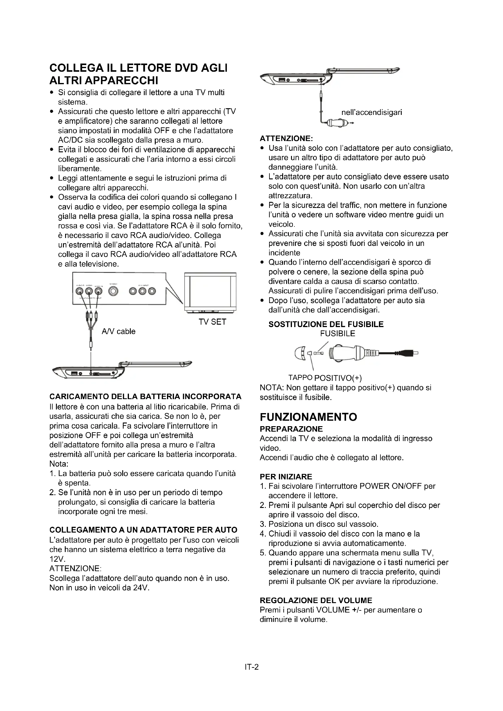 L’adattatore per auto è progettato per l’uso con veicoli che hanno un sistema elettrico a terra negative da 12V. ATTENZIONE: Scollega l’adattatore dell’auto quando non è in uso. Non in uso in veicoli da 24V. ATTENZIONE: y Usa l’unità solo con l’adattatore per auto consigliato, usare un altro tipo di adattatore per auto può danneggiare l’unità. y L’adattatore per auto consigliato deve essere usato solo con quest’unità. Non usarlo con un’altra attrezzatura. y Per la sicurezza del traffic, non mettere in funzione l’unità o vedere un software video mentre guidi un veicolo. y Assicurati che l’unità sia avvitata con sicurezza per prevenire che si sposti fuori dal veicolo in un incidente y Quando l’interno dell’accendisigari è sporco di polvere o cenere, la sezione della spina può diventare calda a causa di scarso contatto. Assicurati di pulire l’accendisigari prima dell’uso. y Dopo l’uso, scollega l’adattatore per auto sia dall’unità che dall’accendisigari.