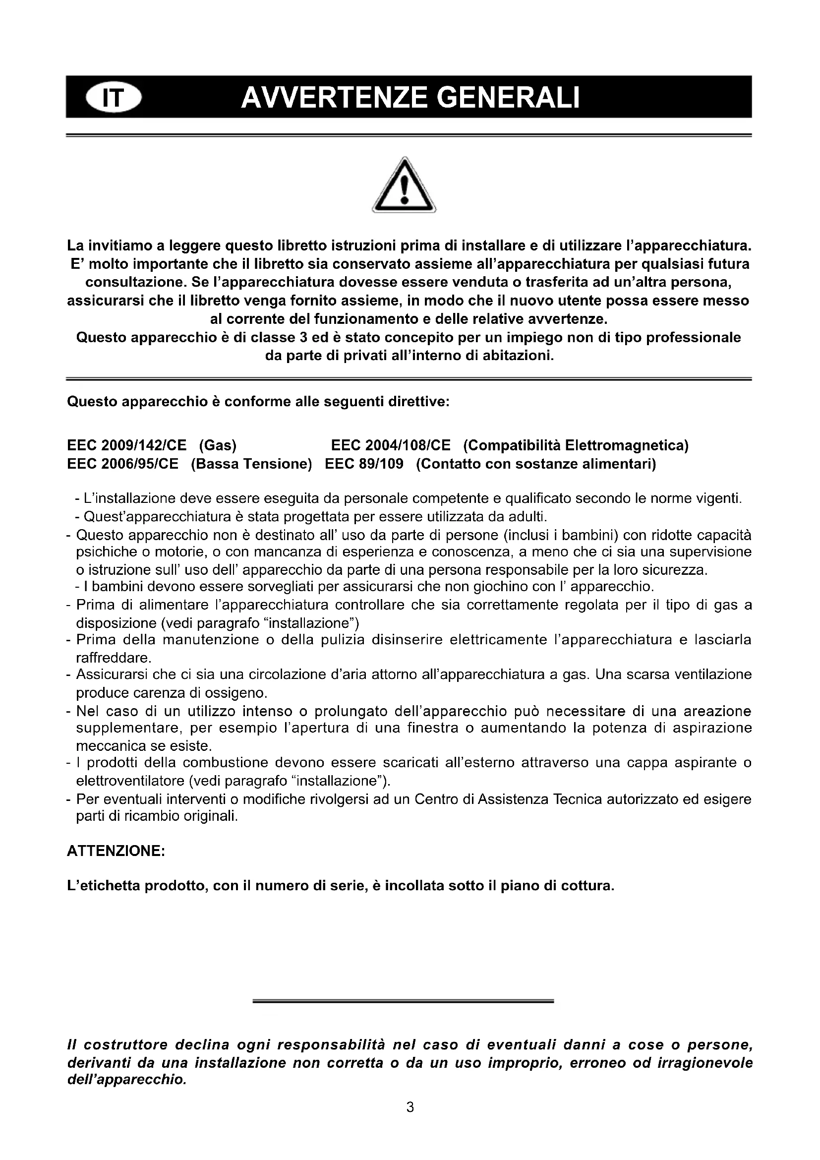 AVVERTENZE GENERALI La invitiamo a leggere questo libretto istruzioni prima di installare e di utilizzare l’apparecchiatura. E’ molto importante che il libretto sia conservato assieme all’apparecchiatura per qualsiasi futura consultazione. Se l’apparecchiatura dovesse essere venduta o trasferita ad un’altra persona, assicurarsi che il libretto venga fornito assieme, in modo che il nuovo utente possa essere messo al corrente del funzionamento e delle relative avvertenze. Questo apparecchio è di classe 3 ed è stato concepito per un impiego non di tipo professionale da parte di privati all’interno di abitazioni. Questo apparecchio è conforme alle seguenti direttive: EEC 2009/142/CE (Gas) EEC 2004/108/CE (Compatibilità Elettromagnetica) EEC 2006/95/CE (Bassa Tensione) EEC 89/109 (Contatto con sostanze alimentari) - L’installazione deve essere eseguita da personale competente e qualificato secondo le norme vigenti. - Quest’apparecchiatura è stata progettata per essere utilizzata da adulti. - Questo apparecchio non è destinato all’ uso da parte di persone (inclusi i bambini) con ridotte capacità psichiche o motorie, o con mancanza di esperienza e conoscenza, a meno che ci sia una supervisione o istruzione sull’ uso dell’ apparecchio da parte di una persona responsabile per la loro sicurezza. - I bambini devono essere sorvegliati per assicurarsi che non giochino con l’ apparecchio. - Prima di alimentare l’apparecchiatura controllare che sia correttamente regolata per il tipo di gas a disposizione (vedi paragrafo “installazione”) - Prima della manutenzione o della pulizia disinserire elettricamente l’apparecchiatura e lasciarla raffreddare. - Assicurarsi che ci sia una circolazione d’aria attorno all’apparecchiatura a gas. Una scarsa ventilazione produce carenza di ossigeno. - Nel caso di un utilizzo intenso o prolungato dell’apparecchio può necessitare di una areazione supplementare, per esempio l’apertura di una finestra o aumentando la potenza di aspirazione meccanica se esiste. - I prodotti della combustione devono essere scaricati all’esterno attraverso una cappa aspirante o elettroventilatore (vedi paragrafo “installazione”). - Per eventuali interventi o modifiche rivolgersi ad un Centro di Assistenza Tecnica autorizzato ed esigere parti di ricambio originali. ATTENZIONE: L’etichetta prodotto, con il numero di serie, è incollata sotto il piano di cottura. Il costruttore declina ogni responsabilità nel caso di eventuali danni a cose o persone, derivanti da una installazione non corretta o da un uso improprio, erroneo od irragionevole dell’apparecchio.4