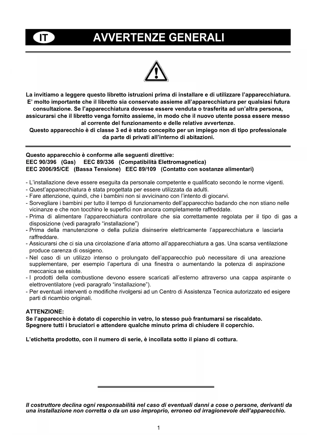 AVVERTENZE GENERALI La invitiamo a leggere questo libretto istruzioni prima di installare e di utilizzare l’apparecchiatura. E’ molto importante che il libretto sia conservato assieme all’apparecchiatura per qualsiasi futura consultazione. Se l’apparecchiatura dovesse essere venduta o trasferita ad un’altra persona, assicurarsi che il libretto venga fornito assieme, in modo che il nuovo utente possa essere messo al corrente del funzionamento e delle relative avvertenze. Questo apparecchio è di classe 3 ed è stato concepito per un impiego non di tipo professionale da parte di privati all’interno di abitazioni. Questo apparecchio è conforme alle seguenti direttive: EEC 90/396 (Gas) EEC 89/336 (Compatibilità Elettromagnetica) EEC 2006/95/CE (Bassa Tensione) EEC 89/109 (Contatto con sostanze alimentari) L’installazione deve essere eseguita da personale competente e qualificato secondo le norme vigenti. Quest’apparecchiatura è stata progettata per essere utilizzata da adulti. Fare attenzione, quindi, che i bambini non si avvicinano con l’intento di giocarvi. Sorvegliare i bambini per tutto il tempo di funzionamento dell’apparecchio badando che non stiano nelle vicinanze e che non tocchino le superfici non ancora completamente raffreddate. Prima di alimentare l’apparecchiatura controllare che sia correttamente regolata per il tipo di gas a disposizione (vedi paragrafo “installazione”) Prima della manutenzione o della pulizia disinserire elettricamente l’apparecchiatura e lasciarla raffreddare. Assicurarsi che ci sia una circolazione d’aria attorno all’apparecchiatura a gas. Una scarsa ventilazione produce carenza di ossigeno. Nel caso di un utilizzo intenso o prolungato dell’apparecchio può necessitare di una areazione supplementare, per esempio l’apertura di una finestra o aumentando la potenza di aspirazione meccanica se esiste. I prodotti della combustione devono essere scaricati all’esterno attraverso una cappa aspirante o elettroventilatore (vedi paragrafo “installazione”). Per eventuali interventi o modifiche rivolgersi ad un Centro di Assistenza Tecnica autorizzato ed esigere parti di ricambio originali. ATTENZIONE: Se l’apparecchio è dotato di coperchio in vetro, lo stesso può frantumarsi se riscaldato. Spegnere tutti i bruciatori e attendere qualche minuto prima di chiudere il coperchio. L’etichetta prodotto, con il numero di serie, è incollata sotto il piano di cottura.