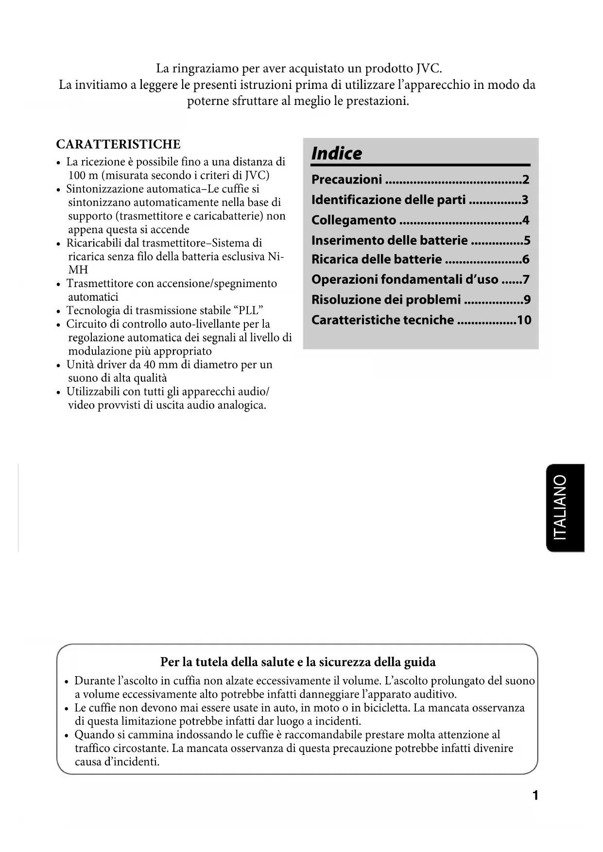 - La conception et les spécifications sont sujettes à changement sans notification. HAW600_G_FR.indd 10HAW600_G_FR.indd 10 06.7.5 3:50:21 PM06.7.5 3:50:21 PM1 ITALIANO Indice Precauzioni .......................................2 Identificazione delle parti ...............3 Collegamento ...................................4 Inserimento delle batterie ...............5 Ricarica delle batterie ......................6 Operazioni fondamentali d’uso ......7 Risoluzione dei problemi .................9 Caratteristiche tecniche .................10 La ringraziamo per aver acquistato un prodotto JVC. La invitiamo a leggere le presenti istruzioni prima di utilizzare l’apparecchio in modo da poterne sfruttare al meglio le prestazioni. Per la tutela della salute e la sicurezza della guida