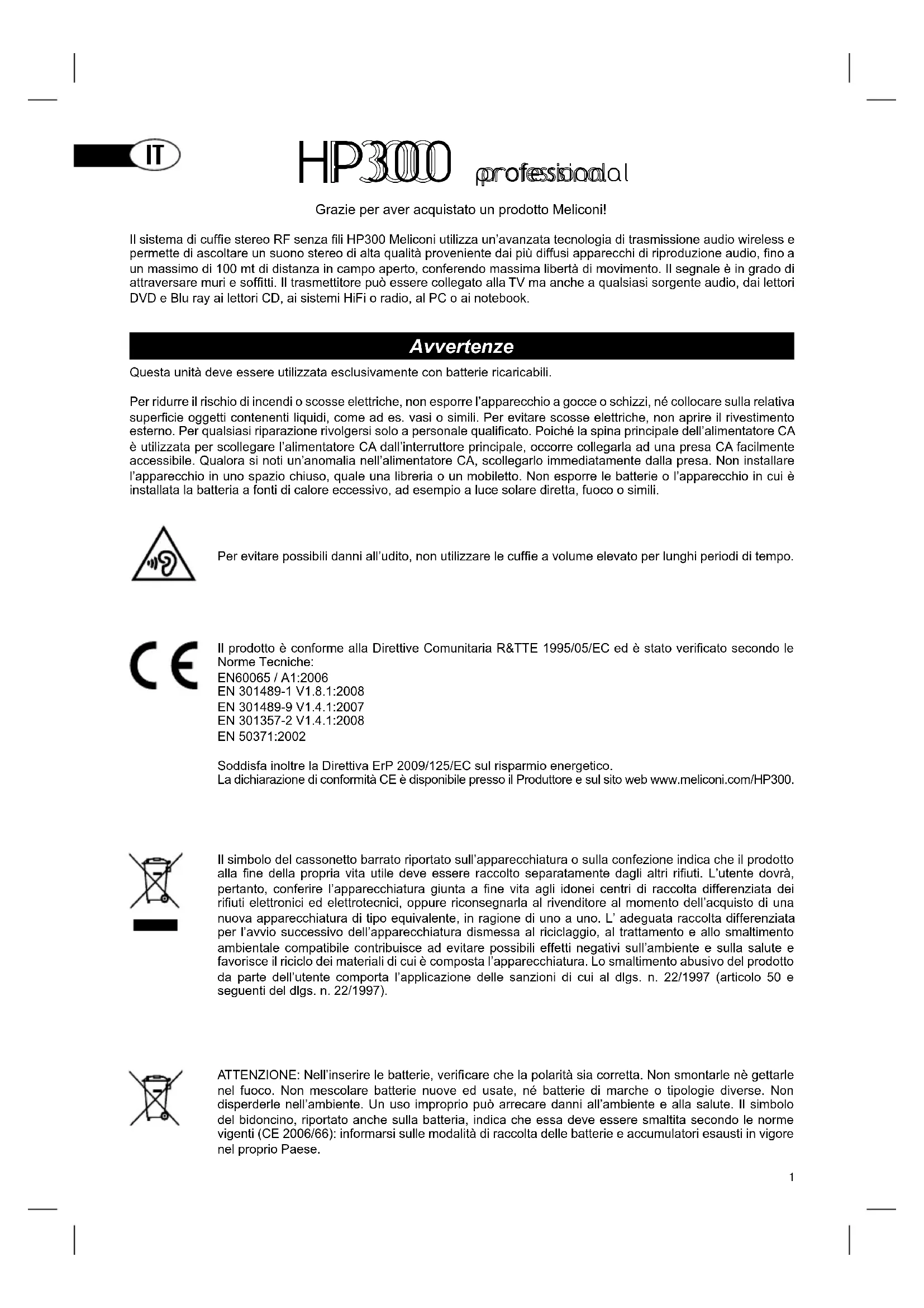 Per evitare possibili danni all’udito, non utilizzare le cuffi e a volume elevato per lunghi periodi di tempo. Il prodotto è conforme alla Direttive Comunitaria R&TTE 1995/05/EC ed è stato verifi cato secondo le Norme Tecniche:EN60065 / A1:2006 EN 301489-1 V1.8.1:2008EN 301489-9 V1.4.1:2007EN 301357-2 V1.4.1:2008EN 50371:2002Soddisfa inoltre la Direttiva ErP 2009/125/EC sul risparmio energetico.La dichiarazione di conformità CE è disponibile presso il Produttore e sul sito web www.meliconi.com/HP300.Questa unità deve essere utilizzata esclusivamente con batterie ricaricabili. Per ridurre il rischio di incendi o scosse elettriche, non esporre l’apparecchio a gocce o schizzi, né collocare sulla relativa superfi cie oggetti contenenti liquidi, come ad es. vasi o simili. Per evitare scosse elettriche, non aprire il rivestimento esterno. Per qualsiasi riparazione rivolgersi solo a personale qualifi cato. Poiché la spina principale dell’alimentatore CA è utilizzata per scollegare l’alimentatore CA dall’interruttore principale, occorre collegarla ad una presa CA facilmente accessibile. Qualora si noti un’anomalia nell’alimentatore CA, scollegarlo immediatamente dalla presa. Non installare l’apparecchio in uno spazio chiuso, quale una libreria o un mobiletto. Non esporre le batterie o l’apparecchio in cui è installata la batteria a fonti di calore eccessivo, ad esempio a luce solare diretta, fuoco o simili. HP300 HP300 professional professional Grazie per aver acquistato un prodotto Meliconi! Il sistema di cuffi e stereo RF senza fi li HP300 Meliconi utilizza un’avanzata tecnologia di trasmissione audio wireless e permette di ascoltare un suono stereo di alta qualità proveniente dai più diffusi apparecchi di riproduzione audio, fi no a un massimo di 100 mt di distanza in campo aperto, conferendo massima libertà di movimento. Il segnale è in grado di attraversare muri e soffi tti. Il trasmettitore può essere collegato alla TV ma anche a qualsiasi sorgente audio, dai lettori DVD e Blu ray ai lettori CD, ai sistemi HiFi o radio, al PC o ai notebook. ATTENZIONE: Nell’inserire le batterie, verifi care che la polarità sia corretta. Non smontarle nè gettarle nel fuoco. Non mescolare batterie nuove ed usate, né batterie di marche o tipologie diverse. Non disperderle nell’ambiente. Un uso improprio può arrecare danni all’ambiente e alla salute. Il simbolo del bidoncino, riportato anche sulla batteria, indica che essa deve essere smaltita secondo le norme vigenti (CE 2006/66): informarsi sulle modalità di raccolta delle batterie e accumulatori esausti in vigore nel proprio Paese. Avvertenze Il simbolo del cassonetto barrato riportato sull’apparecchiatura o sulla confezione indica che il prodotto alla fi ne della propria vita utile deve essere raccolto separatamente dagli altri rifi uti. L’utente dovrà, pertanto, conferire l’apparecchiatura giunta a fi ne vita agli idonei centri di raccolta differenziata dei rifi uti elettronici ed elettrotecnici, oppure riconsegnarla al rivenditore al momento dell’acquisto di una nuova apparecchiatura di tipo equivalente, in ragione di uno a uno. L’ adeguata raccolta differenziata per l’avvio successivo dell’apparecchiatura dismessa al riciclaggio, al trattamento e allo smaltimento ambientale compatibile contribuisce ad evitare possibili effetti negativi sull’ambiente e sulla salute e favorisce il riciclo dei materiali di cui è composta l’apparecchiatura. Lo smaltimento abusivo del prodotto da parte dell’utente comporta l’applicazione delle sanzioni di cui al dlgs. n. 22/1997 (articolo 50 e seguenti del dlgs. n. 22/1997).2