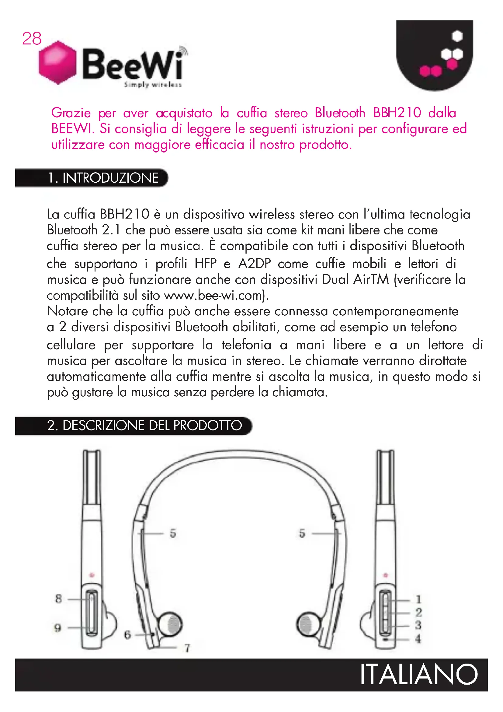 Grazie per aver acquistato la cufa stereo Bluetooth BBH210 dalla BEEWI. Si consiglia di leggere le seguenti istruzioni per configurare ed utilizzare con maggiore efficacia il nostro prodotto.