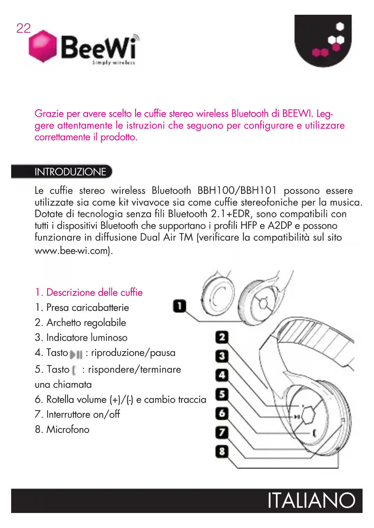 INTRODUZIONE Grazie per avere scelto le cuffie stereo wireless Bluetooth di BEEWI. Leg- gere attentamente le istruzioni che seguono per configurare e utilizzare correttamente il prodotto. ITALIANO23