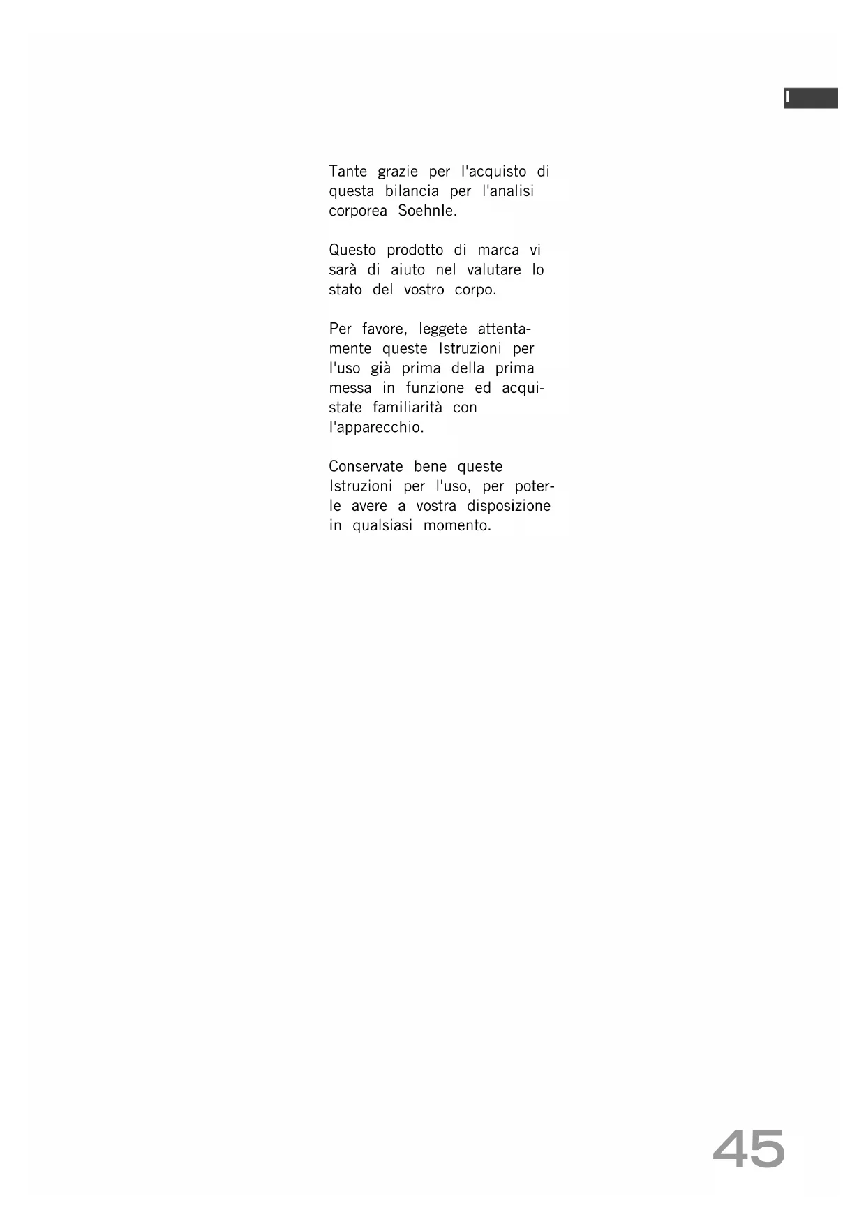 BA63721slimF5_120863_V10.qxd:BA63721slimF5_120863_V9.qxd 05.01.2010 13:21 Uhr Seite 4445 Tante grazie per l'acquisto di questa bilancia per l'analisi corporea Soehnle. Questo prodotto di marca vi sarà di aiuto nel valutare lo stato del vostro corpo. Per favore, leggete attenta- mente queste Istruzioni per l'uso già prima della prima messa in funzione ed acqui- state familiarità con l'apparecchio. Conservate bene queste Istruzioni per l'uso, per poter- le avere a vostra disposizione in qualsiasi momento.