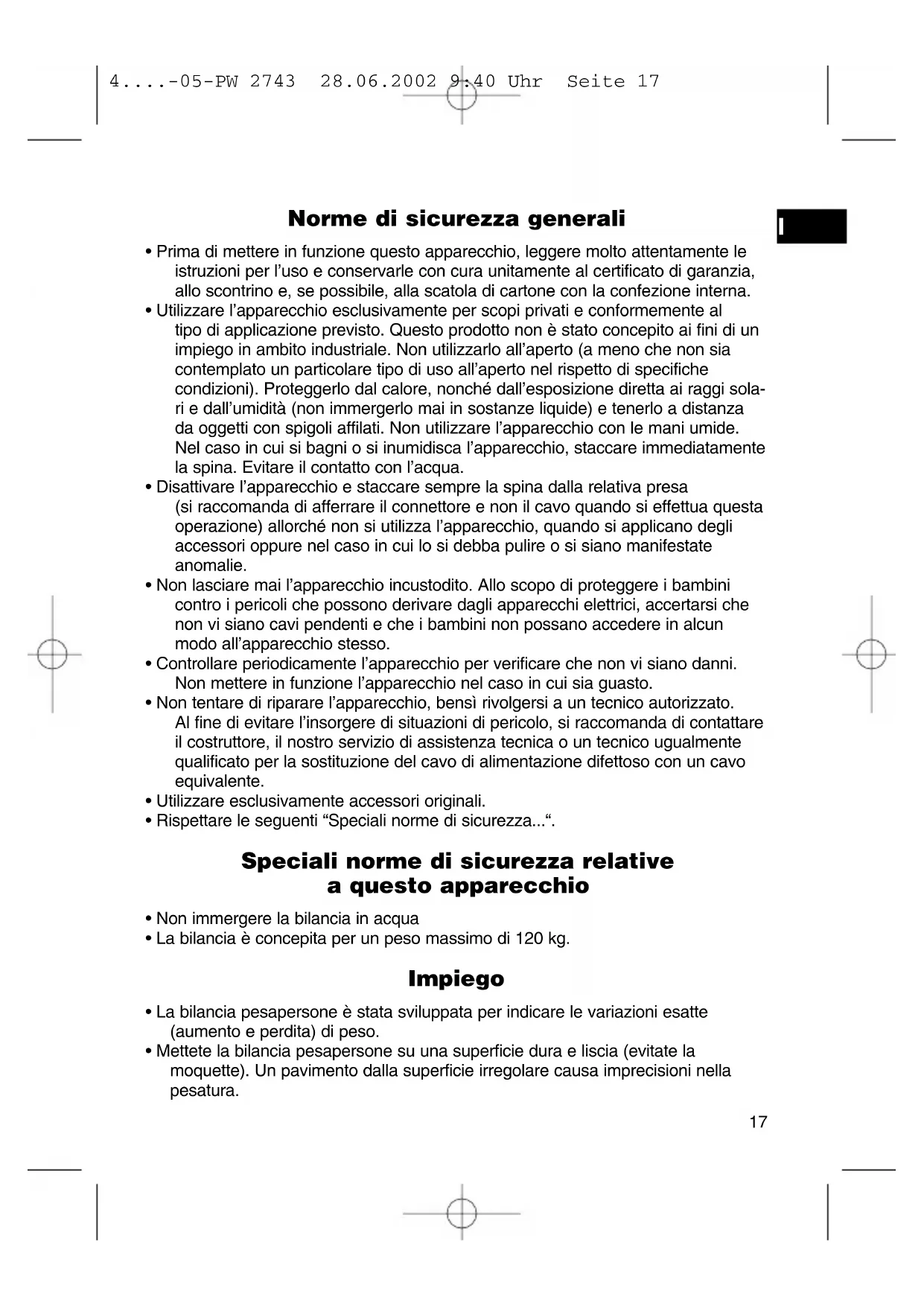 4....-05-PW 2743 28.06.2002 9:40 Uhr Seite 17• Controllate la posizione 0: senza peso, la tacca 0 dovrebbe trovarsi esattamente sotto il segno di rilevamento. Se ciò non è il caso, correggete la posizione della scala girando la rotella di regolazione sul fondo della bilancia.
