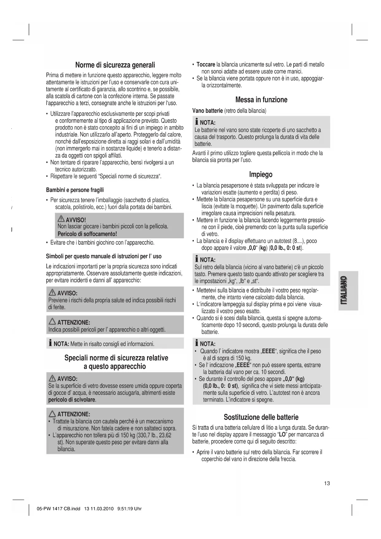 - If the scales are carried or not going to be used, please store them only in a horizontal position. 05-PW 1417 CB.indd 14 11.03.2010 9:51:20 Uhr15 ENGLISH Dati tecnici Modello: .................................................................... PW 1417 CB Alimentazione rete: ...................................................3 V CR 2032 Min. / mass..rapporto spinta-peso .............2,5 kg (5,5 lb./0,4 st) / ..............................................................150 kg (330,7 lb./23,62 st) Peso netto: ..........................................................................1,5 kg Questo apparecchio è stato controllato sulla base di tutte le direttive CE attuali in vigore in questo settore, quali per esempio la normativa in materia di compatibilità elettromagnetica e la direttiva in materia di bassa tensione, ed è stato costruito confor- memente alle norme di sicurezza più moderne. Con riserva di apportare modiche tecniche. Significato del simbolo „Eliminazione“ Salvaguardare l’ ambiente, gli elettrodomestici non vanno elimi- nati come riuti domestici. Per l’ eliminazione degli elettrodomestici, fare uso dei posti di raccolta previsti per questo tipo e porre quegli elettrodomestici che non sono più in uso. Si contribuisce così ad evitare un effetto potenziale sull’ ambien- te e sulla salute, dovuto magari ad una eliminazione sbagliata. Questo signica un contributo personale alla riutilizzazione, al riciclaggio e altre forme di utilizzazione di elettrodomestici ed apparecchi elettronici usati. Si possono trovare le corrispondenti informazioni sugli appositi luoghi di raccolta, nelle amministrazioni dei comuni. General Safety Instructions Read the operating instructions carefully before putting the appliance into operation and keep the instructions including the warranty, the receipt and, if possible, the box with the internal packing. If you give this device to other people, please also pass on the operating instructions.