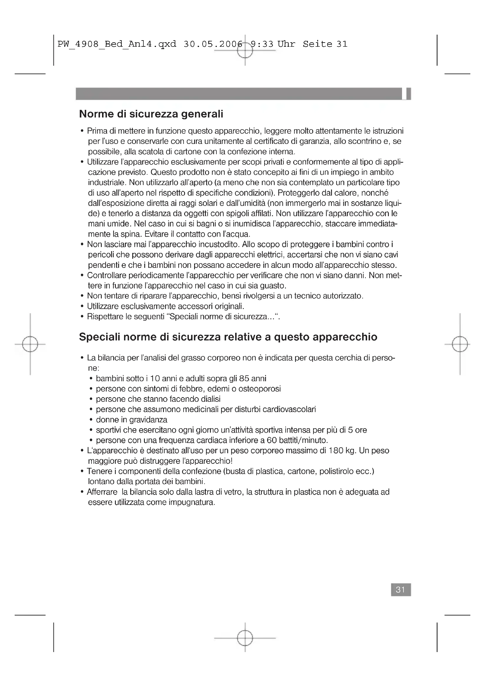 - Chiudere il coperchio del vano batterie. Attenzione:le batterie non vanno smaltite insieme ai rifi uti domestici. La preghiamo di depositare le batterie usate presso i centri di raccolta appositi oppure presso i rivenditori. Non gettare mai le batterie nel fuoco. Informazioni sulla misurazione dei grassi nel corpo Si sconsiglia l’uso di questa bilancia alle persone che hanno un pacemaker o un altro impi- anto medico con elementi elettronici. La resa dell’impianto può essere messa a rischio o limitata. PW_4908_Bed_Anl4.qxd 30.05.2006 9:33 Uhr Seite 3233