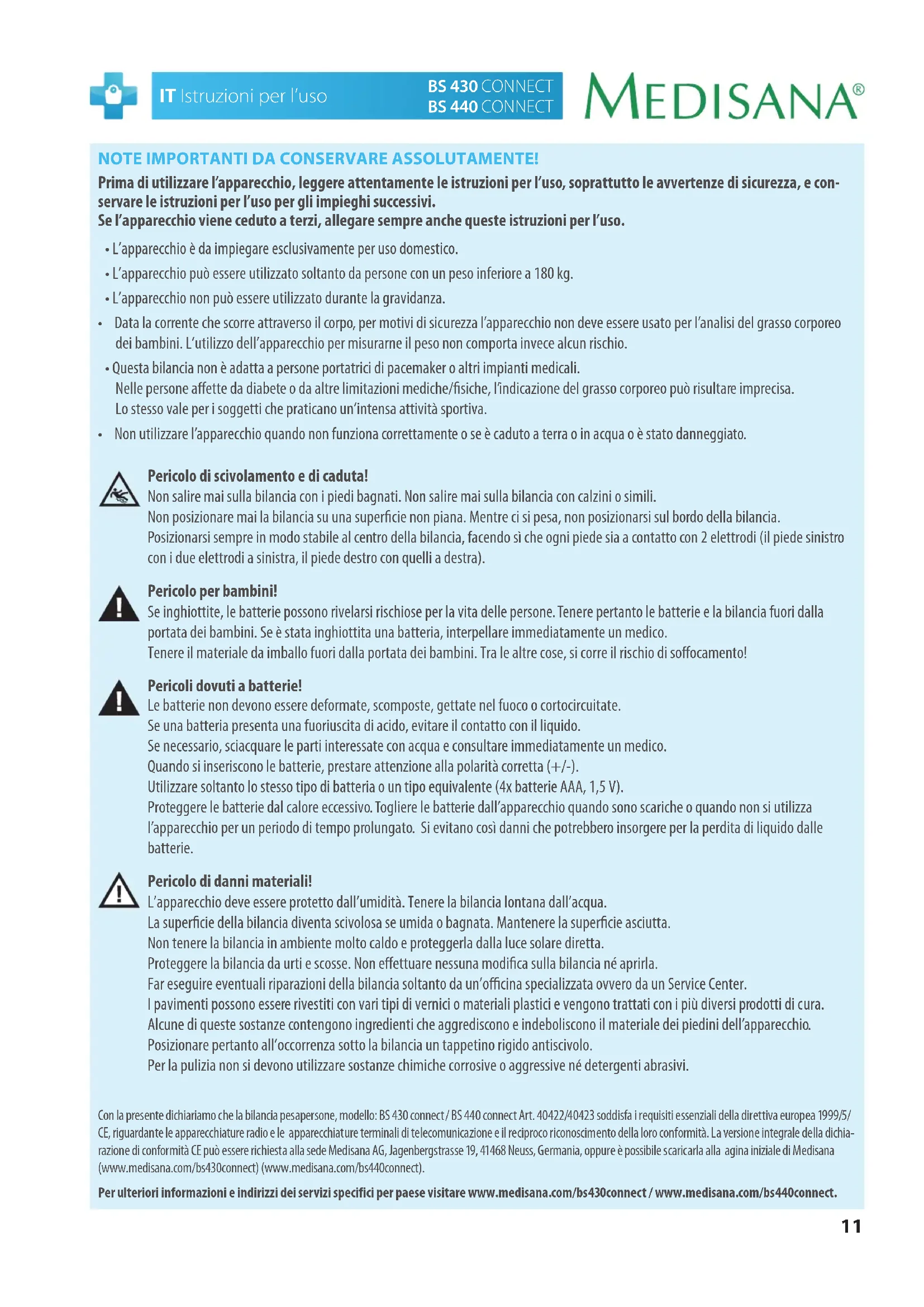 - Non utilizzare l’apparecchio quando non funziona correttamente o se è caduto a terra o in acqua o è stato danneggiato. Pericolo di scivolamento e di caduta! Non salire mai sulla bilancia con i piedi bagnati. Non salire mai sulla bilancia con calzini o simili. Non posizionare mai la bilancia su una supercie non piana. Mentre ci si pesa, non posizionarsi sul bordo della bilancia. Posizionarsi sempre in modo stabile al centro della bilancia, facendo sì che ogni piede sia a contatto con 2 elettrodi (il piede sinistro con i due elettrodi a sinistra, il piede destro con quelli a destra). Pericolo per bambini! Se inghiottite, le batterie possono rivelarsi rischiose per la vita delle persone. Tenere pertanto le batterie e la bilancia fuori dalla portata dei bambini. Se è stata inghiottita una batteria, interpellare immediatamente un medico. Tenere il materiale da imballo fuori dalla portata dei bambini. Tra le altre cose, si corre il rischio di soocamento! Pericoli dovuti a batterie! Le batterie non devono essere deformate, scomposte, gettate nel fuoco o cortocircuitate. Se una batteria presenta una fuoriuscita di acido, evitare il contatto con il liquido. Se necessario, sciacquare le parti interessate con acqua e consultare immediatamente un medico. Quando si inseriscono le batterie, prestare attenzione alla polarità corretta (+/-). Utilizzare soltanto lo stesso tipo di batteria o un tipo equivalente (4x batterie AAA, 1,5 V). Proteggere le batterie dal calore eccessivo. Togliere le batterie dall’apparecchio quando sono scariche o quando non si utilizza l’apparecchio per un periodo di tempo prolungato. Si evitano così danni che potrebbero insorgere per la perdita di liquido dalle batterie. Pericolo di danni materiali! L’apparecchio deve essere protetto dall’umidità. Tenere la bilancia lontana dall’acqua. La supercie della bilancia diventa scivolosa se umida o bagnata. Mantenere la supercie asciutta. Non tenere la bilancia in ambiente molto caldo e proteggerla dalla luce solare diretta. Proteggere la bilancia da urti e scosse. Non eettuare nessuna modica sulla bilancia né aprirla. Far eseguire eventuali riparazioni della bilancia soltanto da un’ocina specializzata ovvero da un Service Center. I pavimenti possono essere rivestiti con vari tipi di vernici o materiali plastici e vengono trattati con i più diversi prodotti di cura. Alcune di queste sostanze contengono ingredienti che aggrediscono e indeboliscono il materiale dei piedini dell’apparecchio. Posizionare pertanto all’occorrenza sotto la bilancia un tappetino rigido antiscivolo. Per la pulizia non si devono utilizzare sostanze chimiche corrosive o aggressive né detergenti abrasivi. Con la presente dichiariamo che la bilancia pesapersone, modello: BS 430 connect / BS 440 connect Art. 40422/40423 soddisfa i requisiti essenziali della direttiva europea 1999/5/ CE, riguardante le apparecchiature radio e le apparecchiature terminali di telecomunicazione e il reciproco riconoscimento della loro conformità. La versione integrale della dichia- razione di conformità CE può essere richiesta alla sede Medisana AG, Jagenbergstrasse 19,41468 Neuss, Germania, oppure è possibile scaricarla alla agina iniziale di Medisana (www.medisana.com/bs430connect) (www.medisana.com/bs440connect). Per ulteriori informazioni e indirizzi dei servizi specifici per paese visitare www.medisana.com/bs430connect / www.medisana.com/bs440connect.12 BS 430 CONNECT BS 440 CONNECT Istruzioni per l'uso IT Bluetooth Devices General Bluetooth