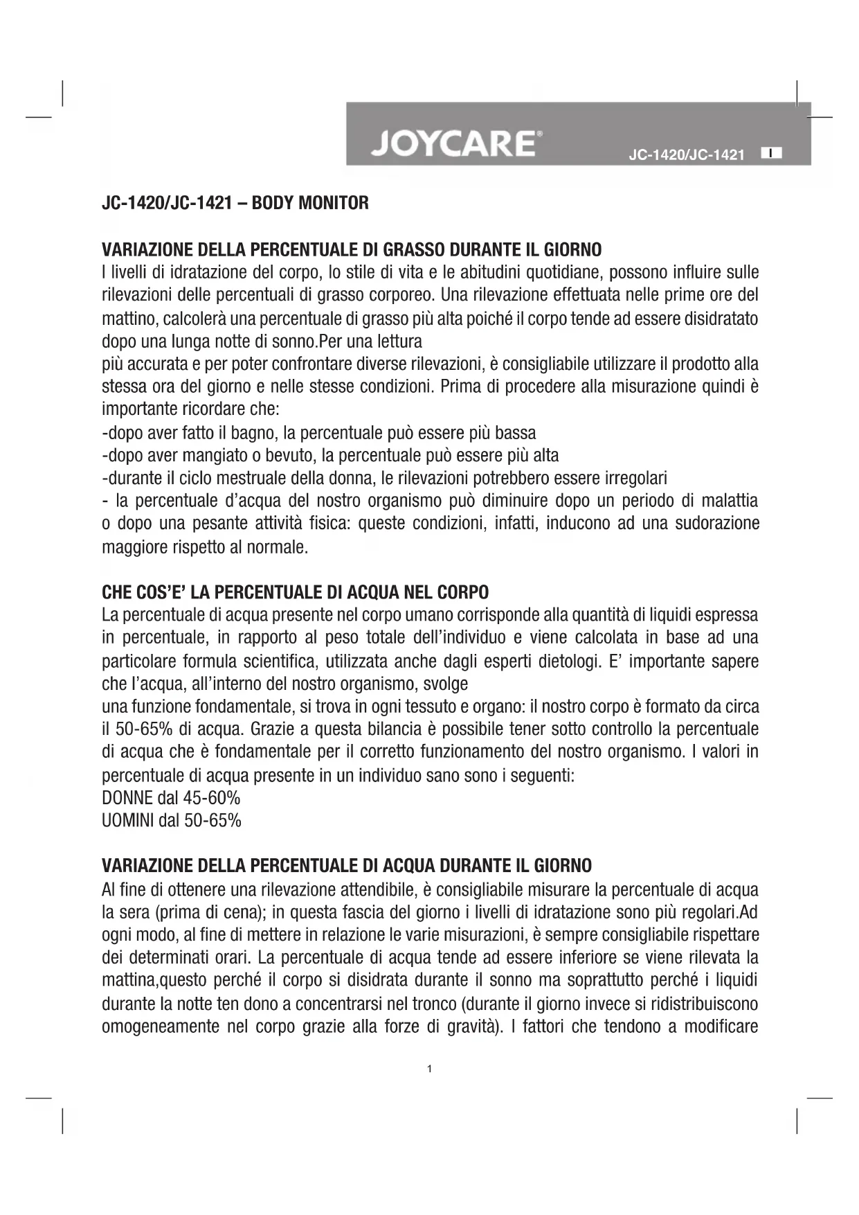VARIAZIONE DELLA PERCENTUALE DI GRASSO DURANTE IL GIORNO I livelli di idratazione del corpo, lo stile di vita e le abitudini quotidiane, possono inuire sulle rilevazioni delle percentuali di grasso corporeo. Una rilevazione effettuata nelle prime ore del mattino, calcolerà una percentuale di grasso più alta poiché il corpo tende ad essere disidratato dopo una lunga notte di sonno.Per una lettura più accurata e per poter confrontare diverse rilevazioni, è consigliabile utilizzare il prodotto alla stessa ora del giorno e nelle stesse condizioni. Prima di procedere alla misurazione quindi è importante ricordare che: -dopo aver fatto il bagno, la percentuale può essere più bassa -dopo aver mangiato o bevuto, la percentuale può essere più alta -durante il ciclo mestruale della donna, le rilevazioni potrebbero essere irregolari - la percentuale d’acqua del nostro organismo può diminuire dopo un periodo di malattia o dopo una pesante attività sica: queste condizioni, infatti, inducono ad una sudorazione maggiore rispetto al normale. CHE COS’E’ LA PERCENTUALE DI ACQUA NEL CORPO La percentuale di acqua presente nel corpo umano corrisponde alla quantità di liquidi espressa in percentuale, in rapporto al peso totale dell’individuo e viene calcolata in base ad una particolare formula scientica, utilizzata anche dagli esperti dietologi. E’ importante sapere che l’acqua, all’interno del nostro organismo, svolge una funzione fondamentale, si trova in ogni tessuto e organo: il nostro corpo è formato da circa il 50-65% di acqua. Grazie a questa bilancia è possibile tener sotto controllo la percentuale di acqua che è fondamentale per il corretto funzionamento del nostro organismo. I valori in percentuale di acqua presente in un individuo sano sono i seguenti: DONNE dal 45-60% UOMINI dal 50-65% VARIAZIONE DELLA PERCENTUALE DI ACQUA DURANTE IL GIORNO Al ne di ottenere una rilevazione attendibile, è consigliabile misurare la percentuale di acqua la sera (prima di cena); in questa fascia del giorno i livelli di idratazione sono più regolari.Ad ogni modo, al ne di mettere in relazione le varie misurazioni, è sempre consigliabile rispettare dei determinati orari. La percentuale di acqua tende ad essere inferiore se viene rilevata la mattina,questo perché il corpo si disidrata durante il sonno ma soprattutto perché i liquidi durante la notte ten dono a concentrarsi nel tronco (durante il giorno invece si ridistribuiscono omogeneamente nel corpo grazie alla forze di gravità). I fattori che tendono a modicare2