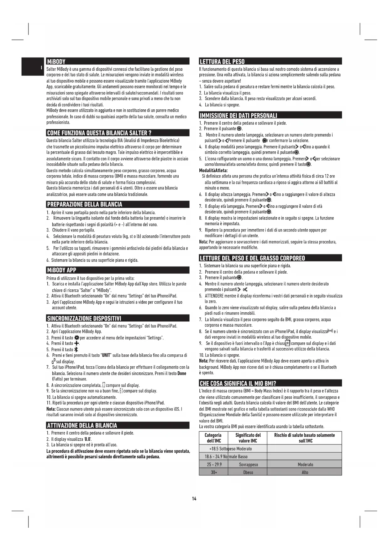 MiBODY Salter MiBody è una gamma di dispositivi connessi che facilitano la gestione del peso corporeo e del tuo stato di salute. Le misurazioni vengono inviate in modalità wireless al tuo dispositivo mobile e possono essere visualizzate tramite l’applicazione MiBody App, scaricabile gratuitamente. Gli andamenti possono essere monitorati nel tempo e le misurazioni sono spiegate attraverso intervalli di salute/raccomandati. I risultati sono archiviati solo sul tuo dispositivo mobile personale e sono privati a meno che tu non decida di condividere i tuoi risultati. MiBody deve essere utilizzato in aggiunta e non in sostituzione di un parere medico professionale. In caso di dubbi su qualsiasi aspetto della tua salute, consulta un medico professionista. COME FUNZIONA QUESTA BILANCIA SALTER ? Questa bilancia Salter utilizza la tecnologia BIA (Analisi di Impedenza Bioelettrica) che trasmette un piccolissimo impulso elettrico attraverso il corpo per determinare la percentuale di grasso dal tessuto magro. Tale impulso elettrico è impercettibile e assolutamente sicuro. Il contatto con il corpo avviene attraverso delle piastre in acciaio inossidabile situate sulla pedana della bilancia. Questo metodo calcola simultaneamente peso corporeo, grasso corporeo, acqua corporea totale, indice di massa corporea (BMI) e massa muscolare, fornendo una misura più accurata dello stato di salute e forma fisica complessivi. Questa bilancia memorizza i dati personali di 4 utenti. Oltre a essere una bilancia analizzatrice, può essere usata come una bilancia tradizionale.