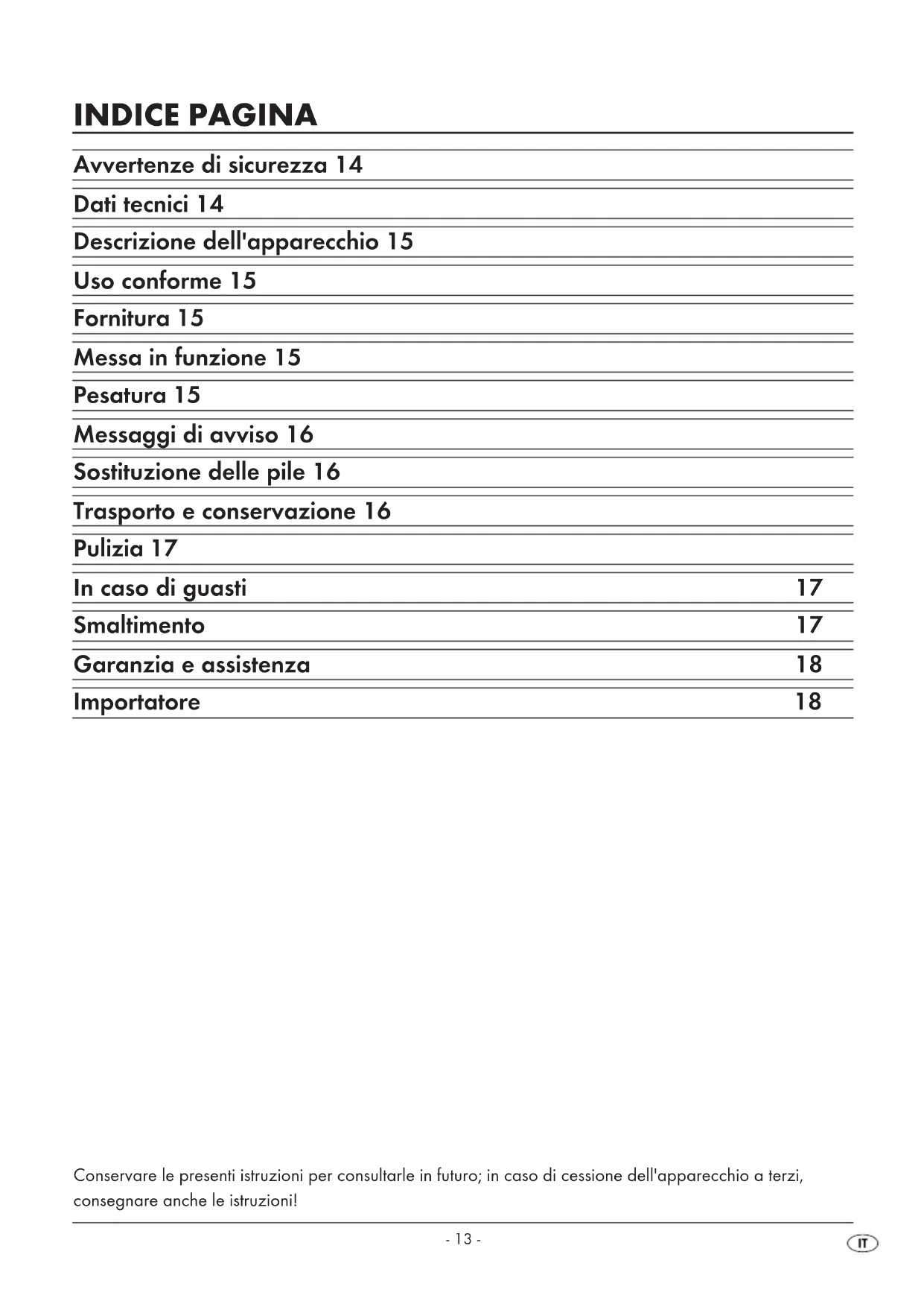 - Conservare la bilancia di vetro in un luogo asciutto e pulito. IB_56486_SGW180A1_LB1 09.09.2010 16:37 Uhr Seite 16- 17 -• Evitare le cariche elettrostatiche.• La bilancia di vetro è uno strumento elettronicodelicato. Per tale motivo, può capitare che subiscainterferenze da parte di apparecchi ad alta fre-quenza che si trovano nelle immediate vicinanze(ad es. telefoni cellulari, stazioni radio CB, tele-comandi radio e forni a microonde). In caso di errori, come ad es. messaggi irregolari oerrati nel display , allontanare la bilancia di vetrodalla fonte di interferenze durante l'uso. Pulizia Pulire la bilancia di vetro esclusivamente con detergenti neutri e un panno morbido. In caso di guasti