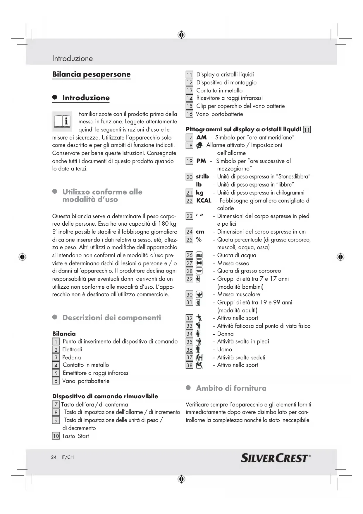 Ambito di fornitura Verificare sempre l’apparecchio e gli elementi forniti immediatamente dopo avere disimballato per con- trollarne la completezza nonché lo stato ineccepibile.25 IT/CH Introduzione / Sicurezza 1 x bilancia indicante grasso corporeo 1 x dispositivo di comando 4 x batterie 2 x viti 2 x tasselli 1 x libretto d’istruzioni d’uso