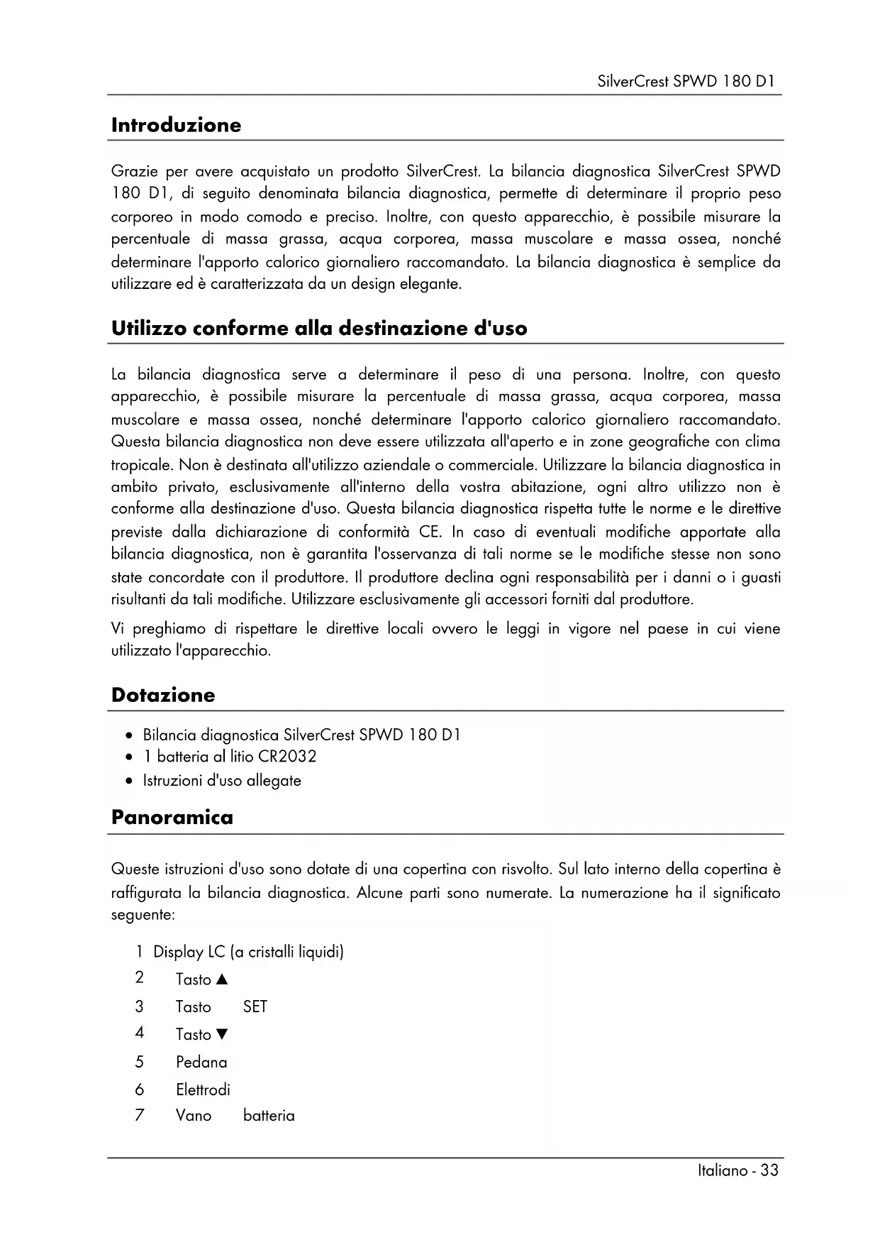 - Informazioni sulla garanzia e sull'assistenza SilverCrest SPWD 180 D1 Italiano - 33 Introduzione Grazie per avere acquistato un prodotto SilverCrest. La bilancia diagnostica SilverCrest SPWD 180 D1, di seguito denominata bilancia diagnostica, permette di determinare il proprio peso corporeo in modo comodo e preciso. Inoltre, con questo apparecchio, è possibile misurare la percentuale di massa grassa, acqua corporea, massa muscolare e massa ossea, nonché determinare l'apporto calorico giornaliero raccomandato. La bilancia diagnostica è semplice da utilizzare ed è caratterizzata da un design elegante. Utilizzo conforme alla destinazione d'uso La bilancia diagnostica serve a determinare il peso di una persona. Inoltre, con questo apparecchio, è possibile misurare la percentuale di massa grassa, acqua corporea, massa muscolare e massa ossea, nonché determinare l'apporto calorico giornaliero raccomandato. Questa bilancia diagnostica non deve essere utilizzata all'aperto e in zone geografiche con clima tropicale. Non è destinata all'utilizzo aziendale o commerciale. Utilizzare la bilancia diagnostica in ambito privato, esclusivamente all'interno della vostra abitazione, ogni altro utilizzo non è conforme alla destinazione d'uso. Questa bilancia diagnostica rispetta tutte le norme e le direttive previste dalla dichiarazione di conformità CE. In caso di eventuali modifiche apportate alla bilancia diagnostica, non è garantita l'osservanza di tali norme se le modifiche stesse non sono state concordate con il produttore. Il produttore declina ogni responsabilità per i danni o i guasti risultanti da tali modifiche. Utilizzare esclusivamente gli accessori forniti dal produttore. Vi preghiamo di rispettare le direttive locali ovvero le leggi in vigore nel paese in cui viene utilizzato l'apparecchio. Dotazione Bilancia diagnostica SilverCrest SPWD 180 D1 1 batteria al litio CR2032 Istruzioni d'uso allegate Panoramica Queste istruzioni d'uso sono dotate di una copertina con risvolto. Sul lato interno della copertina è raffigurata la bilancia diagnostica. Alcune parti sono numerate. La numerazione ha il significato seguente: 1 Display LC (a cristalli liquidi) p. 45