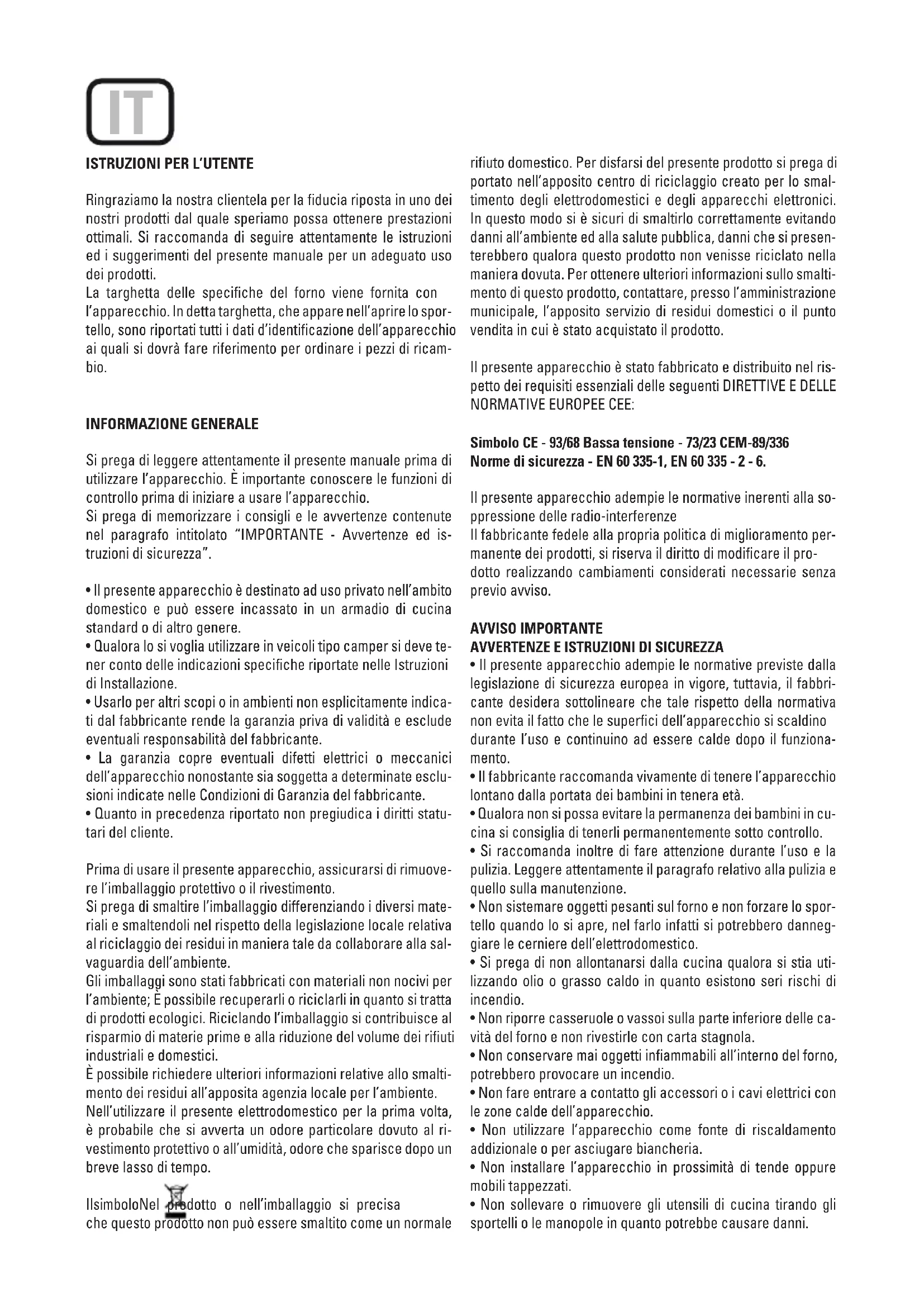 - Qualora lo si voglia utilizzato in veicoli tipo camper si deve tener conto delleindicazioni specifiche riportate nelle Istruzioni di Installazione.