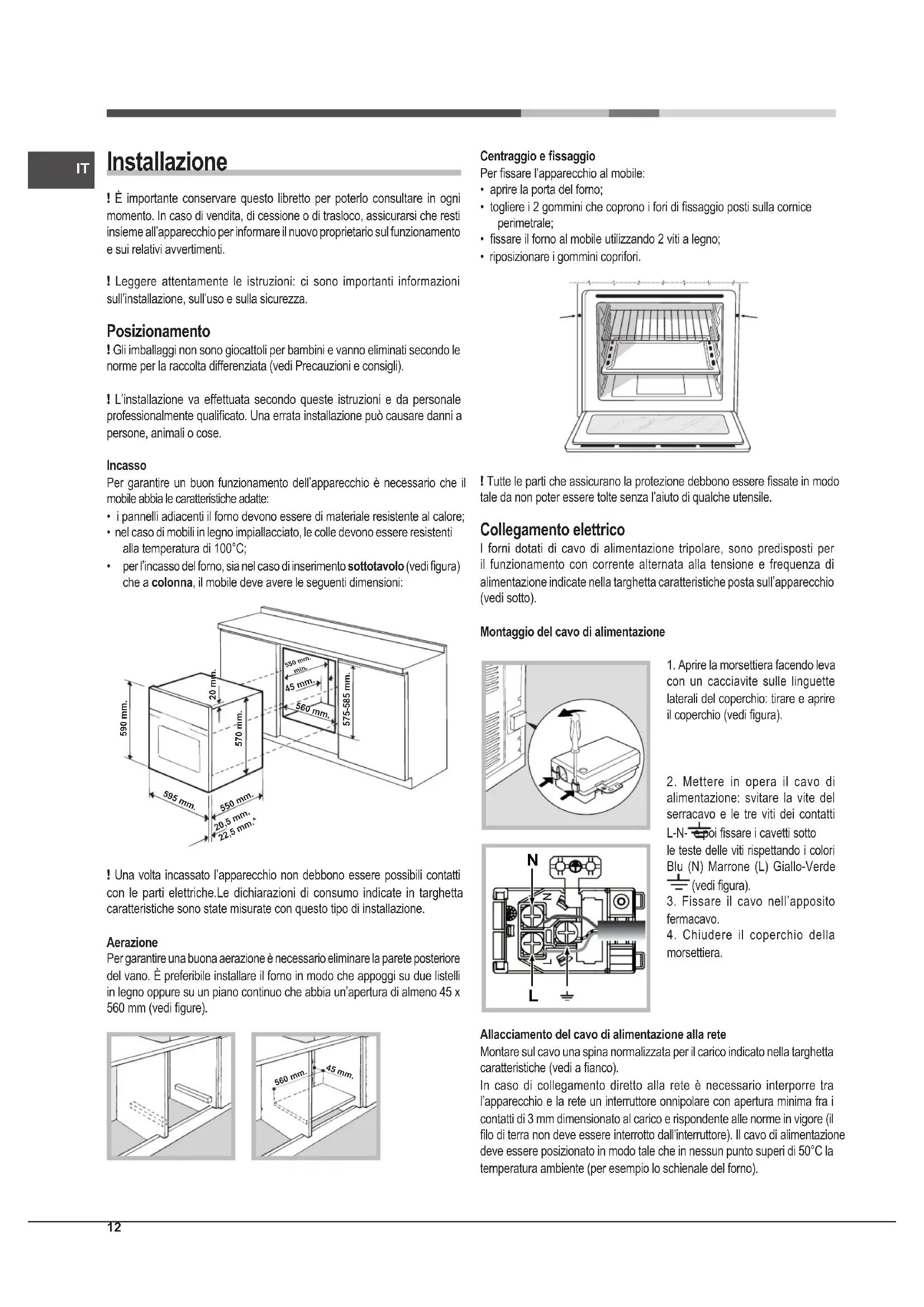 - per l’incasso del forno, sia nel caso di inserimento sottotavolo (vedi gura) che a colonna, il mobile deve avere le seguenti dimensioni: 590 mm. 595 mm.22,5 mm.*20,5 mm.550 mm.570 mm.20 mm.575-585 mm.45 mm.560 mm. 550 mm. min. ! Una volta incassato l’apparecchio non debbono essere possibili contatti con le parti elettriche.Le dichiarazioni di consumo indicate in targhetta caratteristiche sono state misurate con questo tipo di installazione. Aerazione Per garantire una buona aerazione è necessario eliminare la parete posteriore del vano. È preferibile installare il forno in modo che appoggi su due listelli in legno oppure su un piano continuo che abbia un’apertura di almeno 45 x 560 mm (vedi gure). 560 mm. 45 mm. Centraggio e ssaggio Per ssare l’apparecchio al mobile: