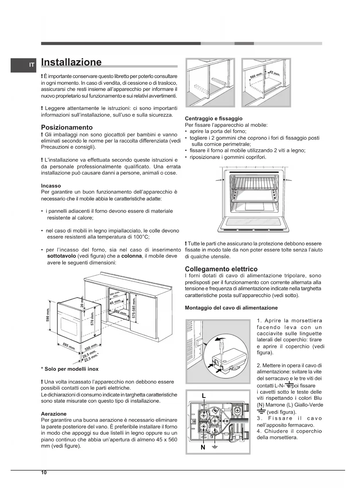- Solo per modelli inox ! Una volta incassato l’apparecchio non debbono essere possibili contatti con le parti elettriche. Le dichiarazioni di consumo indicate in targhetta caratteristiche sono state misurate con questo tipo di installazione. Aerazione Per garantire una buona aerazione è necessario eliminare la parete posteriore del vano. È preferibile installare il forno in modo che appoggi su due listelli in legno oppure su un piano continuo che abbia un’apertura di almeno 45 x 560 mm (vedi gure). 560 mm. 45 mm. Centraggio e ssaggio Per ssare l’apparecchio al mobile: