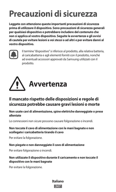 Precauzioni di sicurezza Leggete con attenzione queste importanti precauzioni di sicurezza prima di utilizzare il dispositivo. Sono precauzioni di sicurezza generali per qualsiasi dispositivo e potrebbero includere del contenuto che non si applica al vostro dispositivo. Seguite le avvertenze e gli avvisi di cautela per evitare lesioni a voi stessi o ad altri e per evitare danni al vostro dispositivo. Il termine “dispositivo” si riferisce al prodotto, alla relativa batteria, al caricabatteria e agli elementi forniti con il prodotto, nonché ad eventuali accessori approvati da Samsung utilizzati con il prodotto. Avvertenza Il mancato rispetto delle disposizioni e regole di sicurezza potrebbe causare gravi lesioni o morte Non usate cavi di alimentazione, spine elettriche danneggiate o prese allentate Le connessioni non sicure possono causare folgorazione o incendi. Non toccate il cavo di alimentazione con le mani bagnate e non scollegate i caricabatteria tirando il cavo Per evitare la folgorazione. Non piegate e non danneggiate il cavo di alimentazione Per evitare folgorazione o incendi. Non utilizzate il dispositivo durante il caricamento e non toccate il dispositivo con le mani bagnate Per evitare la folgorazione. Italiano