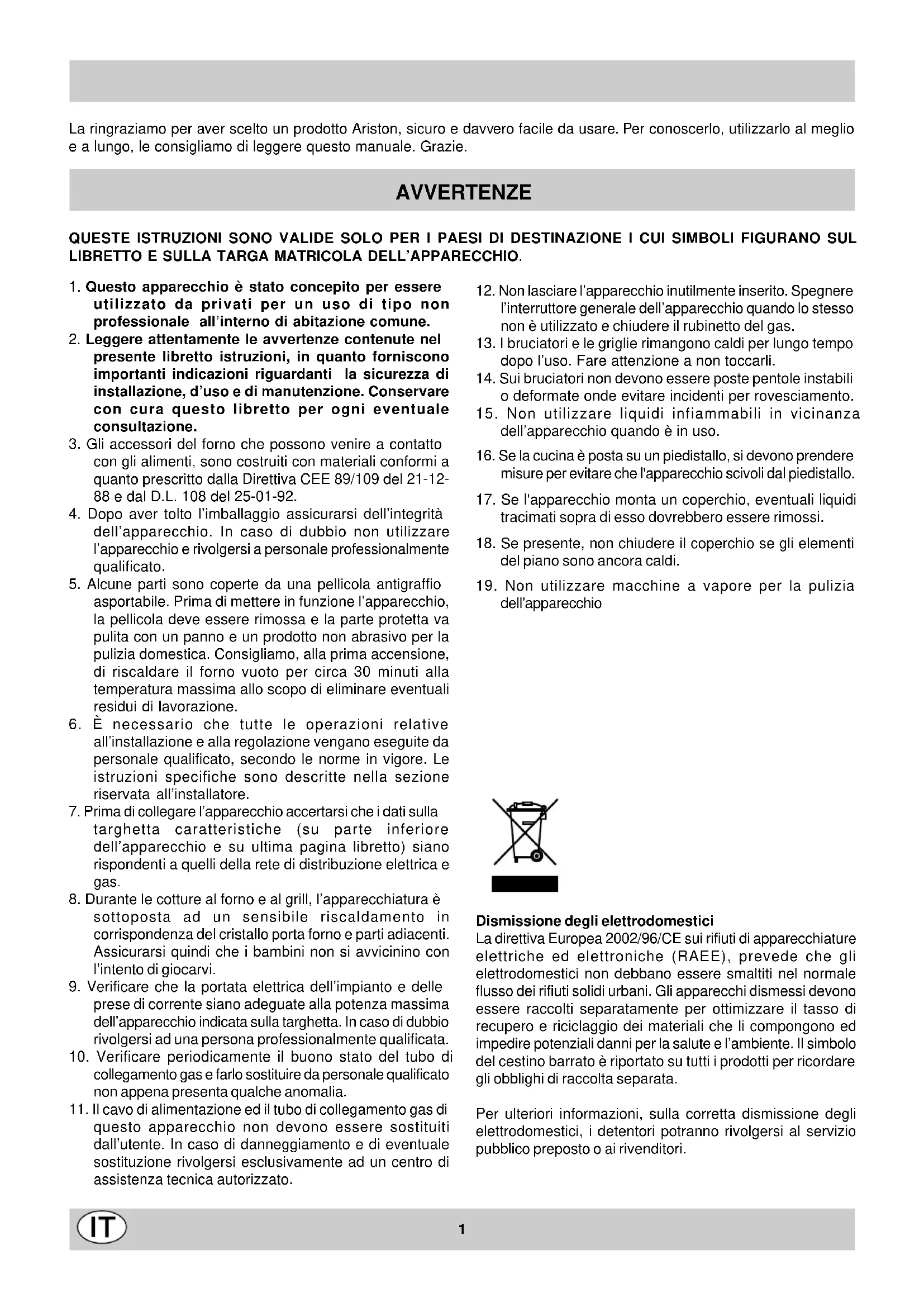 dell'apparecchio Dismissione degli elettrodomestici La direttiva Europea 2002/96/CE sui rifiuti di apparecchiature elettriche ed elettroniche (RAEE), prevede che gli elettrodomestici non debbano essere smaltiti nel normale flusso dei rifiuti solidi urbani. Gli apparecchi dismessi devono essere raccolti separatamente per ottimizzare il tasso di recupero e riciclaggio dei materiali che li compongono ed impedire potenziali danni per la salute e l’ambiente. Il simbolo del cestino barrato è riportato su tutti i prodotti per ricordare gli obblighi di raccolta separata. Per ulteriori informazioni, sulla corretta dismissione degli elettrodomestici, i detentori potranno rivolgersi al servizio pubblico preposto o ai rivenditori.2