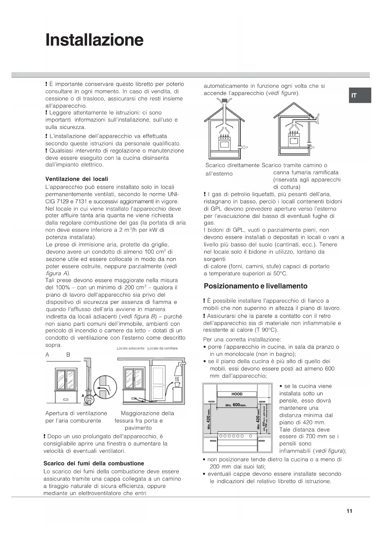 - die Seriennummer (S/N). Letztere Informationen können dem Typenschild, das sich auf dem Gerät befindet, entnommen werden. Kundendienst! È importante conservare questo libretto per poterlo consultare in ogni momento. In caso di vendita, di cessione o di trasloco, assicurarsi che resti insieme all’apparecchio. ! Leggere attentamente le istruzioni: ci sono importanti informazioni sull’installazione, sull’uso e sulla sicurezza. ! L’installazione dell’apparecchio va effettuata secondo queste istruzioni da personale qualificato. ! Qualsiasi intervento di regolazione o manutenzione deve essere eseguito con la cucina disinserita dall’impianto elettrico. Ventilazione dei locali L’apparecchio può essere installato solo in locali permanentemente ventilati, secondo le norme UNI- CIG 7129 e 7131 e successivi aggiornamenti in vigore. Nel locale in cui viene installato l’apparecchio deve poter affluire tanta aria quanta ne viene richiesta dalla regolare combustione del gas (la portata di aria non deve essere inferiore a 2 m