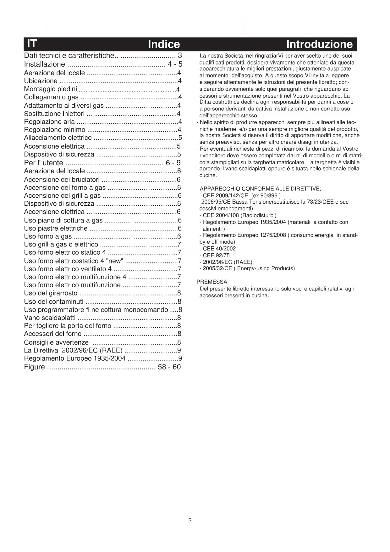 - Libretto istruzioni per l'installazione e l'uso di cucine a gas, miste ed elettriche. Serie: Notice d'installation et d'utilisation des cuisinières à gaz, mixtes et électrique. Séries: Instructions for use and maintenance of gas, gas-electric and electric cookers. Series: Rukovodstvo po ustanovke i `kspluatacii gazovyx, kombinirovannyx i `lektriheskix plit. Serii% Instruções de uso e manutenção de fogões a gás, mistos e eléctricos. Série: √‰ËÁ›Â˜ ÁÈ· ÙË ¯Ú‹ÛË Î·È ÙË Û˘ÓÙ‹ÚËÛË ÎÔ˘˙ÈÓÒÓ ˘ÁÚ·¤Ú›Ô˘, ËÏÂÎÙÚÈÎÒÓ Î·È ÌÈÎÙÒÓ. ªÔÓ٤Ϸ: Instrucciones de uso y mantenimiento de cocinas de gas, mixtas y elé- ctricas. Serie:2 - La nostra Società, nel ringraziarVi per aver scelto uno dei suoi qualifi cati prodotti, desidera vivamente che otteniate da questa apparecchiatura le migliori prestazioni, giustamente auspicate al momento dell’acquisto. A questo scopo Vi invita a leggere e seguire attentamente le istruzioni del presente libretto; con- siderando ovviamente solo quei paragrafi che riguardano ac- cessori e strumentazione presenti nel Vostro apparecchio. La Ditta costruttrice declina ogni responsabilità per danni a cose o a persone derivanti da cattiva installazione o non corretto uso dell’apparecchio stesso. - Nello spirito di produrre apparecchi sempre più allineati alle tec- niche moderne, e/o per una sempre migliore qualità del prodotto, la nostra Società si riserva il diritto di apportare modifi che, anche senza preavviso, senza per altro creare disagi in utenza. - Per eventuali richieste di pezzi di ricambio, la domanda al Vostro rivenditore deve essere completata dal n° di modell o e n° di matri- cola stampigliati sulla targhetta matricolare. La targhetta è visibile aprendo il vano scaldapiatti oppure è situata nello schienale della cucine. - APPARECCHIO CONFORME ALLE DIRETTIVE: - CEE 2009/142/CE (ex 90/396 ) - 2006/95/CE Bassa Tensione(sostituisce la 73/23/CEE e suc- cessivi emendamenti) - CEE 2004/108 (Radiodisturbi) - Regolamento Europeo 1935/2004 (materiali a contatto con alimenti ) - Regolamento Europeo 1275/2008 ( consumo energia in stand- by e off-mode) - CEE 40/2002 - CEE 92/75 - 2002/96/EC (RAEE) - 2005/32/CE ( Energy-using Products) PREMESSA - Del presente libretto interessano solo voci e capitoli relativi agli accessori presenti in cucina. Dati tecnici e caratteristiche p. 3