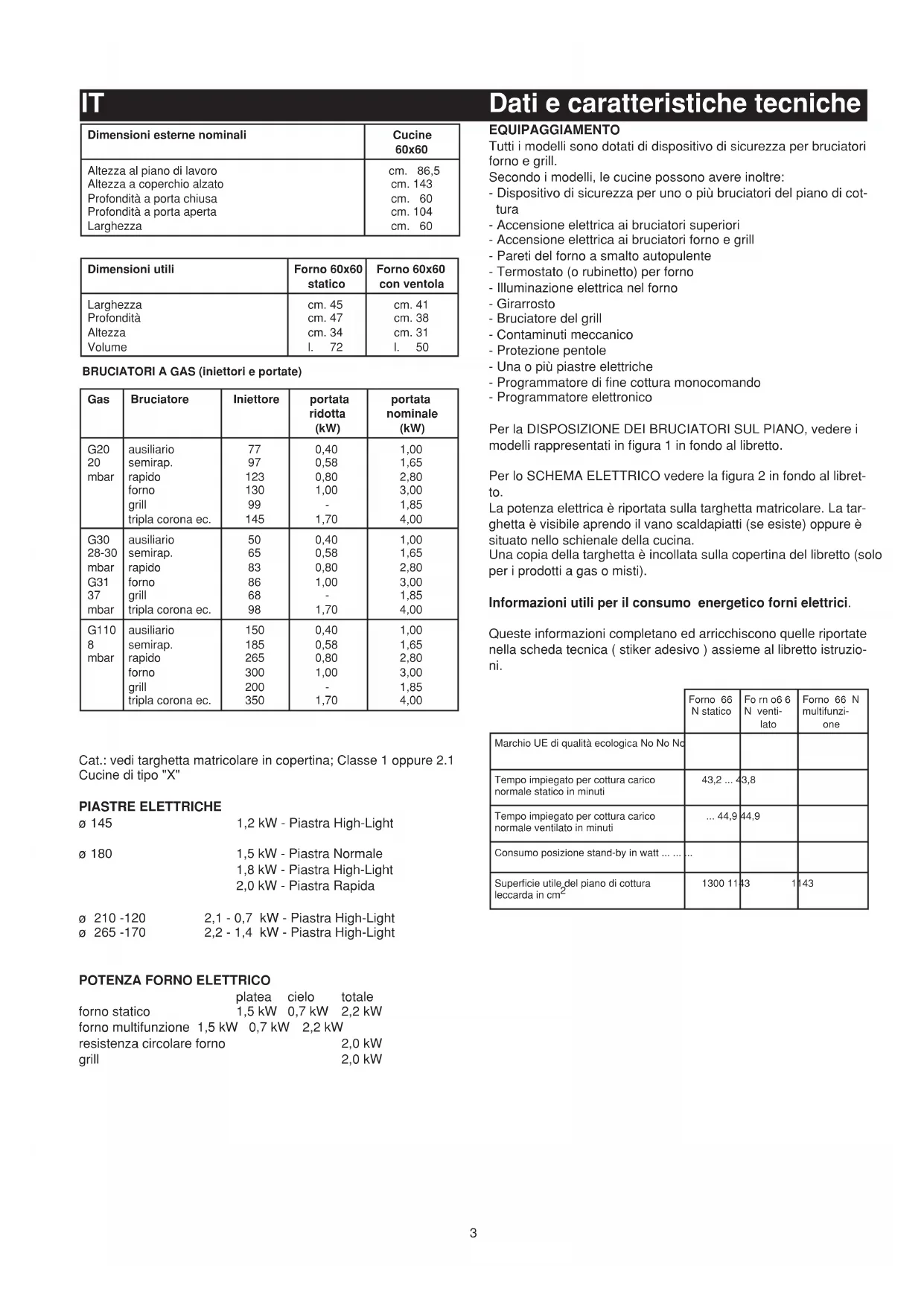 - La nostra Società, nel ringraziarVi per aver scelto uno dei suoi qualificati prodotti, desidera vivamente che otteniate da questa apparecchiatura le migliori prestazioni, giustamente auspicate al momento dell’acquisto. A questo scopo Vi invita a leggere e seguire attentamente le istruzioni del presente libretto; con- siderando ovviamente solo quei paragrafi che riguardano ac- cessori e strumentazione presenti nel Vostro apparecchio. La Ditta costruttrice declina ogni responsabilità per danni a cose o a persone derivanti da cattiva installazione o non corretto uso dell’apparecchio stesso. - Nello spirito di produrre apparecchi sempre più allineati alle tec- niche moderne, e/o per una sempre migliore qualità del prodotto, la nostra Società si riserva il diritto di apportare modifiche, anche senza preavviso, senza per altro creare disagi in utenza. - Per eventuali richieste di pezzi di ricambio, la domanda al Vostro rivenditore deve essere completata dal n° di modello e n° di matricola stampigliati sulla targhetta matricolare. La targhetta è visibile aprendo il vano scaldapiatti (se esiste) oppure è situato nello schienale della cucine. - APPARECCHIO CONFORME ALLE DIRETTIVE: - CEE 2009/142/CE (ex 90/396 ) - 2006/95/CE Bassa Tensione(sostituisce la 73/23/CEE e suc- cessivi emendamenti) - CEE 2004/108 (Radiodisturbi) - Regolamento Europeo 1935/2004 (materiali a contatto con alimenti ) - Regolamento Europeo 1275/2008 ( consumo energia in stand-by e off-mode) - CEE 40/2002 - CEE 92/75 - 2002/96/EC (RAEE) - 2005/32/CE ( Energy-using Products) PREMESSA - Del presente libretto interessano solo voci e capitoli relativi agli accessori presenti in cucina.3 EQUIPAGGIAMENTO Tutti i modelli sono dotati di dispositivo di sicurezza per bruciatori forno e grill. Secondo i modelli, le cucine possono avere inoltre: - Dispositivo di sicurezza per uno o più bruciatori del piano di cot- tura - Accensione elettrica ai bruciatori superiori - Accensione elettrica ai bruciatori forno e grill - Pareti del forno a smalto autopulente - Termostato (o rubinetto) per forno - Illuminazione elettrica nel forno - Girarrosto - Bruciatore del grill - Contaminuti meccanico - Protezione pentole - Una o più piastre elettriche - Programmatore di fine cottura monocomando - Programmatore elettronico Per la DISPOSIZIONE DEI BRUCIATORI SUL PIANO, vedere i modelli rappresentati in figura 1 in fondo al libretto. Per lo SCHEMA ELETTRICO vedere la figura 2 in fondo al libret- to. La potenza elettrica è riportata sulla targhetta matricolare. La tar- ghetta è visibile aprendo il vano scaldapiatti (se esiste) oppure è situato nello schienale della cucina. Una copia della targhetta è incollata sulla copertina del libretto (solo per i prodotti a gas o misti). Informazioni utili per il consumo energetico forni elettrici. Queste informazioni completano ed arricchiscono quelle riportate nella scheda tecnica ( stiker adesivo ) assieme al libretto istruzio- ni. Forno 66 N statico Fo rn o6 6 N venti- lato Forno 66 N multifunzi- one Marchio UE di qualità ecologica No No No Tempo impiegato per cottura carico normale statico in minuti 43,2 ... 43,8 Tempo impiegato per cottura carico normale ventilato in minuti ... 44,9 44,9 Consumo posizione stand-by in watt ... ... ... Superficie utile del piano di cottura leccarda in cm