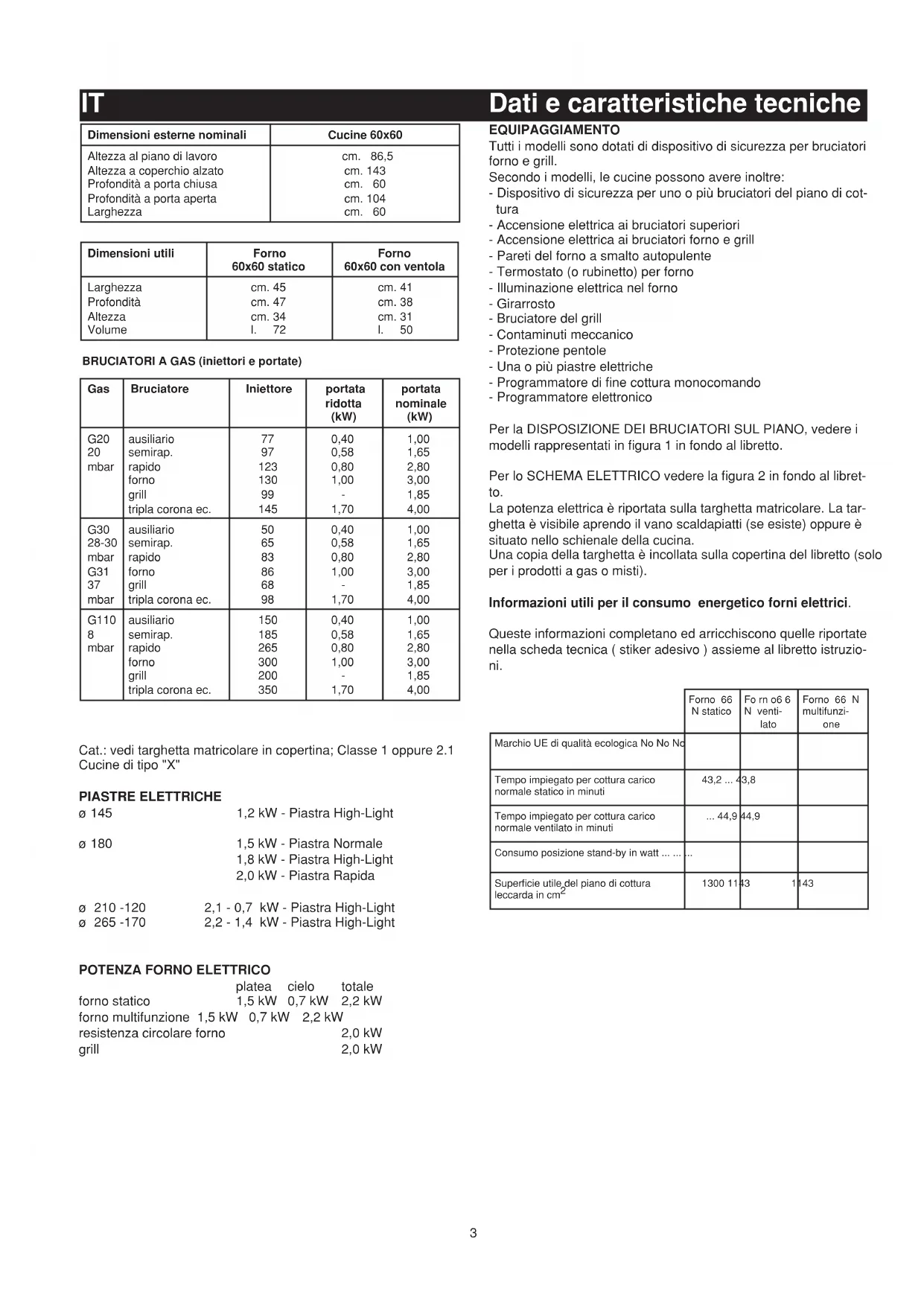 platea cielo totale forno statico 1,5 kW 0,7 kW 2,2 kW forno multifunzione 1,5 kW 0,7 kW 2,2 kW resistenza circolare forno 2,0 kW grill 2,0 kW BRUCIATORI A GAS (iniettori e portate) Dimensioni esterne nominali Cucine 60x60 Altezza al piano di lavoro Altezza a coperchio alzato Profondità a porta chiusa Profondità a porta aperta Larghezza cm. 86,5 cm. 143 cm. 60 cm. 104 cm. 60 Dimensioni utili Forno 60x60 statico Forno 60x60 con ventola Larghezza Profondità Altezza Volume cm. 45 cm. 47 cm. 34 l. 72 cm. 41 cm. 38 cm. 31 l. 50 Gas Bruciatore Iniettore portata ridotta (kW) portata nominale (kW) G20