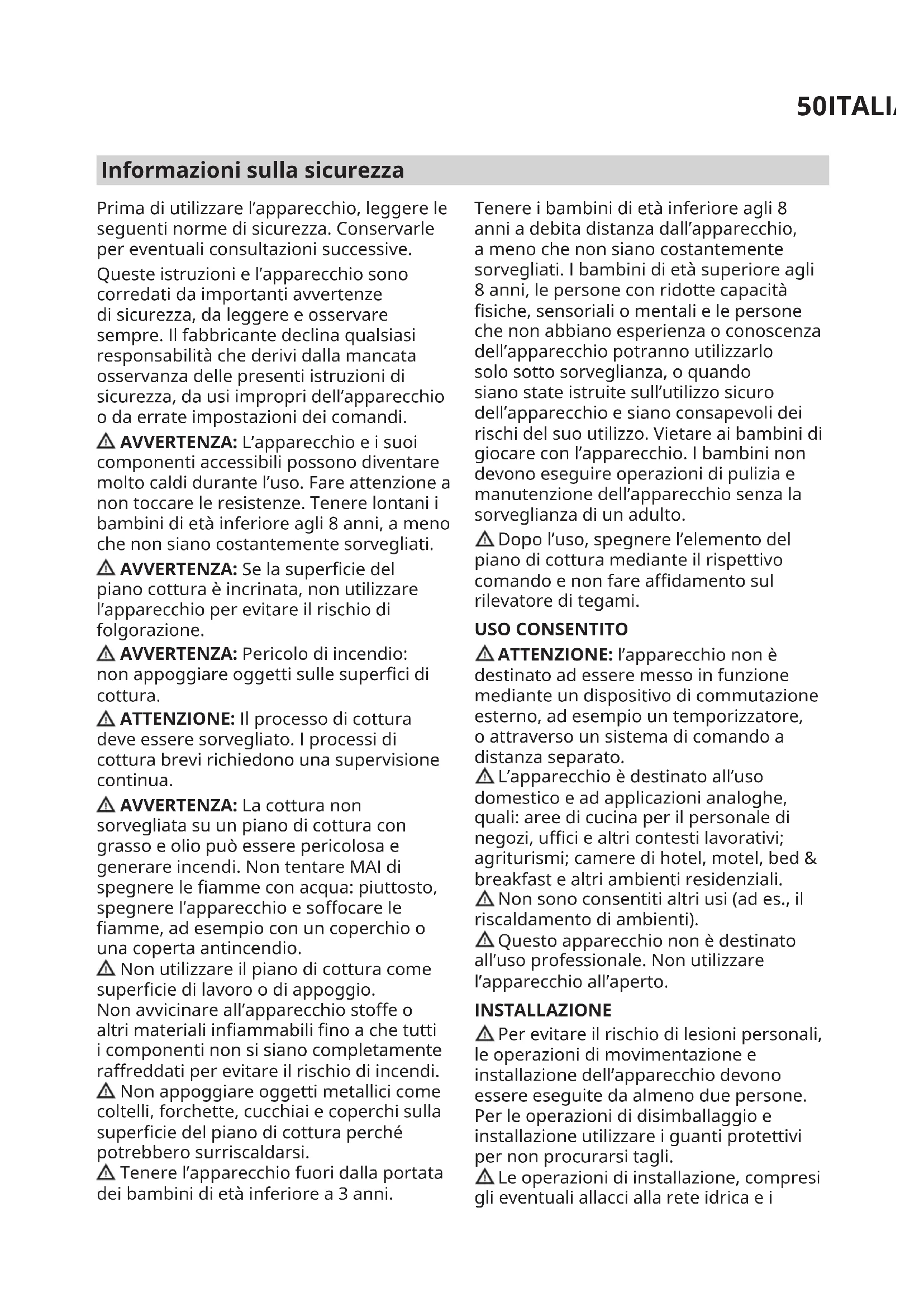 Informazioni sulla sicurezza Prima di utilizzare l’apparecchio, leggere le seguenti norme di sicurezza. Conservarle per eventuali consultazioni successive. Queste istruzioni e l’apparecchio sono corredati da importanti avvertenze di sicurezza, da leggere e osservare sempre. Il fabbricante declina qualsiasi responsabilità che derivi dalla mancata osservanza delle presenti istruzioni di sicurezza, da usi impropri dell’apparecchio o da errate impostazioni dei comandi. AVVERTENZA: L’apparecchio e i suoi componenti accessibili possono diventare molto caldi durante l’uso. Fare attenzione a non toccare le resistenze. Tenere lontani i bambini di età inferiore agli 8 anni, a meno che non siano costantemente sorvegliati. AVVERTENZA: Se la supercie del piano cottura è incrinata, non utilizzare l’apparecchio per evitare il rischio di folgorazione. AVVERTENZA: Pericolo di incendio: non appoggiare oggetti sulle superci di cottura. ATTENZIONE: Il processo di cottura deve essere sorvegliato. I processi di cottura brevi richiedono una supervisione continua. AVVERTENZA: La cottura non sorvegliata su un piano di cottura con grasso e olio può essere pericolosa e generare incendi. Non tentare MAI di spegnere le amme con acqua: piuttosto, spegnere l’apparecchio e soocare le amme, ad esempio con un coperchio o una coperta antincendio. Non utilizzare il piano di cottura come supercie di lavoro o di appoggio. Non avvicinare all’apparecchio stoe o altri materiali inammabili no a che tutti i componenti non si siano completamente rareddati per evitare il rischio di incendi. Non appoggiare oggetti metallici come coltelli, forchette, cucchiai e coperchi sulla supercie del piano di cottura perché potrebbero surriscaldarsi. Tenere l’apparecchio fuori dalla portata dei bambini di età inferiore a 3 anni. Tenere i bambini di età inferiore agli 8 anni a debita distanza dall’apparecchio, a meno che non siano costantemente sorvegliati. I bambini di età superiore agli 8 anni, le persone con ridotte capacità siche, sensoriali o mentali e le persone che non abbiano esperienza o conoscenza dell’apparecchio potranno utilizzarlo solo sotto sorveglianza, o quando siano state istruite sull’utilizzo sicuro dell’apparecchio e siano consapevoli dei rischi del suo utilizzo. Vietare ai bambini di giocare con l’apparecchio. I bambini non devono eseguire operazioni di pulizia e manutenzione dell’apparecchio senza la sorveglianza di un adulto. Dopo l’uso, spegnere l’elemento del piano di cottura mediante il rispettivo comando e non fare adamento sul rilevatore di tegami. USO CONSENTITO ATTENZIONE: l’apparecchio non è destinato ad essere messo in funzione mediante un dispositivo di commutazione esterno, ad esempio un temporizzatore, o attraverso un sistema di comando a distanza separato. L’apparecchio è destinato all’uso domestico e ad applicazioni analoghe, quali: aree di cucina per il personale di negozi, uci e altri contesti lavorativi; agriturismi; camere di hotel, motel, bed & breakfast e altri ambienti residenziali. Non sono consentiti altri usi (ad es., il riscaldamento di ambienti). Questo apparecchio non è destinato all’uso professionale. Non utilizzare l’apparecchio all’aperto. INSTALLAZIONE Per evitare il rischio di lesioni personali, le operazioni di movimentazione e installazione dell’apparecchio devono essere eseguite da almeno due persone. Per le operazioni di disimballaggio e installazione utilizzare i guanti protettivi per non procurarsi tagli. Le operazioni di installazione, compresi gli eventuali allacci alla rete idrica e i51ITALIANO collegamenti elettrici, e gli interventi di riparazione devono essere eseguiti da personale qualicato. Non riparare o sostituire qualsiasi parte dell’apparecchio se non espressamente richiesto nel manuale d’uso. Tenere i bambini a distanza dal luogo dell’installazione. Dopo aver disimballato l’apparecchio, assicurarsi che non sia stato danneggiato durante il trasporto. In caso di problemi, contattare il rivenditore o il Servizio Assistenza più vicino. A installazione completata, conservare il materiale di imballaggio (parti in plastica, polistirolo, ecc.) fuori della portata dei bambini per evitare potenziali rischi di soocamento. Per evitare rischi di scosse elettriche, prima di procedere all’installazione scollegare l’apparecchio dalla rete elettrica. Durante l’installazione, accertarsi che l’apparecchio non possa danneggiare il cavo di alimentazione e causare così rischi di scosse elettriche. Attivare l’apparecchio solo dopo avere completato la procedura di installazione. Eseguire tutte le operazioni di taglio del mobile prima di inserire l’apparecchio, avendo cura di rimuovere trucioli e residui di segatura. Se l’apparecchio non è installato sopra un forno, è necessario installare un pannello divisorio (non in dotazione) nel vano sottostante. AVVERTENZE ELETTRICHE Deve essere possibile scollegare l’apparecchio dalla rete elettrica disinserendo la spina, se questa è accessibile, o tramite un interruttore multipolare installato a monte della presa nel rispetto dei regolamenti elettrici vigenti; inoltre, l’apparecchio deve essere messo a terra in conformità alle norme di sicurezza elettrica nazionali. Non utilizzare cavi di prolunga, prese multiple o adattatori. Una volta terminata l’installazione, i componenti elettrici non devono più essere accessibili. Non utilizzare l’apparecchio quando si è bagnati oppure a piedi nudi. Non accendere l’apparecchio se il cavo di alimentazione o la spina sono danneggiati, se si osservano anomalie di funzionamento o se l’apparecchio è caduto o è stato danneggiato. Se il cavo di alimentazione è danneggiato, deve essere sostituito con uno dello stesso tipo dal produttore, da un centro di assistenza autorizzato o da un tecnico qualicato per evitare situazioni di pericolo o rischi di scosse elettriche. NOTA: Si raccomanda ai portatori di pacemaker o di analo