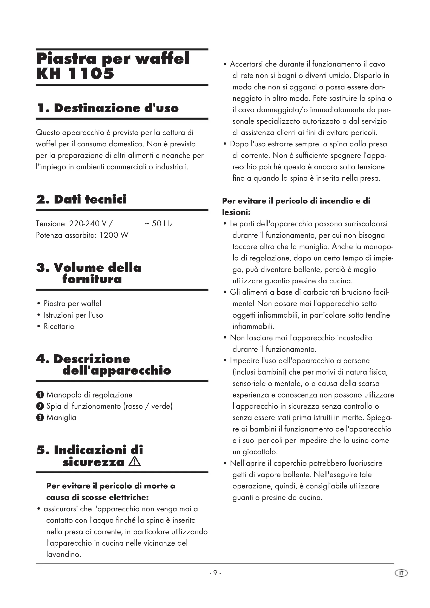 - Nell'aprire il coperchio potrebbero fuoriuscire getti di vapore bollente. Nell'eseguire tale operazione, quindi, è consigliabile utilizzare guanti o presine da cucina. IB_KH1105_E167_LB1 18.09.2007 16:21 Uhr Seite 9- 10 -
