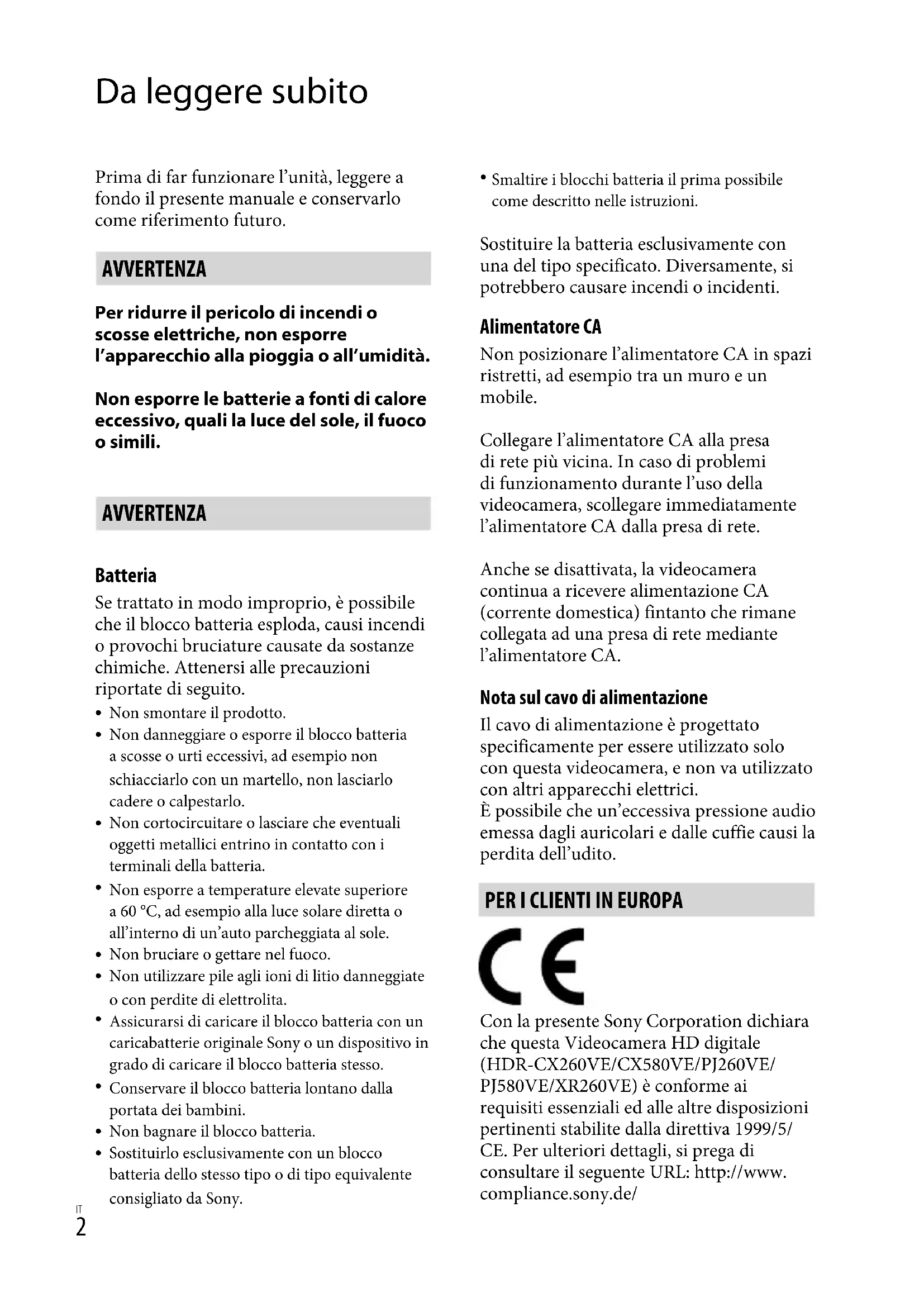 Da leggere subito Prima di far funzionare l’unità, leggere a fondo il presente manuale e conservarlo come riferimento futuro. AVVERTENZA Per ridurre il pericolo di incendi o scosse elettriche, non esporre l’apparecchio alla pioggia o all’umidità. Non esporre le batterie a fonti di calore eccessivo, quali la luce del sole, il fuoco o simili. AVVERTENZA Batteria Se trattato in modo improprio, è possibile che il blocco batteria esploda, causi incendi o provochi bruciature causate da sostanze chimiche. Attenersi alle precauzioni riportate di seguito. Non smontare il prodotto.Non danneggiare o esporre il blocco batteria a scosse o urti eccessivi, ad esempio non schiacciarlo con un martello, non lasciarlo cadere o calpestarlo.Non cortocircuitare o lasciare che eventuali oggetti metallici entrino in contatto con i terminali della batteria.Non esporre a temperature elevate superiore a 60 °C, ad esempio alla luce solare diretta o all’interno di un’auto parcheggiata al sole.Non bruciare o gettare nel fuoco.Non utilizzare pile agli ioni di litio danneggiate o con perdite di elettrolita.Assicurarsi di caricare il blocco batteria con un caricabatterie originale Sony o un dispositivo in grado di caricare il blocco batteria stesso.Conservare il blocco batteria lontano dalla portata dei bambini.Non bagnare il blocco batteria.Sostituirlo esclusivamente con un blocco batteria dello stesso tipo o di tipo equivalente consigliato da Sony.