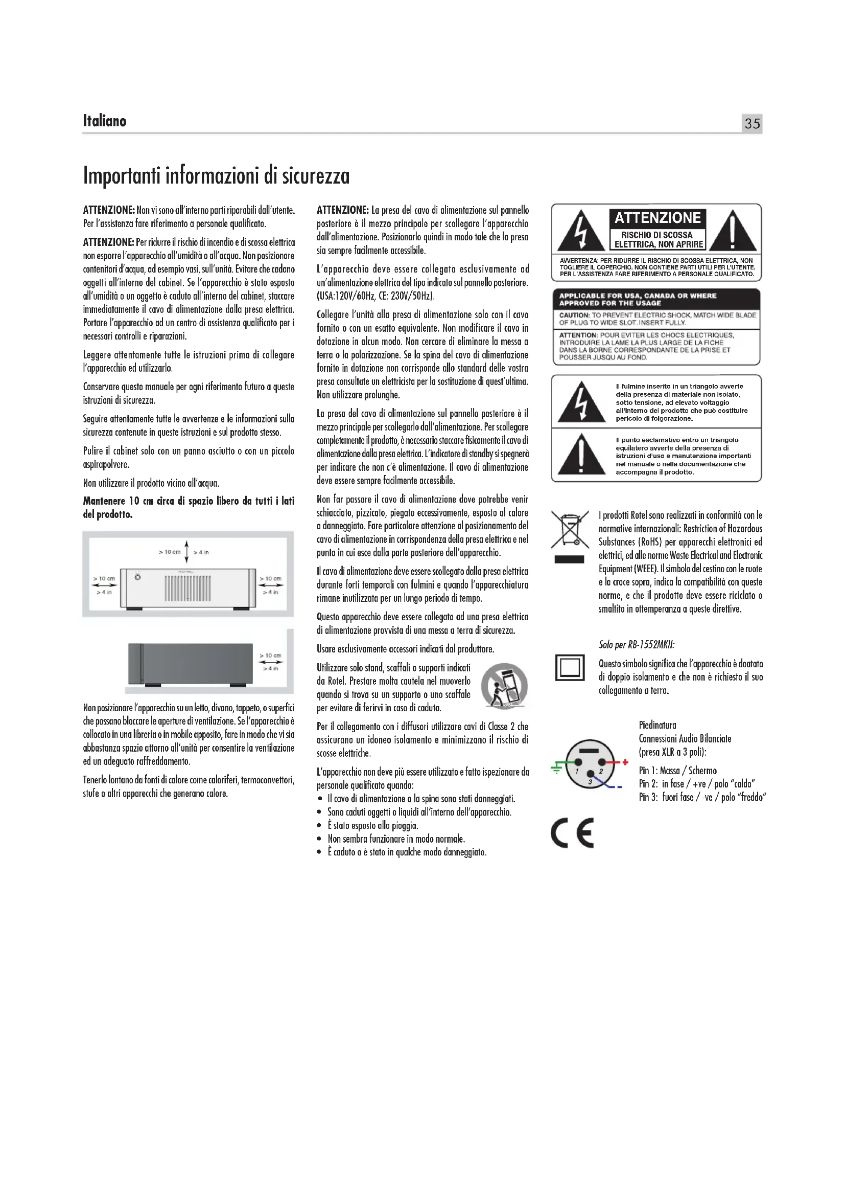 - Piedinatura Connessioni Audio Bilanciate (presa XLR a 3 poli): Pin 1: Massa / Schermo Pin 2: in fase / +ve / polo “caldo” Pin 3: fuori fase / -ve / polo “freddo” ATTENZIONE RISCHIO DI SCOSSA ELETTRICA, NON APRIREAVVERTENZA: PER RIDURRE IL RISCHIO DI SCOSSA ELETTRICA, NON TOGLIERE IL COPERCHIO. NON CONTIENE PARTI UTILI PER L’UTENTE. PER L’ASSISTENZA FARE RIFERIMENTO A PERSONALE QUALIFICATO.Il fulmine inserito in un triangolo avverte della presenza di materiale non isolato, sotto tensione, ad elevato voltaggio all'interno del prodotto che può costituire pericolo di folgorazione.Il punto esclamativo entro un triangolo equilatero avverte della presenza di istruzioni d’uso e manutenzione importanti nel manuale o nella documentazione che accompagna il prodotto.36 RB-1552MKII/RB-1582MKII Amplicatori nali stereo Alcune informazioni su Rotel La nostra storia ha avuto inizio quasi 50 anni fa. Nel corso del tempo abbiamo ricevuto centinaia di riconoscimenti per la qualità dei nostri prodotti e soddisfatto centinaia di migliaia di audiofili ed amanti della musica. Proprio come voi! Rotel è stata fondata da una famiglia la cui passione per la musica ha portato alla realizzazione di componenti alta fedeltà di qualità senza compromessi. Attraverso gli anni questa passione non si è affievolita e l’obbiettivo di realizzare apparecchi di straordinario valore per veri audiofili, indipendentemente dal loro budget, continua ad essere condiviso da tutti coloro che vi lavorano. I nostri progettisti operano in stretto contatto tra loro ascoltando ed affinando ogni nuovo prodotto fino a raggiungere determinati standard qualitativi. Viene loro offerta una totale libertà di scelta sui componenti per ottenere le migliori prestazioni possibili. Non è raro quindi trovare in un Rotel condensatori di fabbricazione inglese o tedesca, semiconduttori giapponesi o americani, con la sola eccezione dei trasformatori di alimentazione, prodotti come tradizione nelle nostre fabbriche. Noi tutti abbiamo a cuore i temi dell’ambiente. Pensando che al termine della loro vita operativa gli apparecchi elettronici verranno dismessi, è molto importante per un costruttore responsabile fare tutto il possibile affinché abbiano un impatto ambientale il più possibile ridotto. Alla Rotel siamo orgogliosi di fare la nostra parte riducendo il contenuto di piombo nei nostri apparecchi rispettando rigorosamente la normativa RoHS. Inoltre abbiamo sviluppato amplificatori finali in Classe D (non digitale) fino a cinque volte più efficienti rispetto ai modelli tradizionali a parità di potenza e prestazioni. Questi modelli non producono calore durante il funzionamento, dissipando quindi pochissima energia ed offrono un suono perfino migliore. Da ultimo poi, abbiamo stampato queste pagine su carta riciclata. Certamente si tratta di piccoli passi, ma importanti perché nella giusta direzione. Ed è nostra intenzione proseguire, cercando di migliorare i processi produttivi ed utilizzare materiali sempre più rispettosi dell’ambiente. Noi tutti di Rotel vi ringraziamo per aver acquistato questo prodotto che, siamo sicuri, vi accompagnerà per molti anni di puro divertimento e soddisfazione. Considerazioni sulla potenza d’uscita La potenza d’uscita dell’RB-1552MKII è pari a 130 watt continui per canale, quella dell’RB-1582MKII a 200 watt continui per canale. Per entrambi i modelli, il dato è riferito al funzionamento in contemporanea di tutti i canali alla massima potenza. Rotel ha scelto di specificare i valori di potenza in questa maniera poiché, sulla base della propria esperienza, essa riflette meglio l’effettiva, reale capacità di erogazione di un amplificatore. Quando si comparano le caratteristiche tecniche di prodotti di varie marche è necessario tenere presente che il dato della potenza può essere dichiarato secondo altri criteri, spesso non così rigorosi. Ad esempio, la potenza massima può essere dichiarata con un solo canale in funzione ed il dato che ne risulta è solitamente maggiore. L’impedenza nominale di un diffusore poi indica il carico che l’amplificatore trova ai suoi terminali d’uscita, normalmente 4 oppure 8 ohm. Più è bassa, più potenza richiede il diffusore. In effetti un diffusore da 4 ohm necessita di una potenza doppia rispetto ad uno da 8 ohm. Gli amplificatori Rotel sono progettati per lavorare con ogni diffusore di impedenza nominale compresa tra 4 e 8 ohm e con tutti i canali in funzione alla massima potenza. Dal momento che ogni progetto è ottimizzato per utilizzare contemporaneamente tutti i canali a disposizione, Rotel è in grado di indicare la vera potenza sempre disponibile all’uscita di ogni canale. Ciò può essere importante anche per il vostro divertimento. Guardando un film, ad esempio, è bello sapere di poter contare su un amplificatore capace di erogare tutta la sua potenza su ogni canale nello stesso istante, specialmente nel caso vi fossero da riprodurre gli effetti di un vulcano in piena eruzione! Per Cominciare Grazie per aver acquistato l’amplificatore finale stereo Rotel RB-1552MKII o RB-1582MKII. Utilizzato in un sistema di riproduzione musicale oppure in un impianto home theatre di qualità vi garantirà numerosi anni di gradevole intrattenimento. Sommario Figura 1: Controlli e connessioni 3 Figura 2: Collegamenti ingressi analogici ed uscite diffusori 4 Figura 3: Ingressi analogici bilanciati (XLR) 5 Note importanti 6 Importanti informazioni di sicurezza p. 35