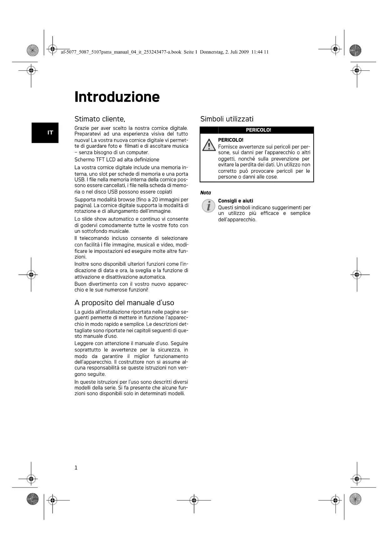 Grazie per aver scelto la nostra cornice digitale. Preparatevi ad una esperienza visiva del tutto nuova! La nostra nuova cornice digitale vi permette di guardare fot e filmati e di ascoltare musica -enza bisogno di un computer.