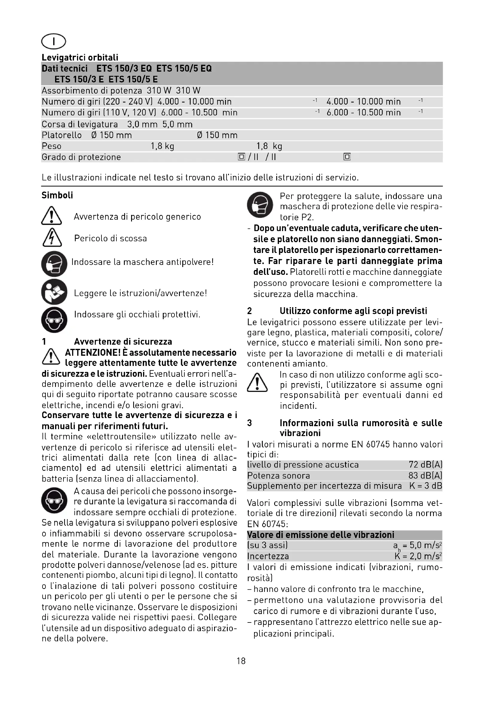 Corsa di levigatura 3,0 mm 5,0 mm Platorello Ø 150 mm Ø 150 mm Peso 1,8 kg 1,8 kg Grado di protezione / II / II Le illustrazioni indicate nel testo si trovano all’inizio delle istruzioni di servizio. Simboli Avvertenza di pericolo generico Pericolo di scossa Indossare la maschera antipolvere! Leggere le istruzioni/avvertenze! Indossare gli occhiali protettivi. 1 Avvertenze di sicurezza ATTENZIONE! È assolutamente necessario leggere attentamente tutte le avvertenze di sicurezza e le istruzioni. Eventuali errori nell’a- dempimento delle avvertenze e delle istruzioni qui di seguito riportate potranno causare scosse elettriche, incendi e/o lesioni gravi. Conservare tutte le avvertenze di sicurezza e i manuali per riferimenti futuri. Il termine «elettroutensile» utilizzato nelle av- vertenze di pericolo si riferisce ad utensili elet- trici alimentati dalla rete (con linea di allac- ciamento) ed ad utensili elettrici alimentati a batteria (senza linea di allacciamento). A causa dei pericoli che possono insorge- re durante la levigatura si raccomanda di indossare sempre occhiali di protezione. Se nella levigatura si sviluppano polveri esplosive o infi ammabili si devono osservare scrupolosa- mente le norme di lavorazione del produttore del materiale. Durante la lavorazione vengono prodotte polveri dannose/velenose (ad es. pitture contenenti piombo, alcuni tipi di legno). Il contatto o l’inalazione di tali polveri possono costituire un pericolo per gli utenti o per le persone che si trovano nelle vicinanze. Osservare le disposizioni di sicurezza valide nei rispettivi paesi. Collegare l’utensile ad un dispositivo adeguato di aspirazio- ne della polvere. Per proteggere la salute, indossare una maschera di protezione delle vie respira- torie P2. - Dopo un’eventuale caduta, verifi care che uten- sile e platorello non siano danneggiati. Smon- tare il platorello per ispezionarlo correttamen- te. Far riparare le parti danneggiate prima dell’uso. Platorelli rotti e macchine danneggiate possono provocare lesioni e compromettere la sicurezza della macchina. 2 Utilizzo conforme agli scopi previsti Le levigatrici possono essere utilizzate per levi- gare legno, plastica, materiali compositi, colore/ vernice, stucco e materiali simili. Non sono pre- viste per la lavorazione di metalli e di materiali contenenti amianto. In caso di non utilizzo conforme agli sco- pi previsti, l’utilizzatore si assume ogni responsabilità per eventuali danni ed incidenti. 3 Informazioni sulla rumorosità e sulle vibrazioni I valori misurati a norme EN 60745 hanno valori tipici di: livello di pressione acustica 72 dB(A) Potenza sonora 83 dB(A) Supplemento per incertezza di misura K = 3 dB Valori complessivi sulle vibrazioni (somma vet- toriale di tre direzioni) rilevati secondo la norma EN 60745: Valore di emissione delle vibrazioni (su 3 assi) a