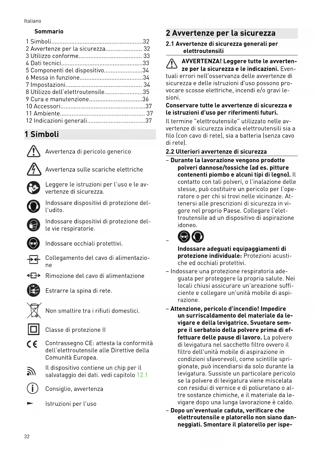 – Durante la lavorazione vengono prodotte polveri dannose/tossiche (ad es. pitture contenenti piombo e alcuni tipi di legno). Il contatto con tali polveri, o l’inalazione delle stesse, può costituire un pericolo per l’ope ratore o per chi si trovi nelle vicinanze. At tenersi alle prescrizioni di sicurezza in vi gore nel proprio Paese. Collegare l'elet troutensile ad un dispositivo di aspirazione idoneo.